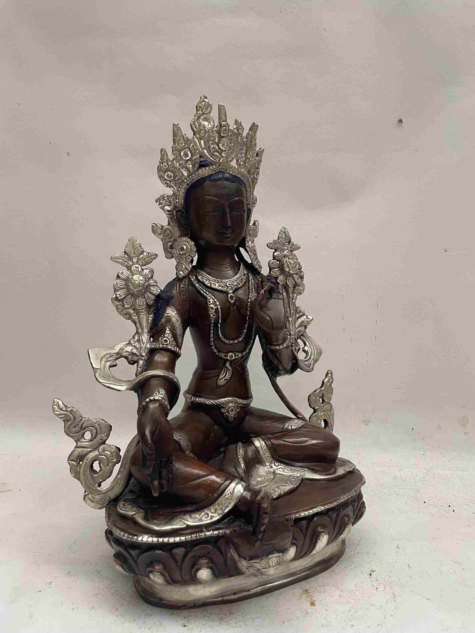 Buddhist Handmade Statue of Green Tara, Chocolate and Silver Oxidized , Goddess of Compassion, Protection, and Swift Action