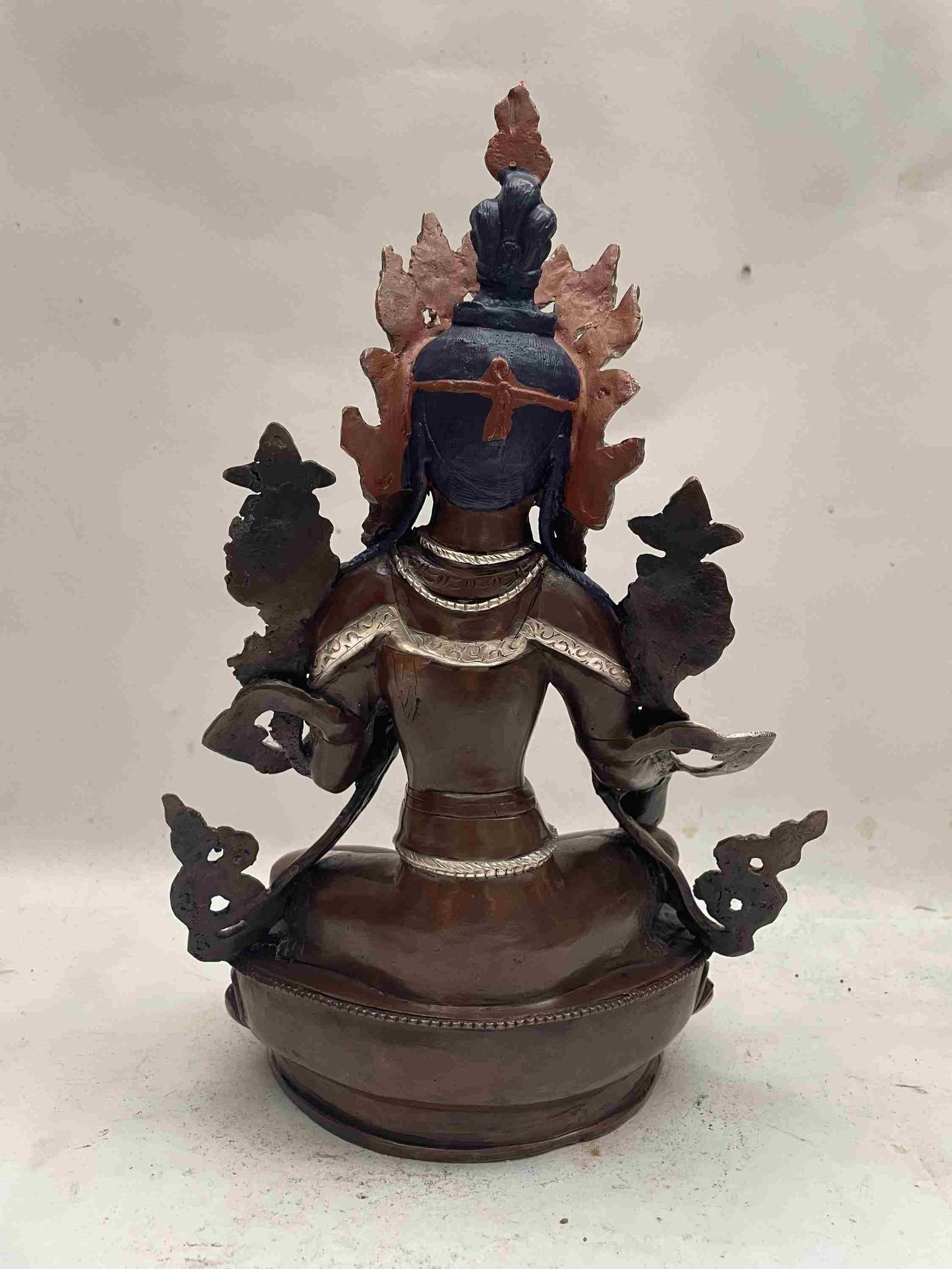 The Green Tara features a captivating combination of partly silver plating and dark oxidation. This unique finishing technique combines the lustrous shine of silver with the rich, deep tones achieved through oxidation. In the process of creating this finish, selected areas of the Green Tara are expertly silver-plated, creating a radiant and reflective surface that catches the light. The remaining areas are intentionally oxidized, resulting in a darkened patina that adds depth and character to the piece. Read More