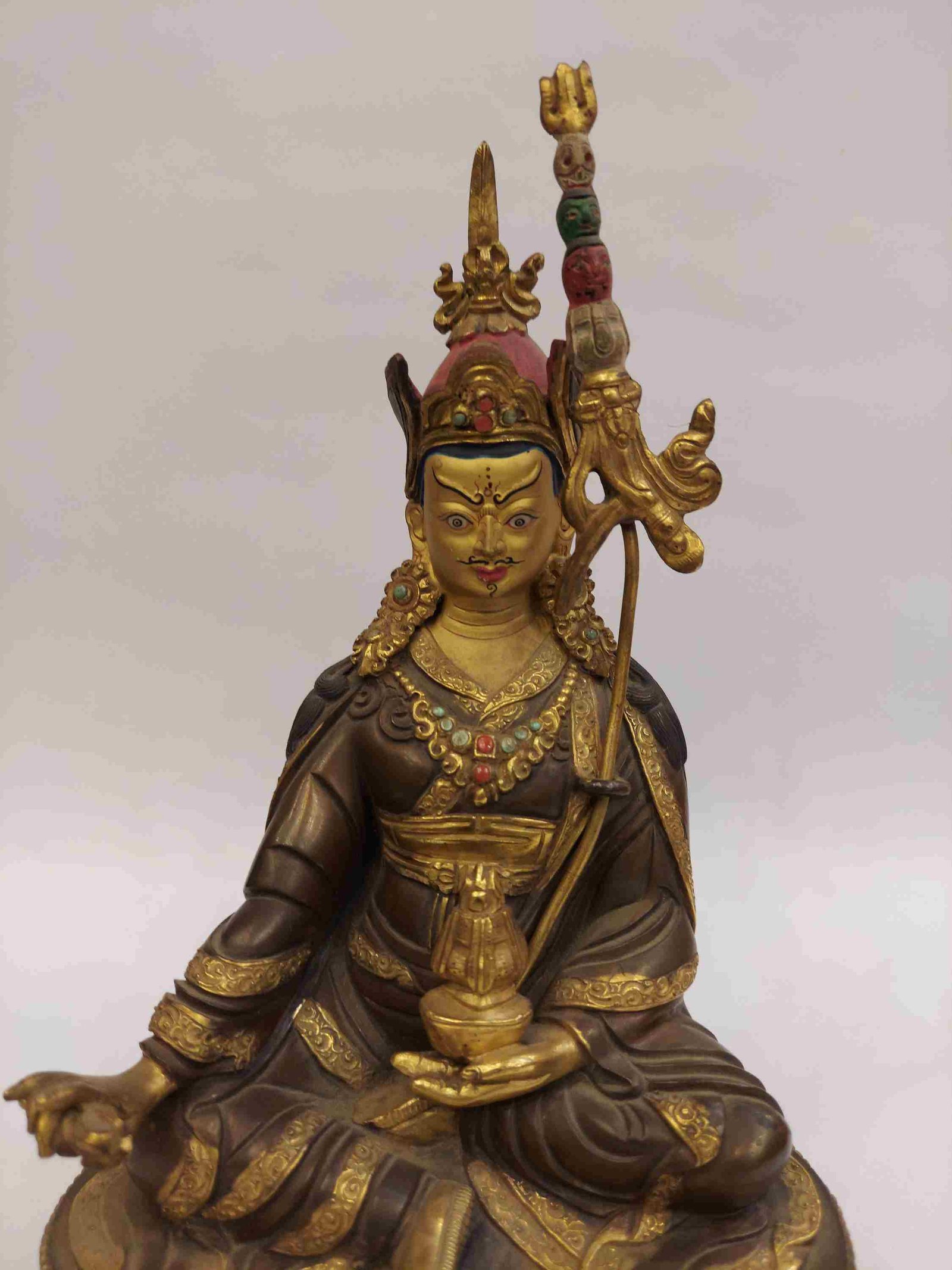The face of Padmasambhava is painted with gold to enhance its significant features, particularly the eyes, and lips. This detailed painting is essential as it brings forth the crucial attributes of the expression of eyes and lips that metal carving alone cannot capture.