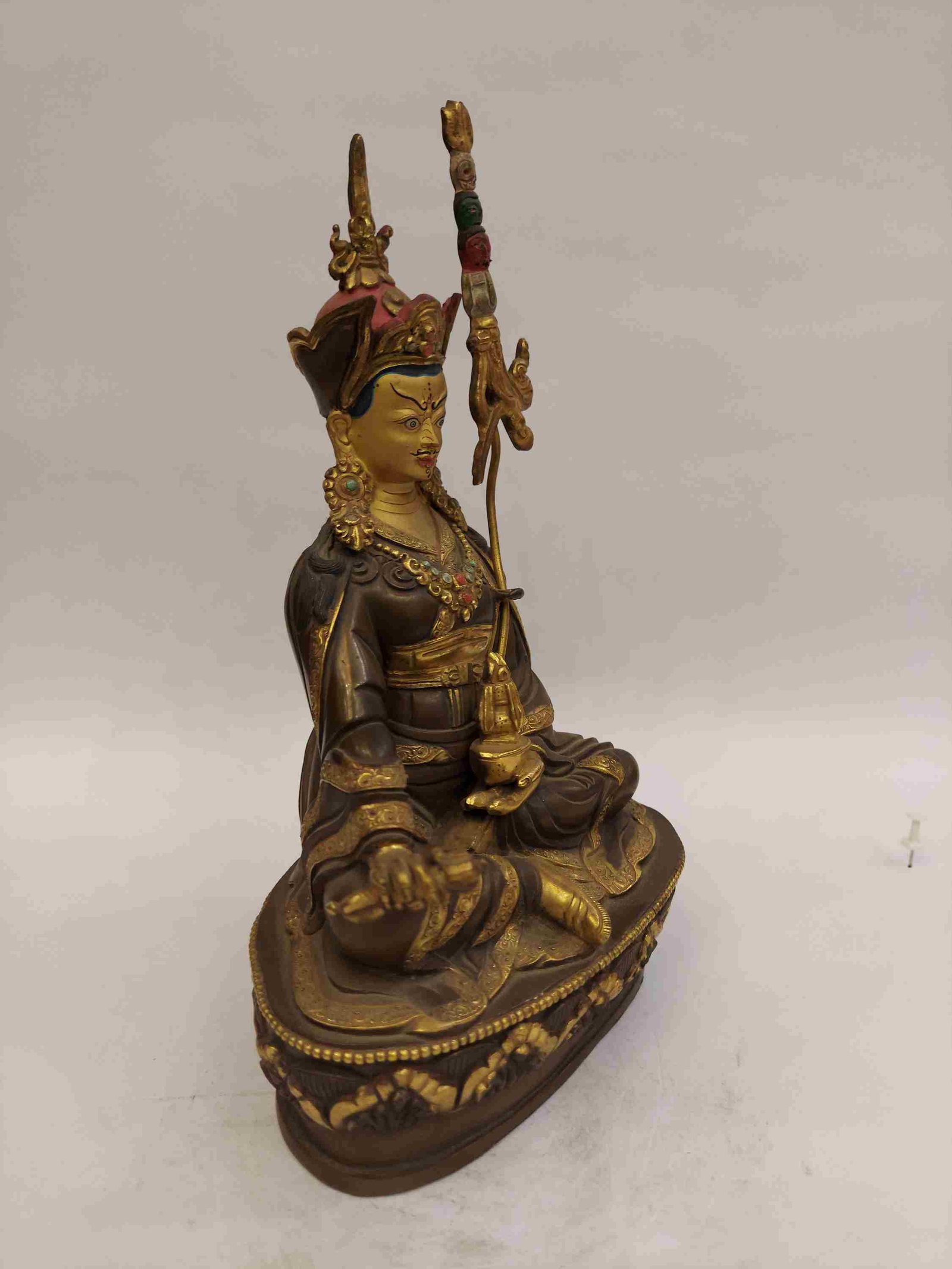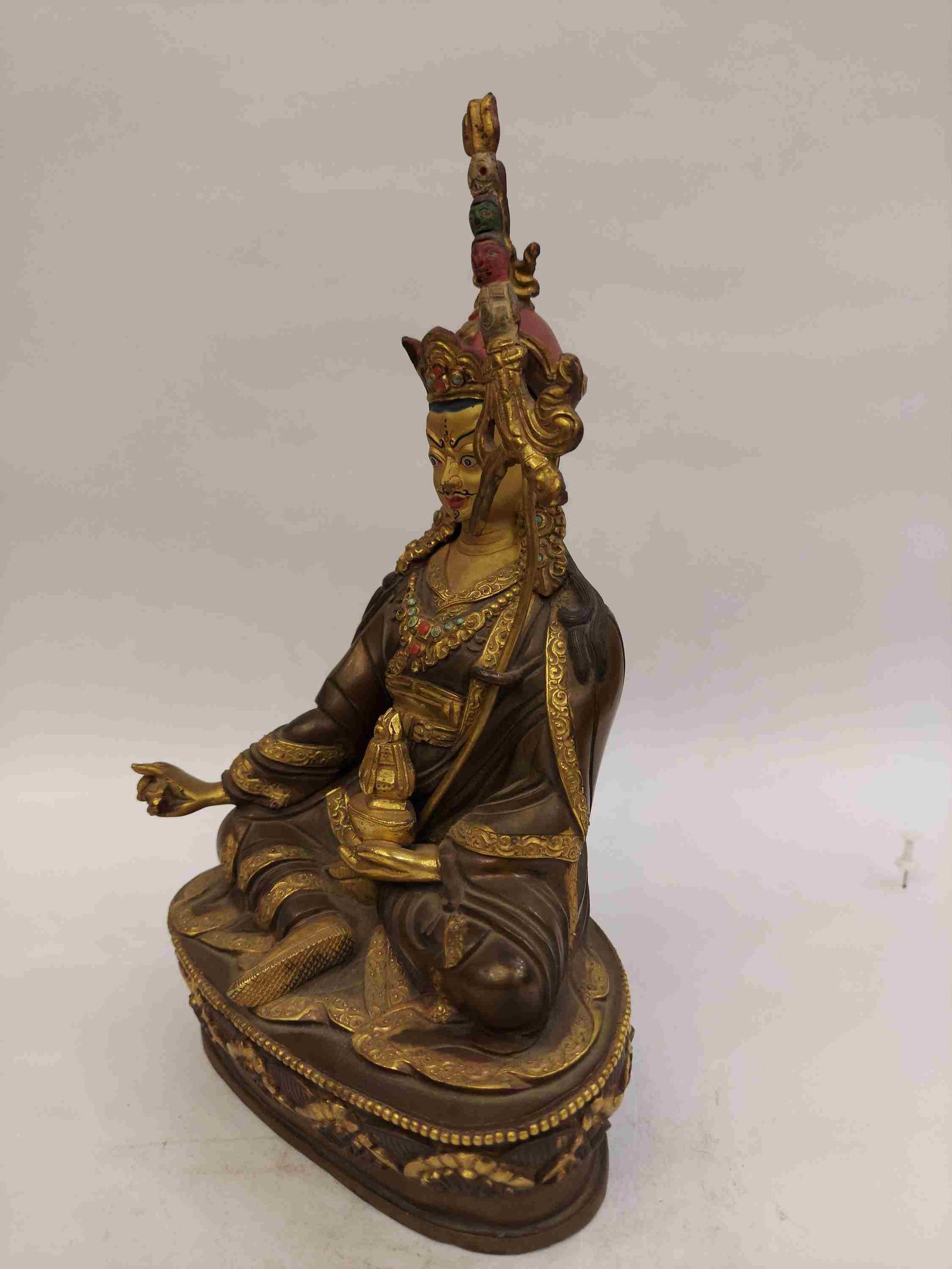 This Padmasambhava has a Partly gold-plated finish. Partly fire gold gilding, a common practice in Nepali handicrafts. This technique is skillfully employed by artisans to create intricate designs on various metal objects, including statues, jewelry, and decorative items. Through a process, a mask or resist is applied to safeguard specific areas from the gold plating. The object is then subjected to high temperatures, allowing the gold to beautifully adhere to exposed surfaces using a combination of heat and pressure.