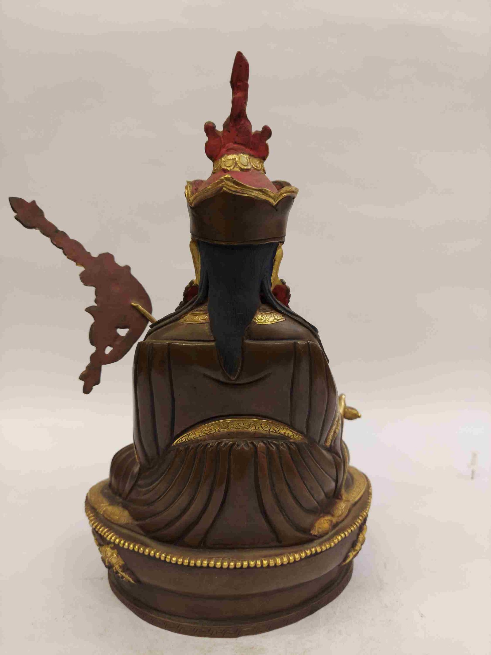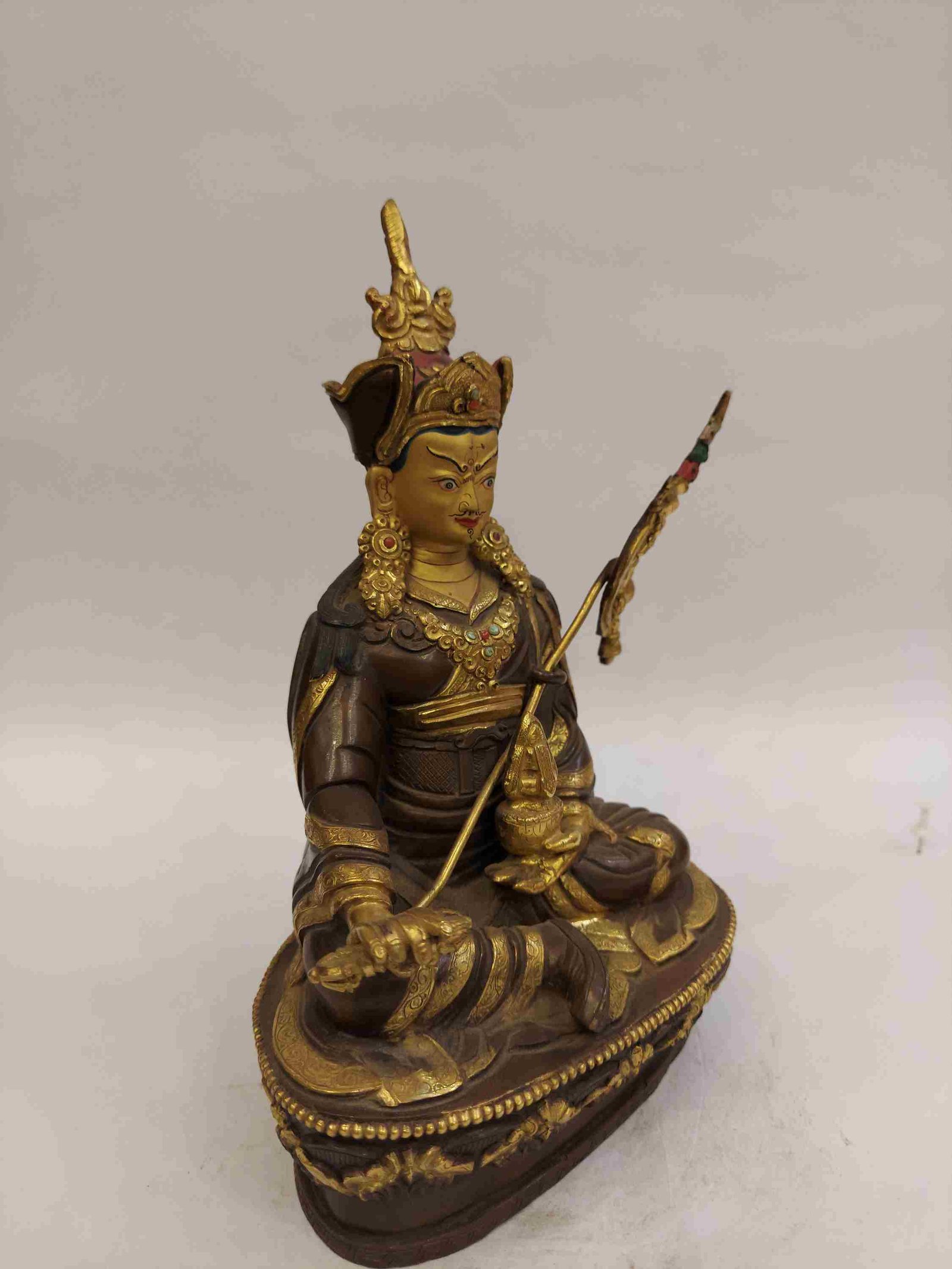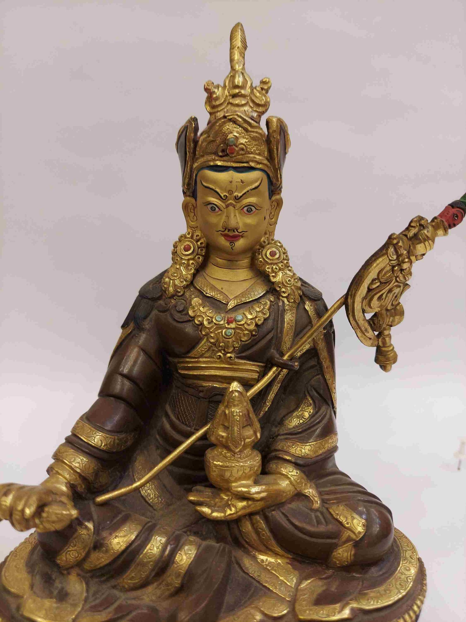 The face of Padmasambhava is painted with gold to enhance its significant features, particularly the eyes, and lips. This detailed painting is essential as it brings forth the crucial attributes of the expression of eyes and lips that metal carving alone cannot capture.