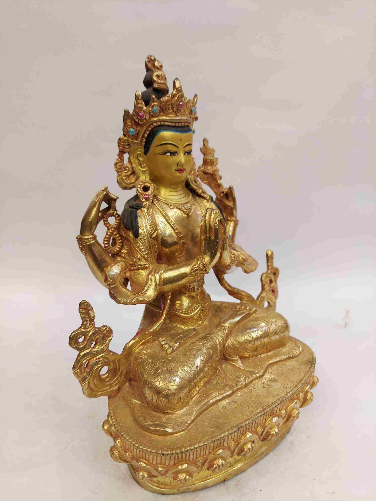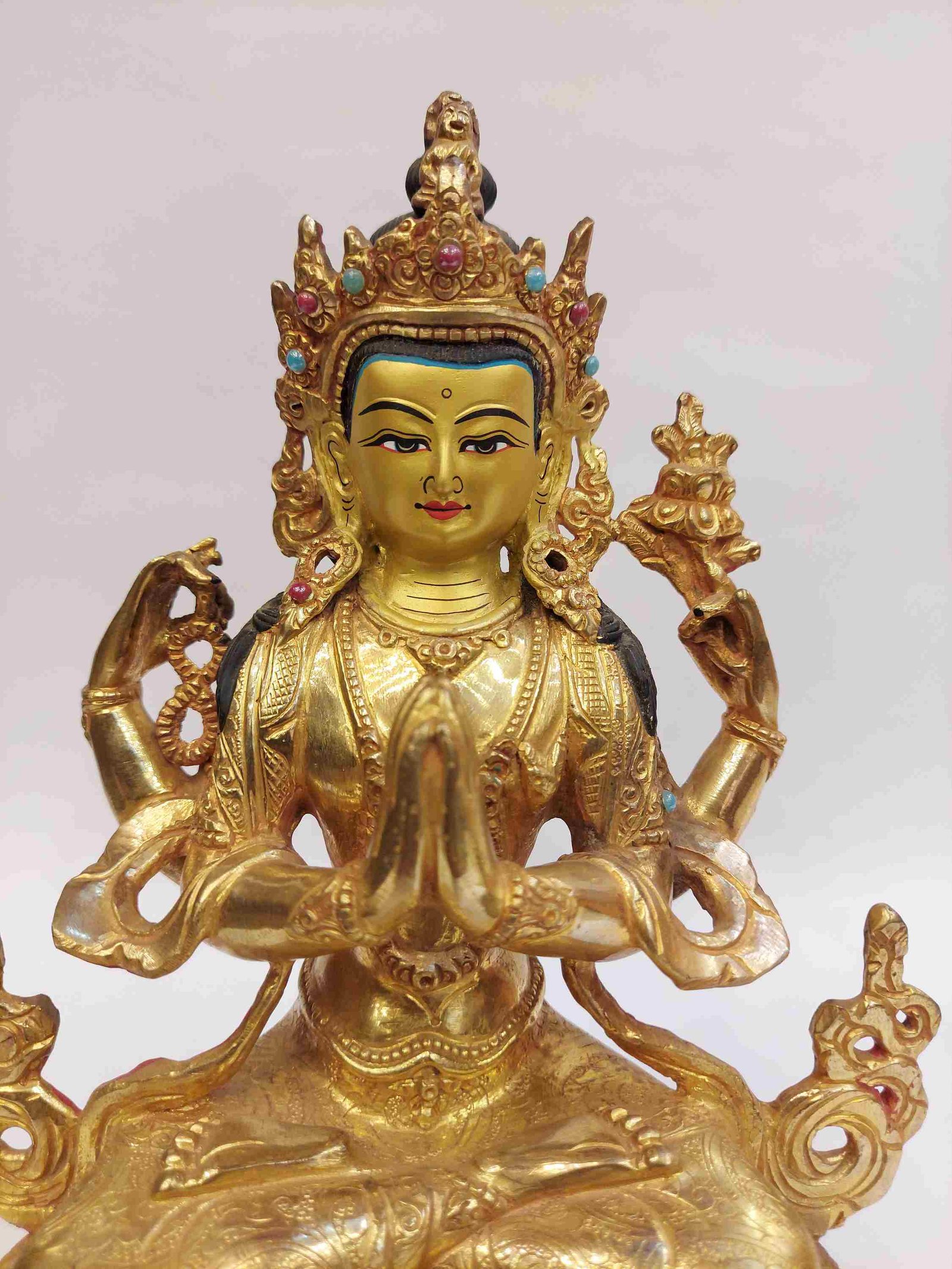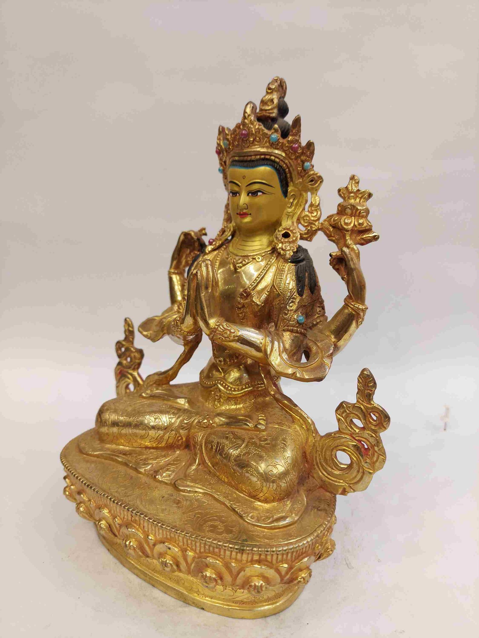 Buddhist Handmade Statue of Chenrezig, Full Gold Plated, Face Painted, Stone Setting , Bodhisattva of Compassion, Protector of All Beings