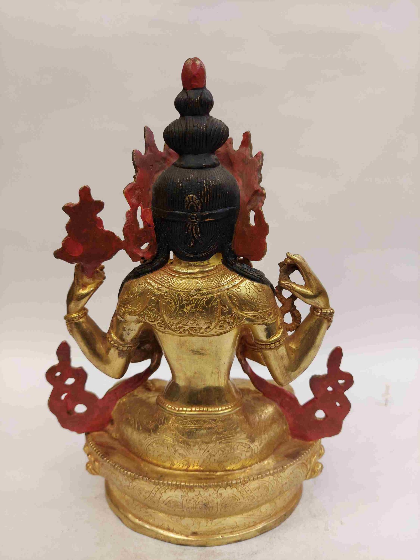 This Chenrezig is finished with full gold plating. also known as mercury gold plating or fire gold plating. This traditional technique involves the application of a genuine layer of gold onto the Chenrezig. Referred to as mercury gold plating, it is considered the correct and authentic form of gold plating in Nepal. Despite being more expensive than electroplating, this traditional mercury gold plating is gaining popularity again in Nepal. People are drawn to its authenticity, longevity, and the unmatched beauty it brings to the Chenrezig. The resurgence of interest in this traditional form of gold plating reflects a growing appreciation for the craftsmanship and cultural heritage of Nepal Read More