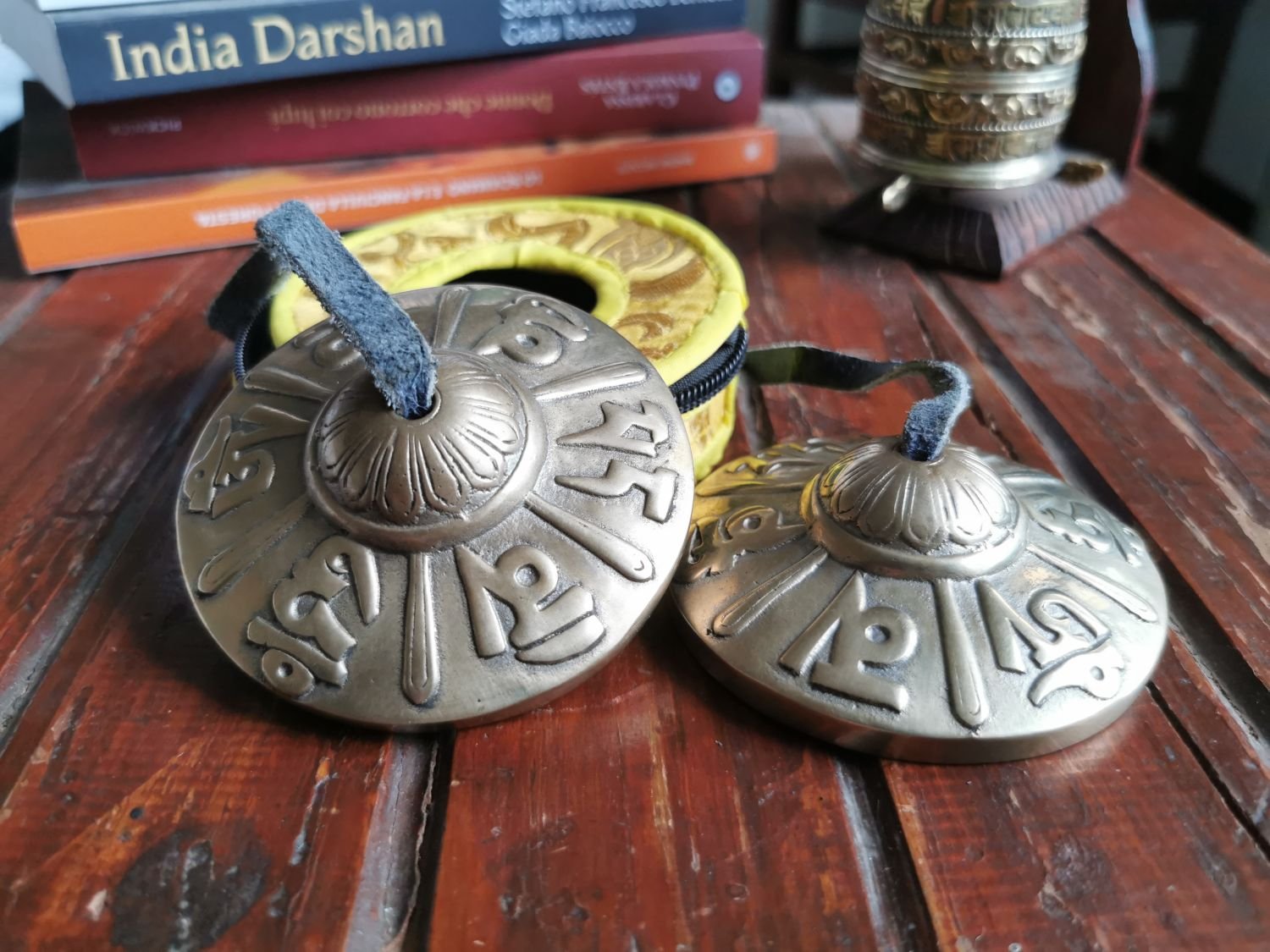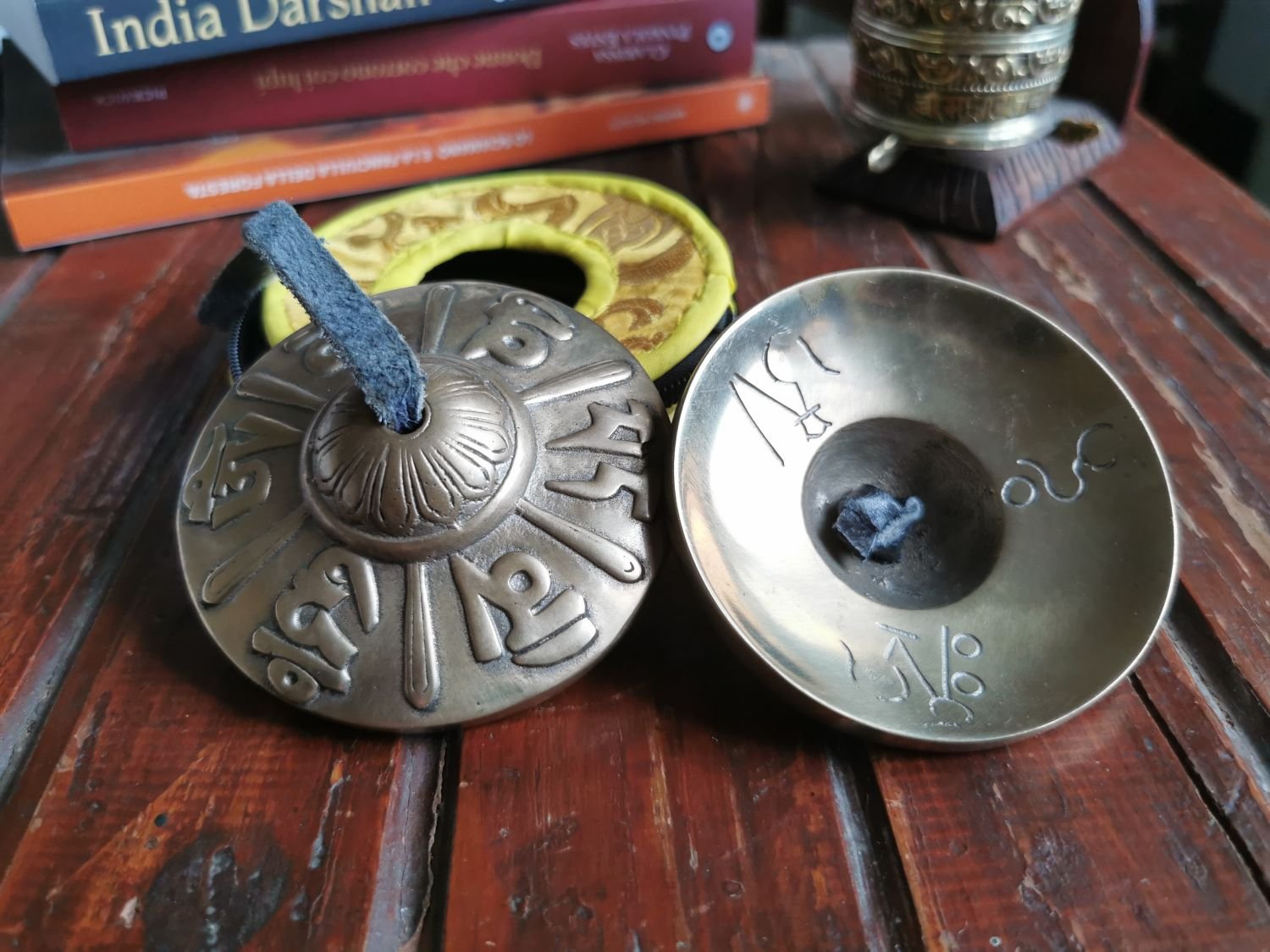 Tibetan tingsha (or Ting-Sha) ( Wylie: ting-shags) are small cymbals used in prayer and rituals by Tibetan Buddhist practitioners. Two cymbals are joined together by a leather strap or chain. The cymbals are struck together producing a clear and high pitched tone. Typical sizes range from 2.5 to “4 inches in diameter. Tingsha are very thick and produce a unique long ringing tone. Antique tingsha were made from special bronze alloys that produce harmonic overtones.
