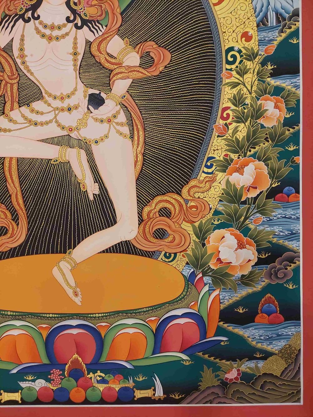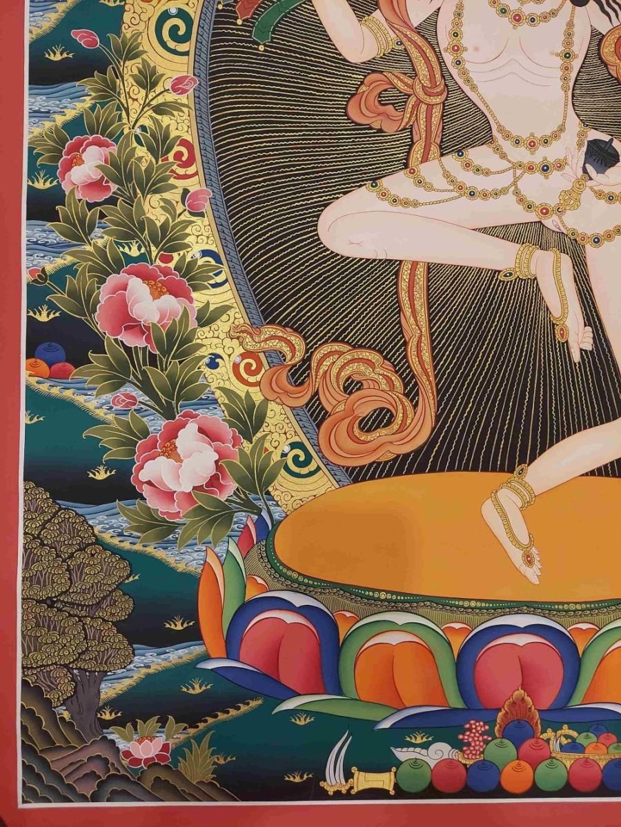 This thangka of Machig Labdron has real gold painted on its surface along with other paints. This is an ancient process of decorating the thangka in Tibetan Buddhism, Here gold is ground into gold dust, which is then mixed with other undisclosed material to make it paintable on the canvas. this mixture is then mixed with transparent glue and painted on the thangka. Read More