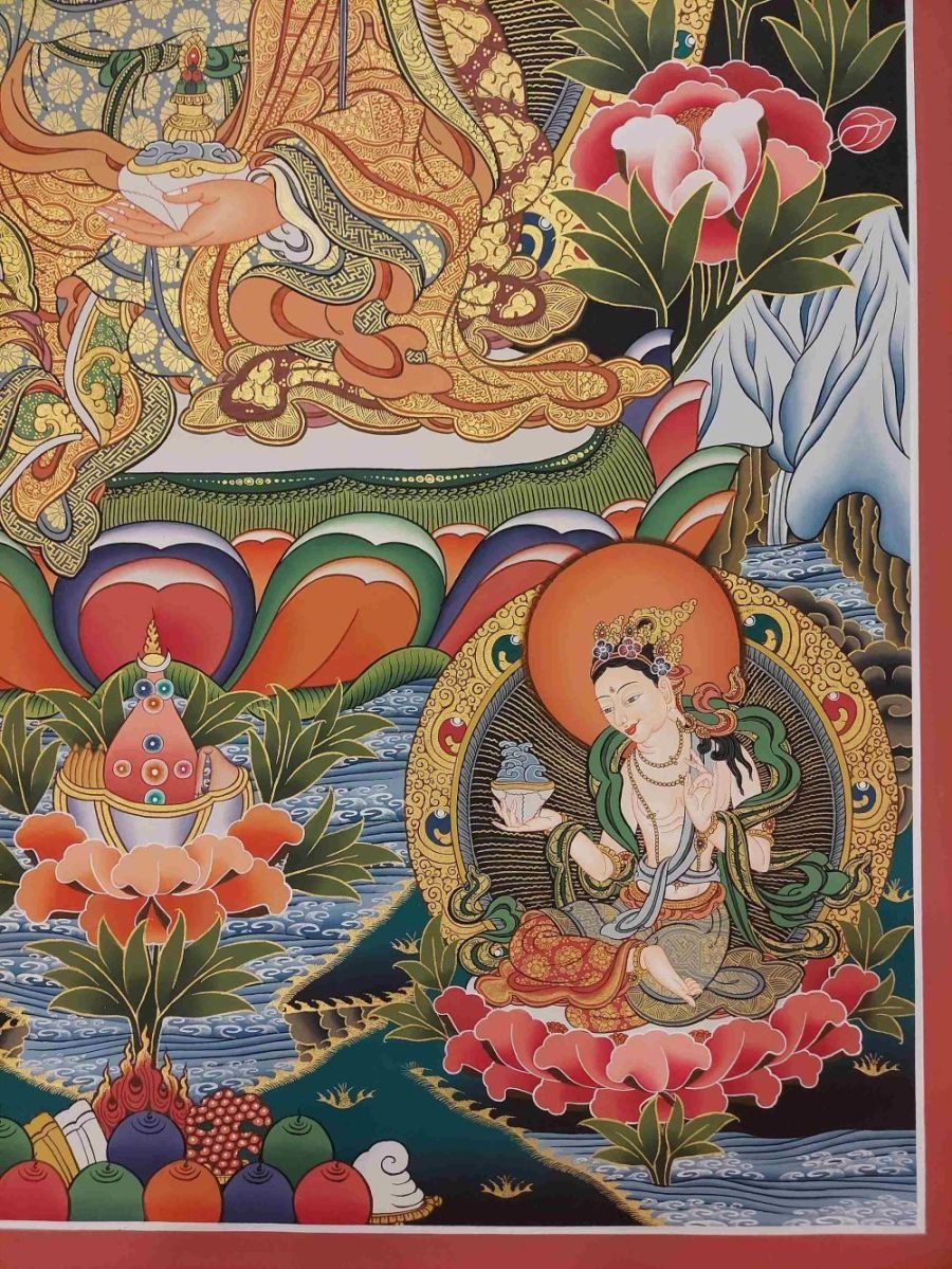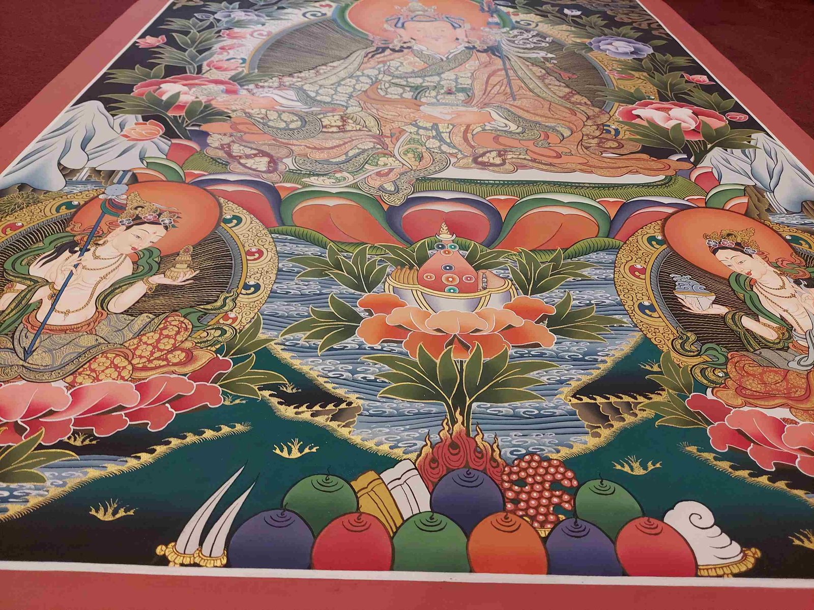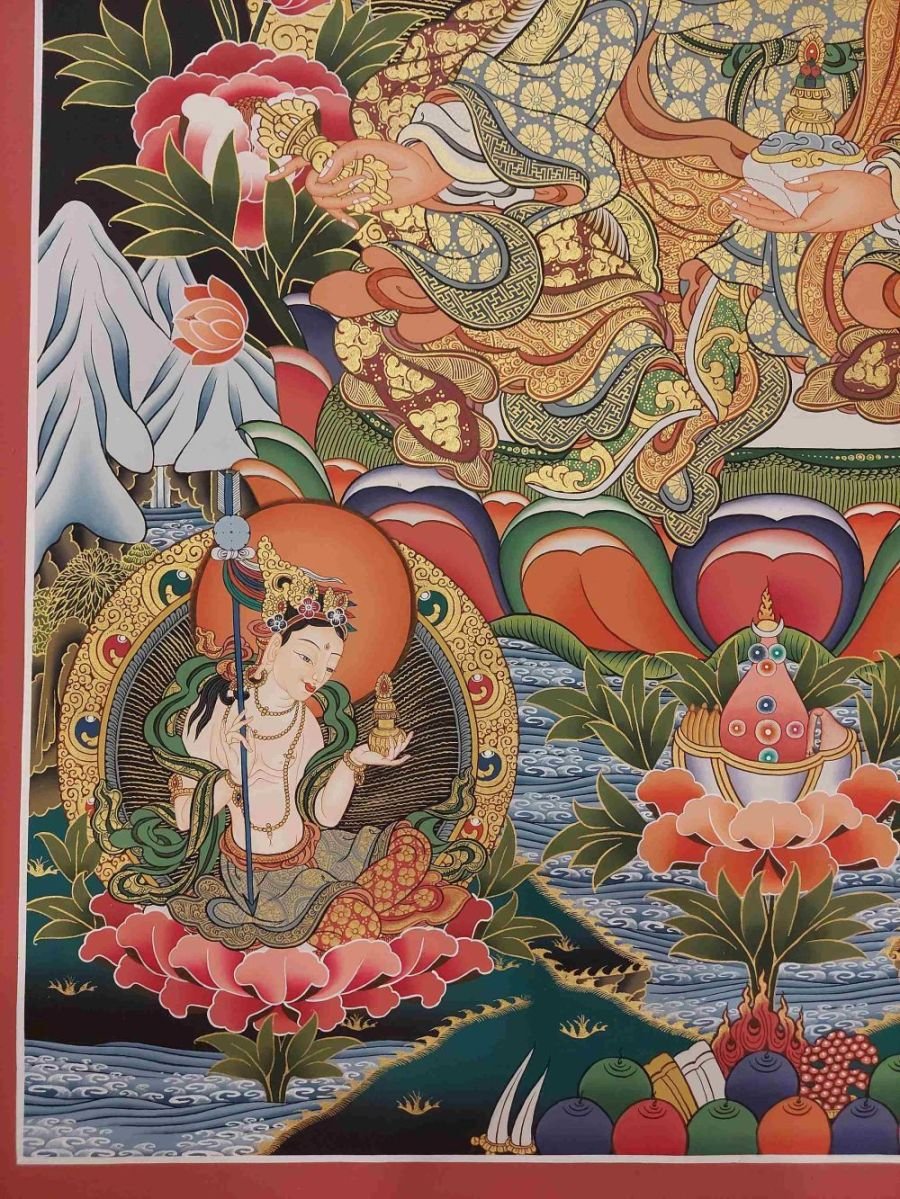 This thangka of Padmasambhava has real gold painted on its surface along with other paints. This is an ancient process of decorating the thangka in Tibetan Buddhism, Here gold is ground into gold dust, which is then mixed with other undisclosed material to make it paintable on the canvas. this mixture is then mixed with transparent glue and painted on the thangka. Read More