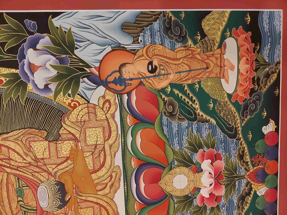 This thangka of Shakyamuni Buddha has real gold painted on its surface along with other paints. This is an ancient process of decorating the thangka in Tibetan Buddhism, Here gold is ground into gold dust, which is then mixed with other undisclosed material to make it paintable on the canvas. this mixture is then mixed with transparent glue and painted on the thangka. Read More