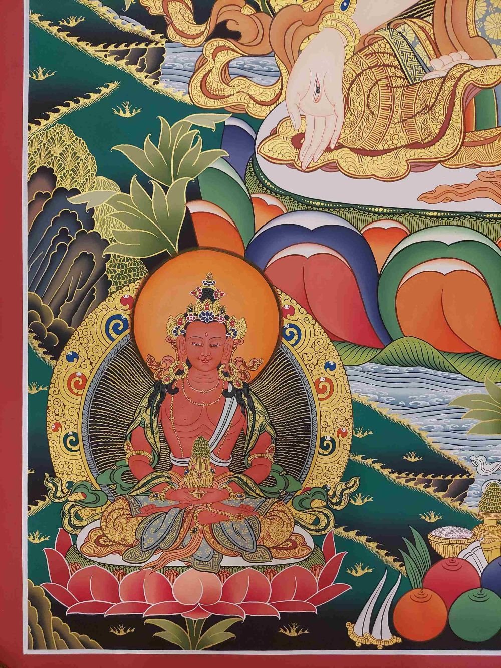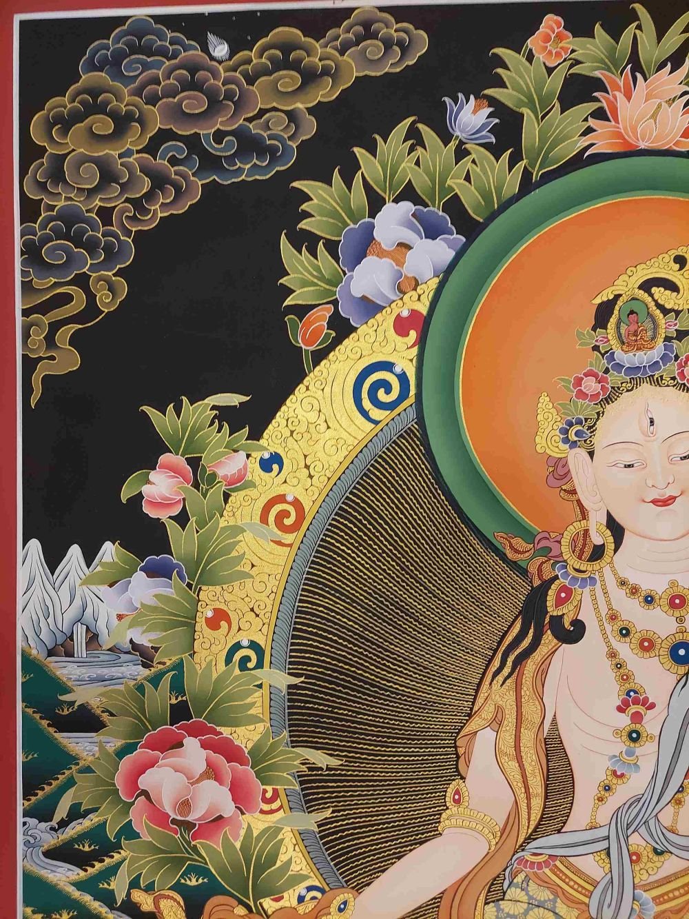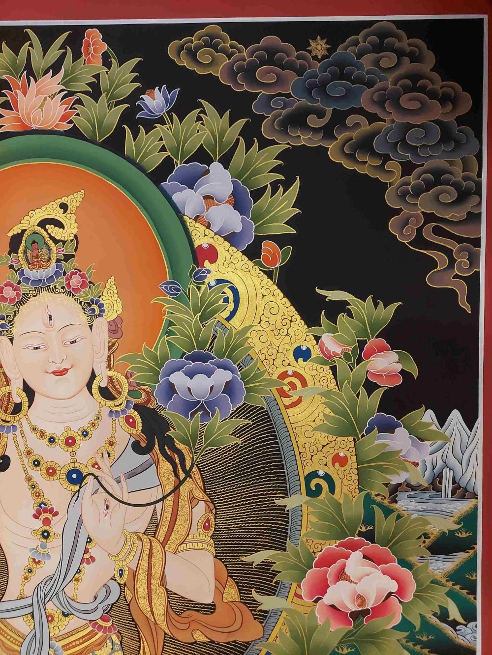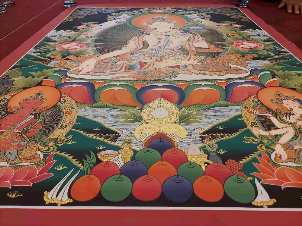 This thangka of White Tara has real gold painted on its surface along with other paints. This is an ancient process of decorating the thangka in Tibetan Buddhism, Here gold is ground into gold dust, which is then mixed with other undisclosed material to make it paintable on the canvas. this mixture is then mixed with transparent glue and painted on the thangka. Read More