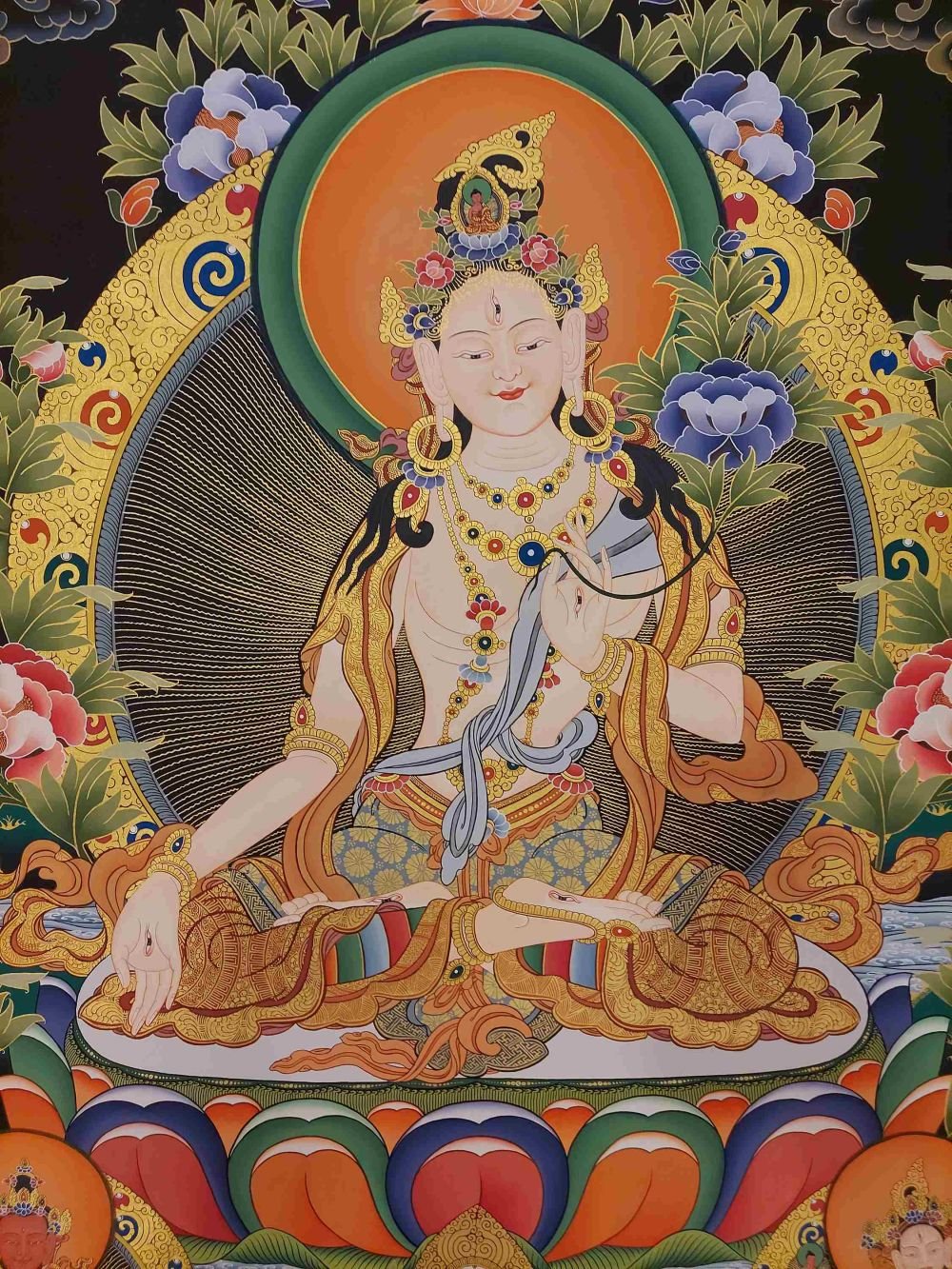 Her left hand is gracefully lowered in an empty open palm boon granting gesture [Skt. Varada Mudra]. White Tara has a blooming pink lotus & an unopened bud on either side of her body. The lotus in the painting is stylised as a peony & a chrysanthemum to provide artistic contrast with her lotus throne. The open blossom represents the present and the bud represents the future situations & Buddhas yet to be born. The future also refers to beneficial changes circumstances that she will help bring about. Her right hand wisdom hand is in the gesture of giving refuge [Skt. Sharanagamana]. The word refuge refers to the teaching of compassionate understanding which she imparts. The third finger touches the thumb to create a circle representing the union of wisdom and compassion, and the three extended fingers symbolise the Three Jewels of Buddhism A. The Buddha State B. The Body of teachings [Skt. Sangha] C. The Principles of the Universal form [Skt. Dharma]. The same hand holds the stem of a blue lotus [Skt. Utpala] representing change. The lower part of the stem below the bend represents the root of the lotus in the mud. The allegory of the Lotus refers to the something that grows from the obscurity of the mud & which eventually bursts open in the light. The lotus journey is one of inner awakening & enlightenment analogous to the human spirit. Buddhism shows us how to grow towards the light with profound teachings which help us to navigate away from burdens and sufferings which we may have by being materially minded, bitter & confused.