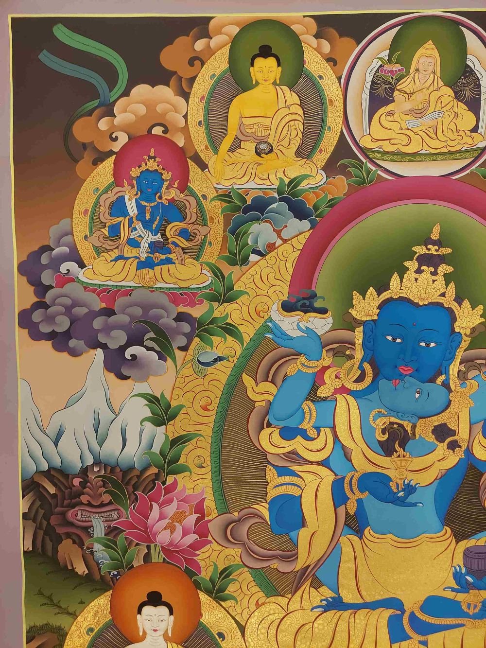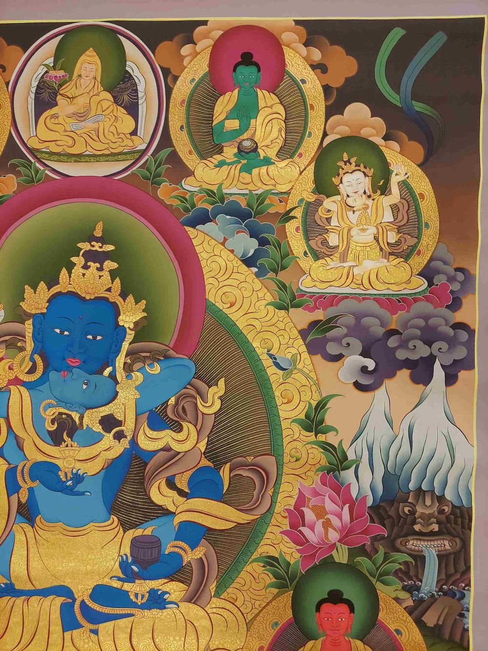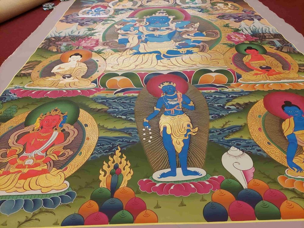 This thangka of Vajradhara has real gold painted on its surface along with other paints. This is an ancient process of decorating the thangka in Tibetan Buddhism, Here gold is ground into gold dust, which is then mixed with other undisclosed material to make it paintable on the canvas. this mixture is then mixed with transparent glue and painted on the thangka. Read More
