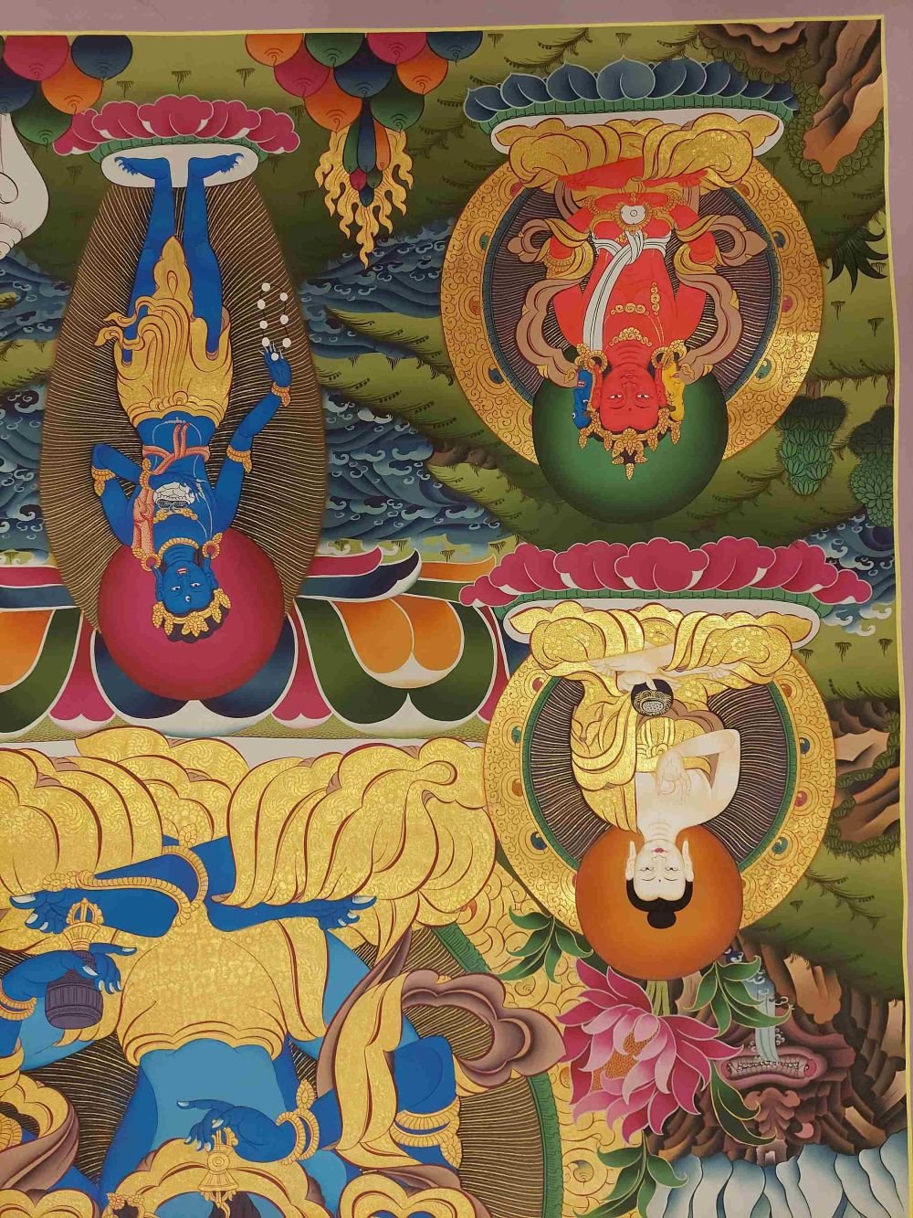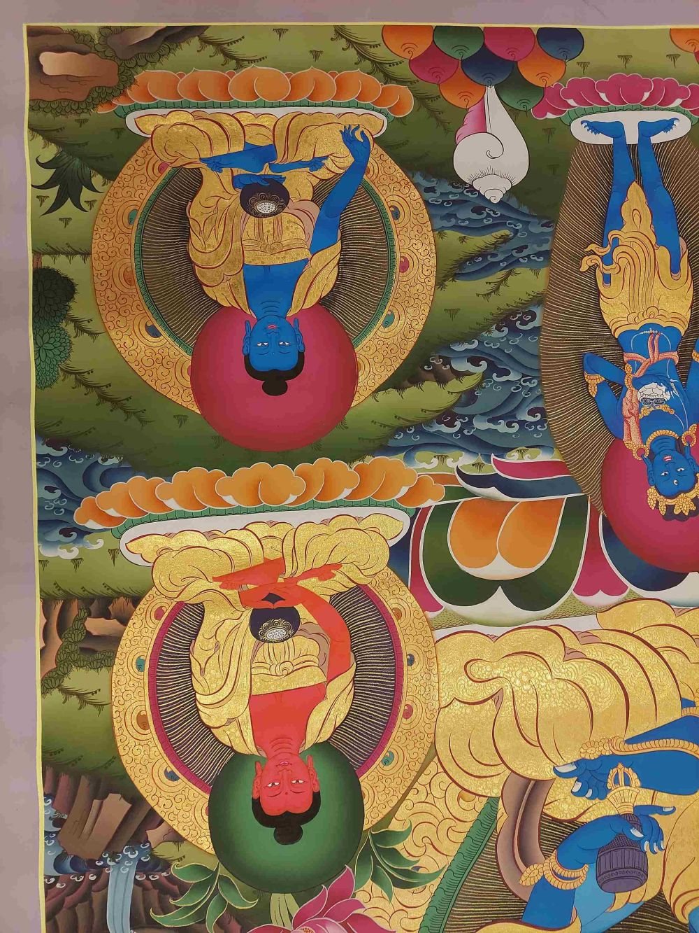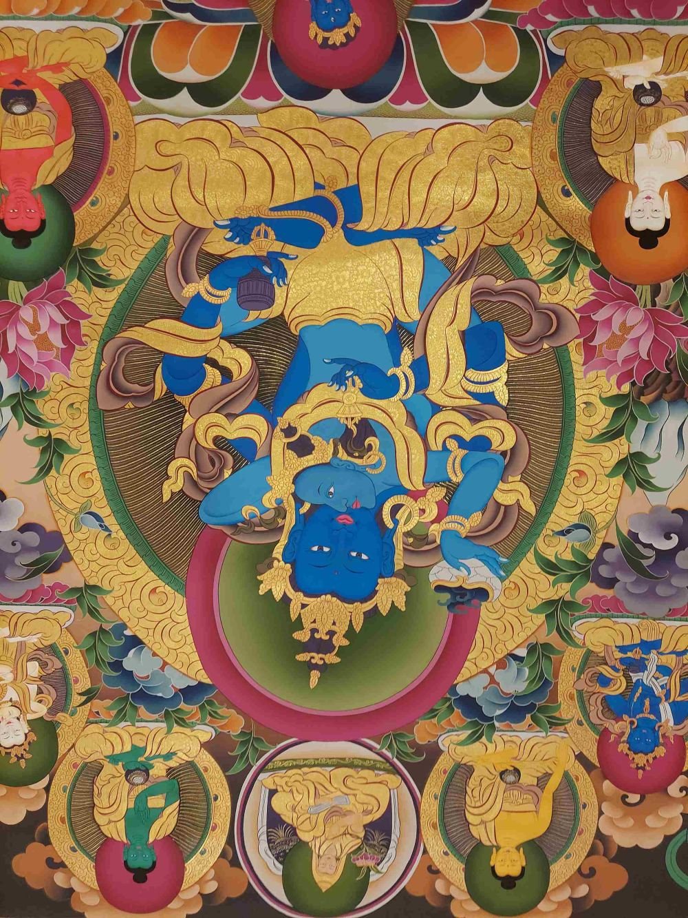 This thangka of Vajradhara has real gold painted on its surface along with other paints. This is an ancient process of decorating the thangka in Tibetan Buddhism, Here gold is ground into gold dust, which is then mixed with other undisclosed material to make it paintable on the canvas. this mixture is then mixed with transparent glue and painted on the thangka. Read More