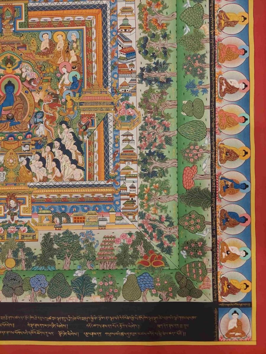 This thangka of Medical Thangka has real gold painted on its surface along with other paints. This is an ancient process of decorating the thangka in Tibetan Buddhism, Here gold is ground into gold dust, which is then mixed with other undisclosed material to make it paintable on the canvas. this mixture is then mixed with transparent glue and painted on the thangka. Read More