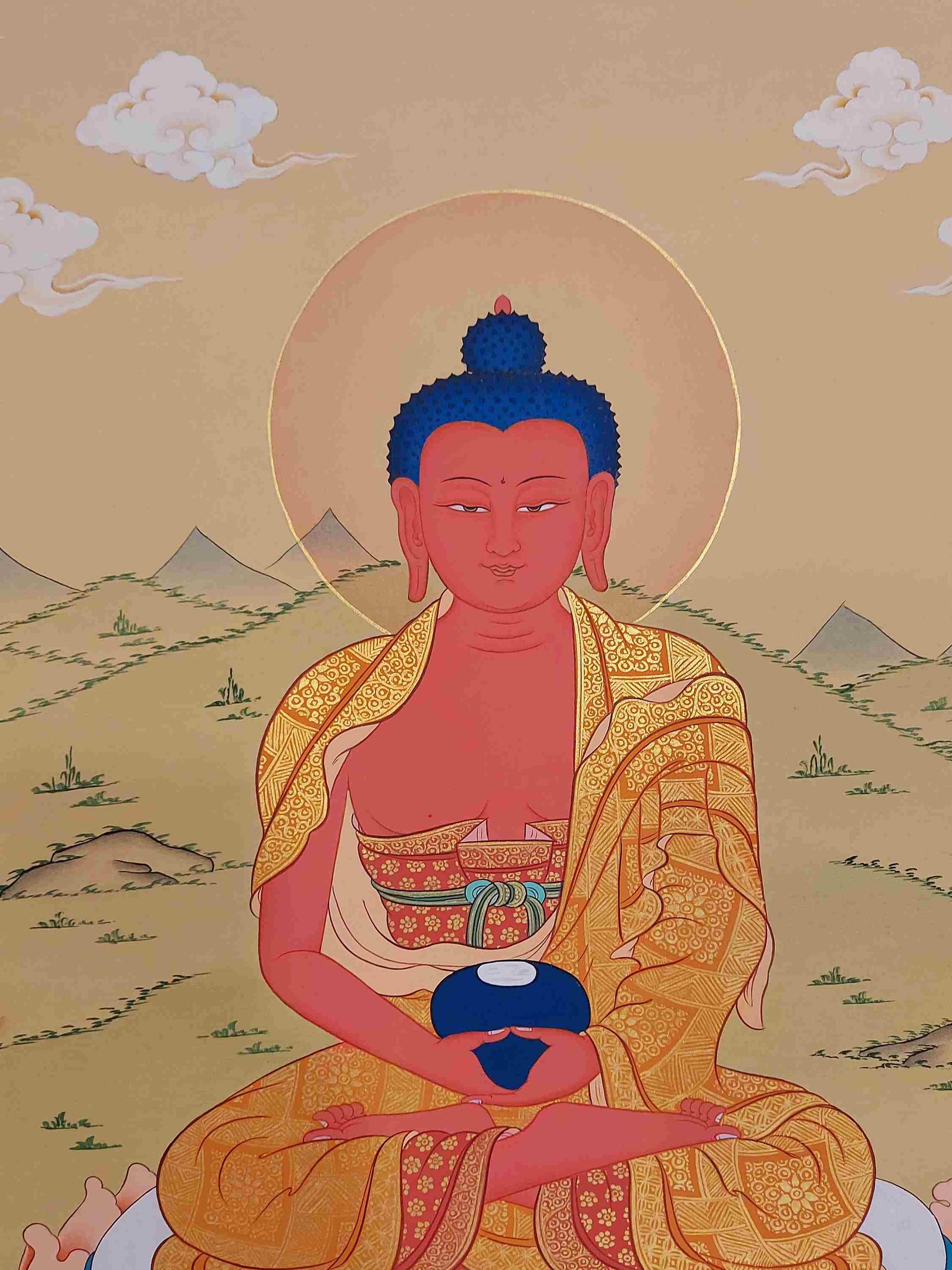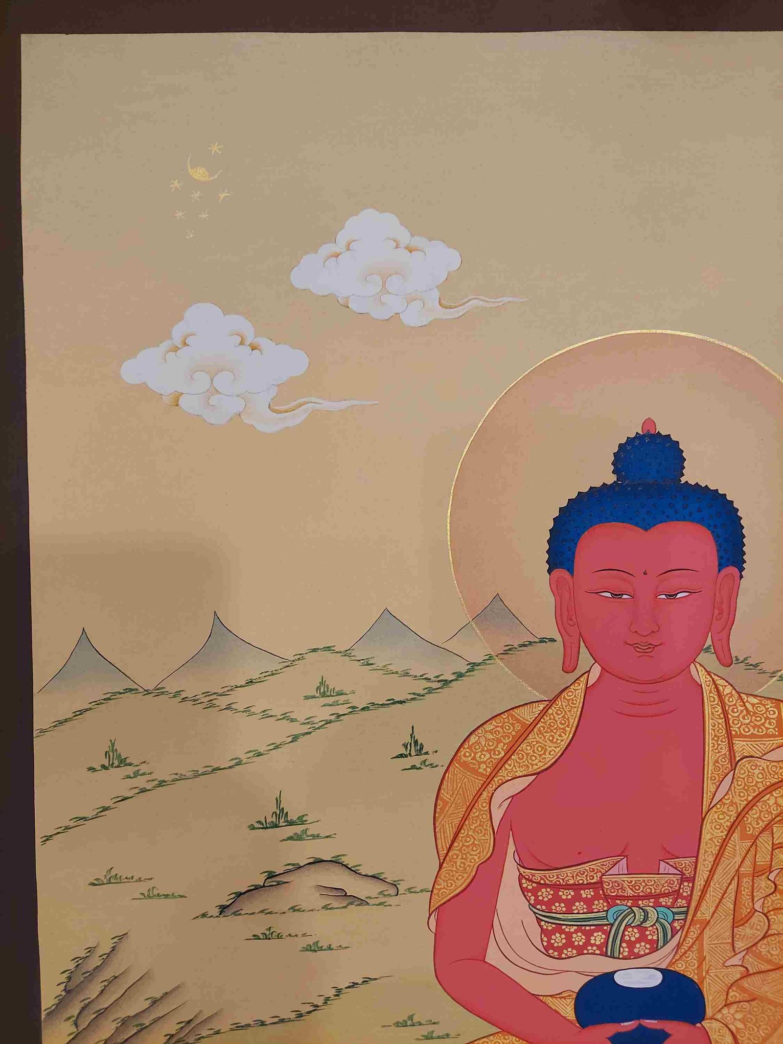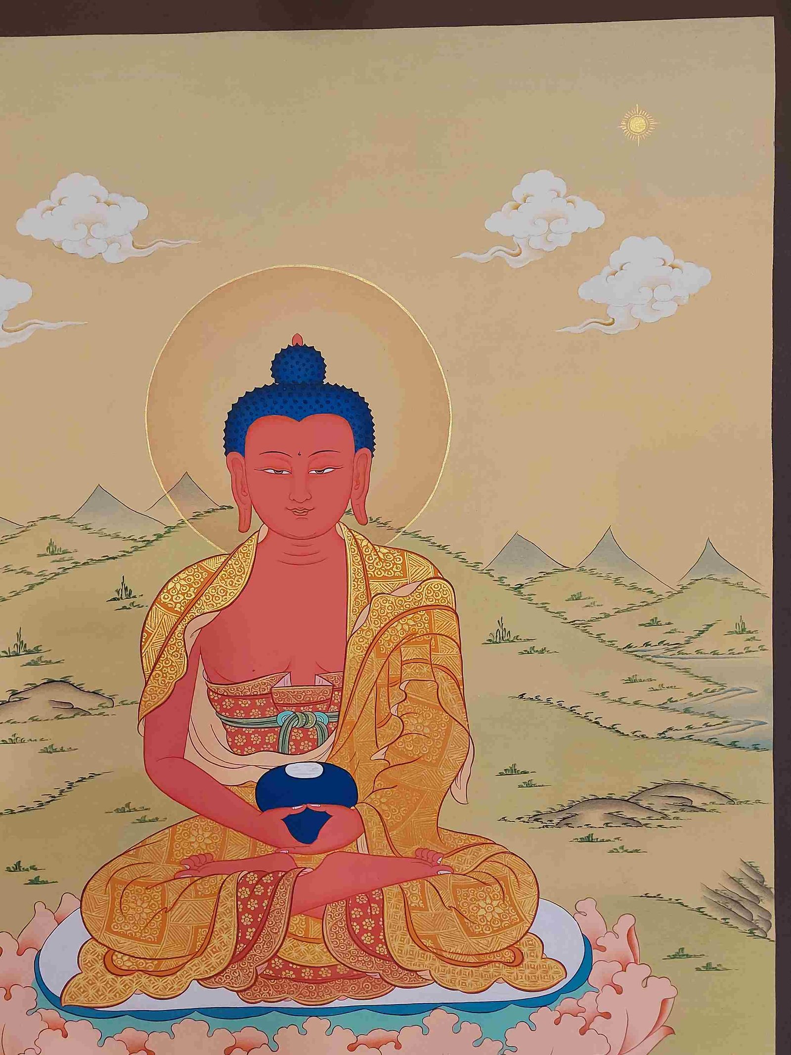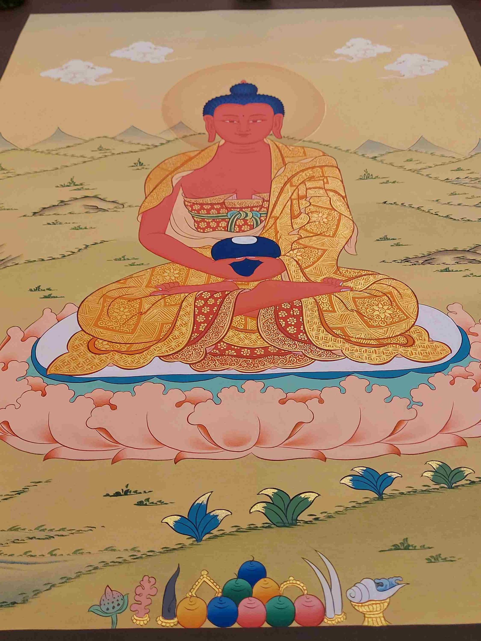 This thangka of Amitabha Buddha has real gold painted on its surface along with other paints. This is an ancient process of decorating the thangka in Tibetan Buddhism, Here gold is ground into gold dust, which is then mixed with other undisclosed material to make it paintable on the canvas. this mixture is then mixed with transparent glue and painted on the thangka. Read More