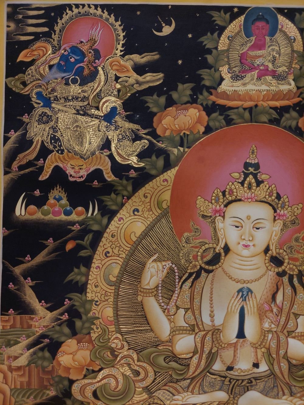 Of all the deities in Mahayana Buddhism, the bodhisattva Avalokiteshvara, Chenrezig, is one of the most celebrated. He is the lord gifted with complete enlightenment, who refrains from entering the blissful state of nirvana to remain here below and save the living being of the earth. This devotion to the salvation of others emphasizes profound compassion.