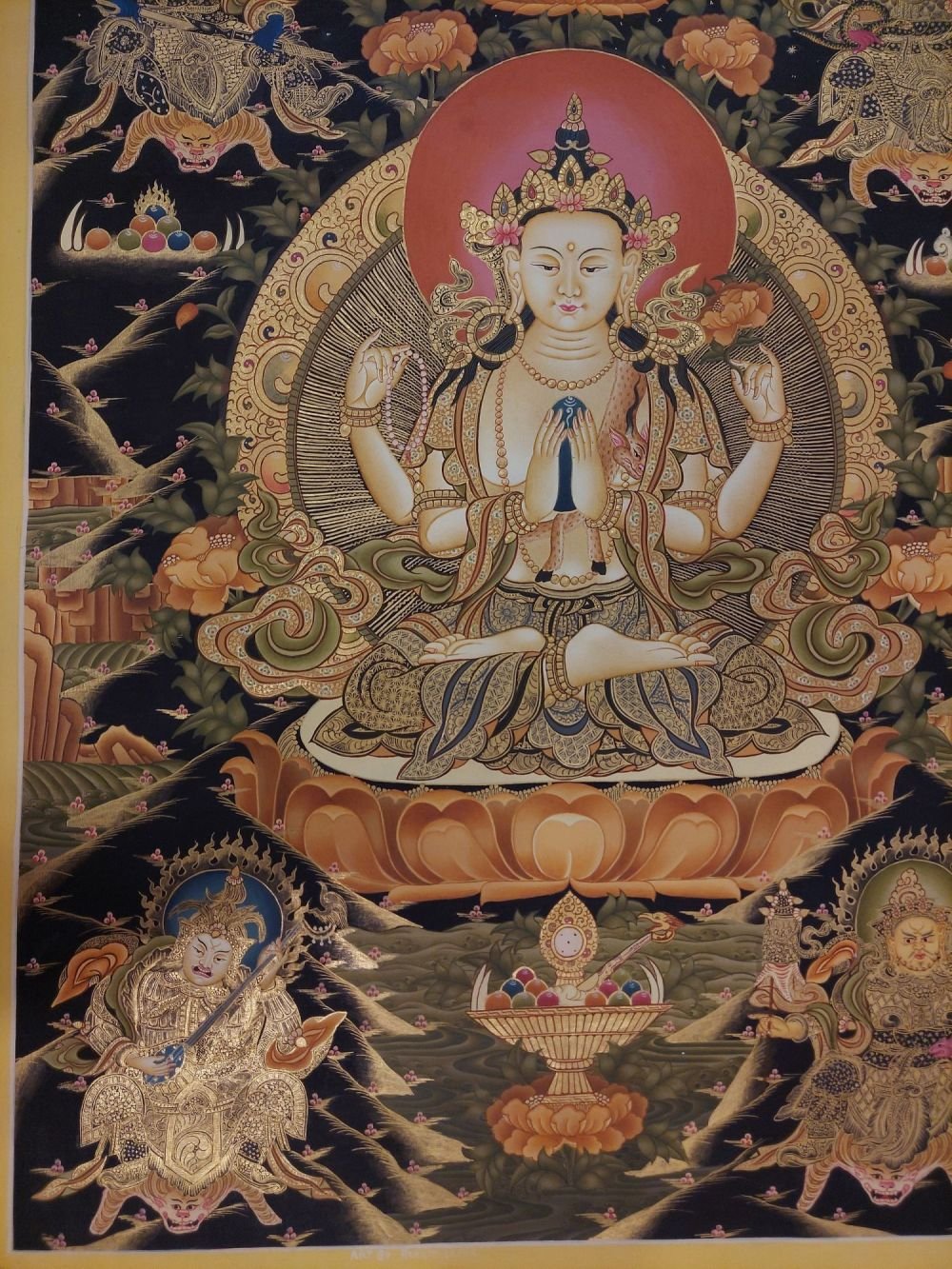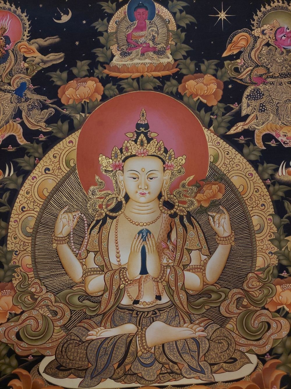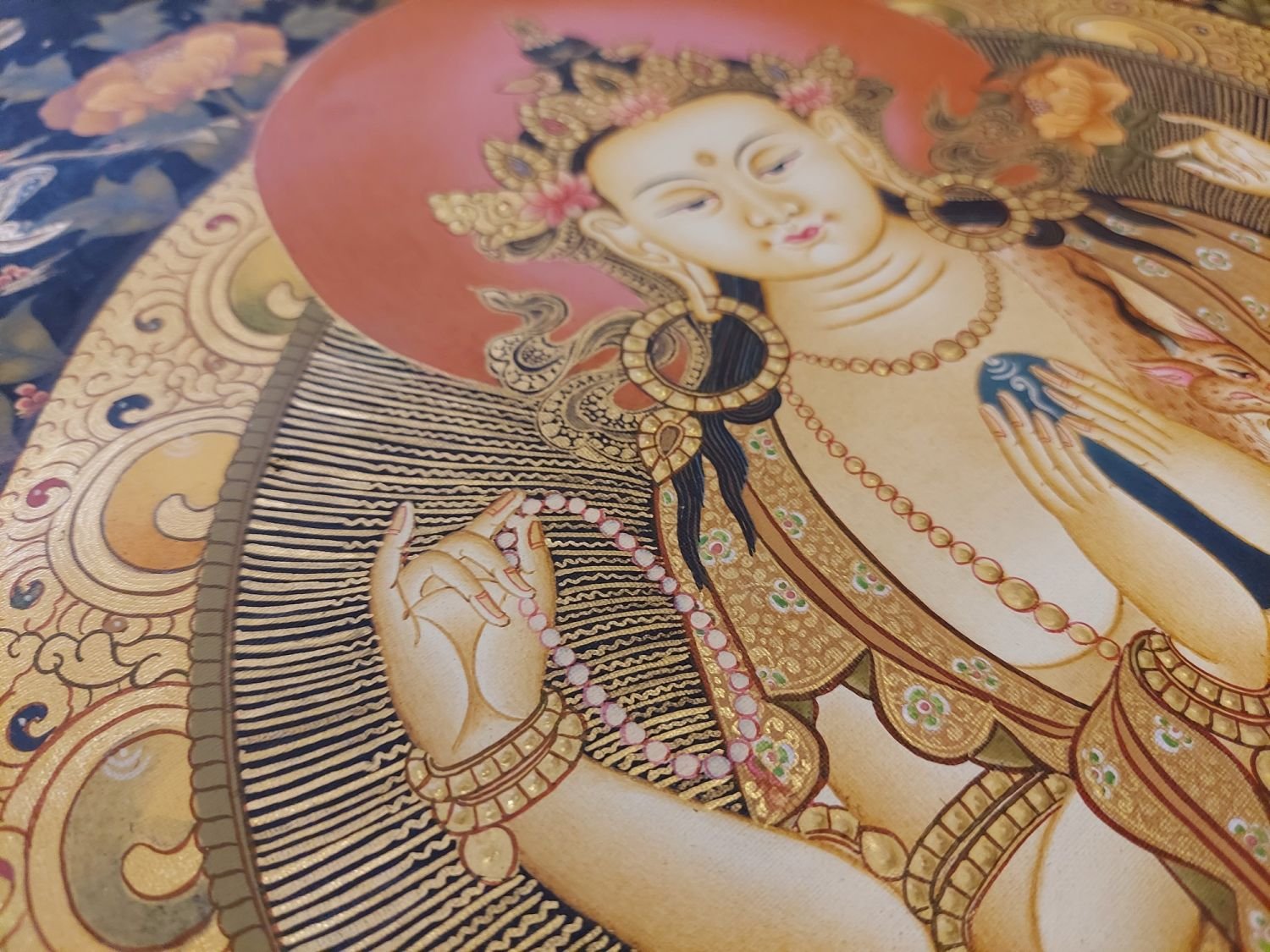 Buddhist Handmade Thangka of Chenrezig, Real Gold, Hand Painted, Real Gold , Bodhisattva of Compassion, Protector of All Beings