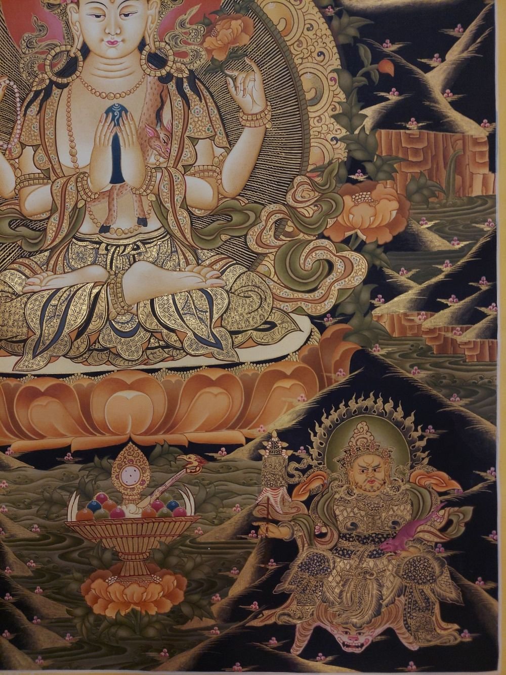 This thangka of Chenrezig has real gold painted on its surface along with other paints. This is an ancient process of decorating the thangka in Tibetan Buddhism, Here gold is ground into gold dust, which is then mixed with other undisclosed material to make it paintable on the canvas. this mixture is then mixed with transparent glue and painted on the thangka. Read More