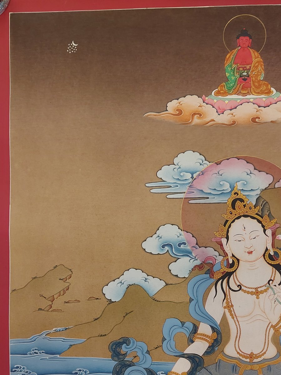 Buddhist Karma Gadri Art, Handmade Thangka of White Tara, Hand Painted, Real Gold, Karma Gadri Art Supported By Aparimita and Namgyalma , Goddess of longevity, healing, and serene compassion