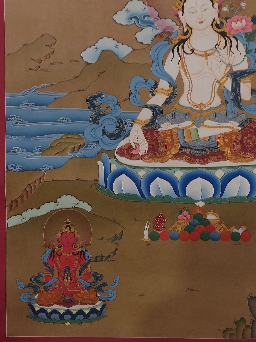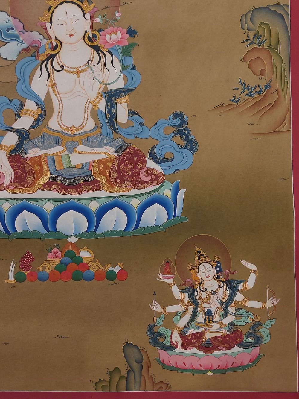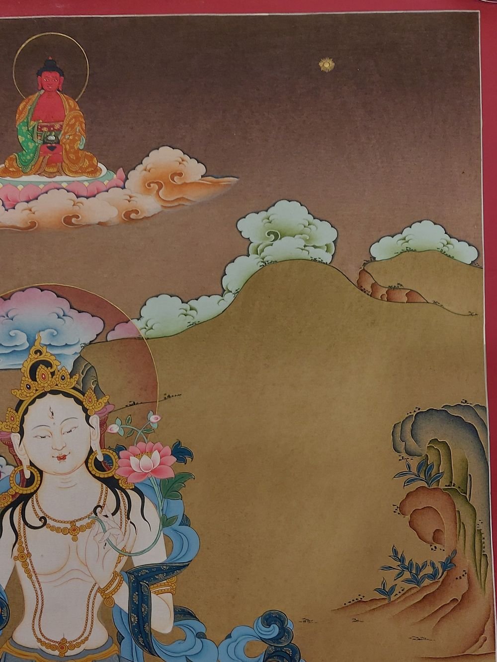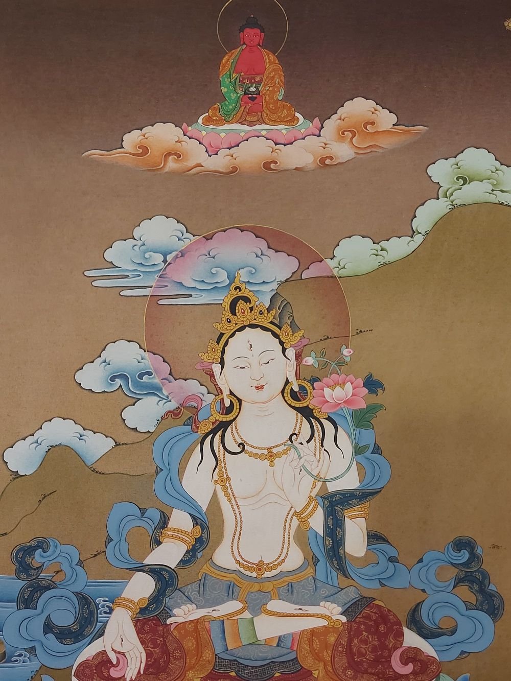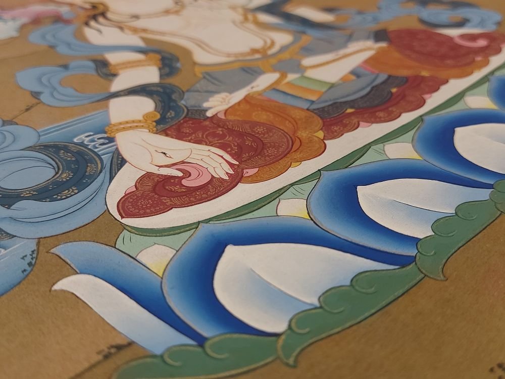 This thangka of White Tara has real gold painted on its surface along with other paints. This is an ancient process of decorating the thangka in Tibetan Buddhism, Here gold is ground into gold dust, which is then mixed with other undisclosed material to make it paintable on the canvas. this mixture is then mixed with transparent glue and painted on the thangka. Read More
