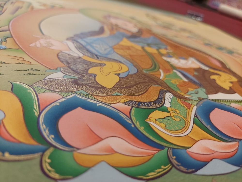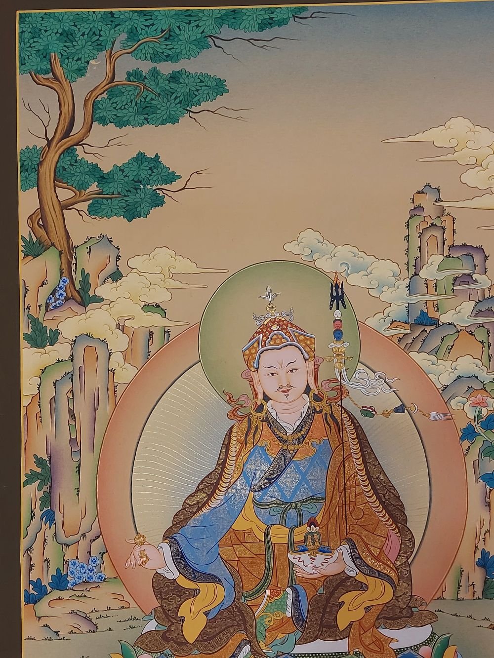 This thangka of Padmasambhava has real gold painted on its surface along with other paints. This is an ancient process of decorating the thangka in Tibetan Buddhism, Here gold is ground into gold dust, which is then mixed with other undisclosed material to make it paintable on the canvas. this mixture is then mixed with transparent glue and painted on the thangka. Read More