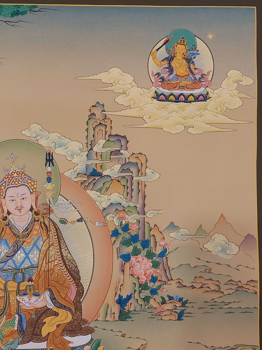 Buddhist Karma Gadri Art, Handmade Thangka of Padmasambhava, Real Gold, Hand Painted, Supported By Manjushri and Vajrapani , The lotus-born master, wisdom beyond time