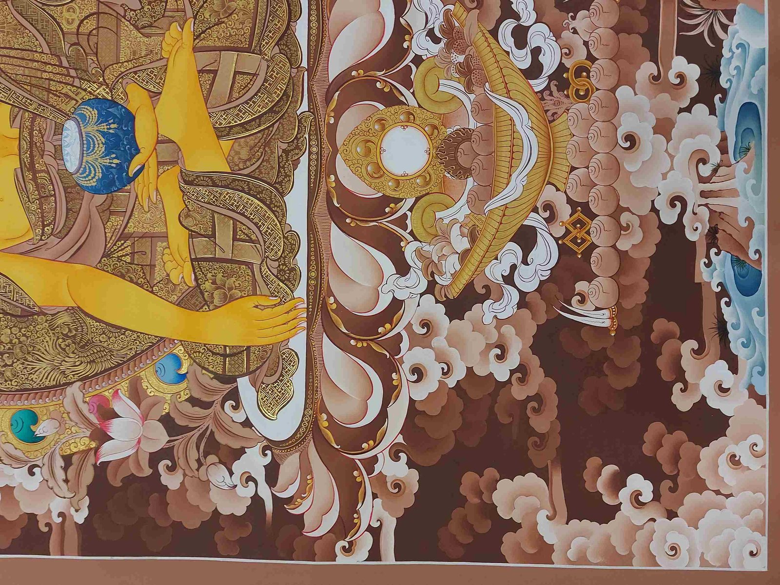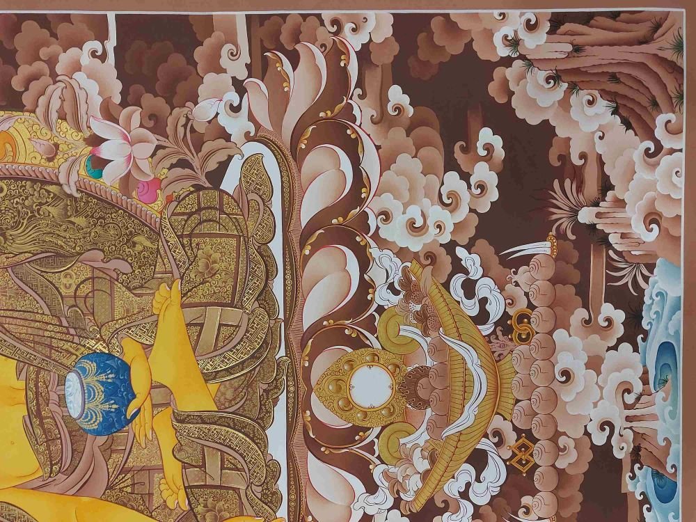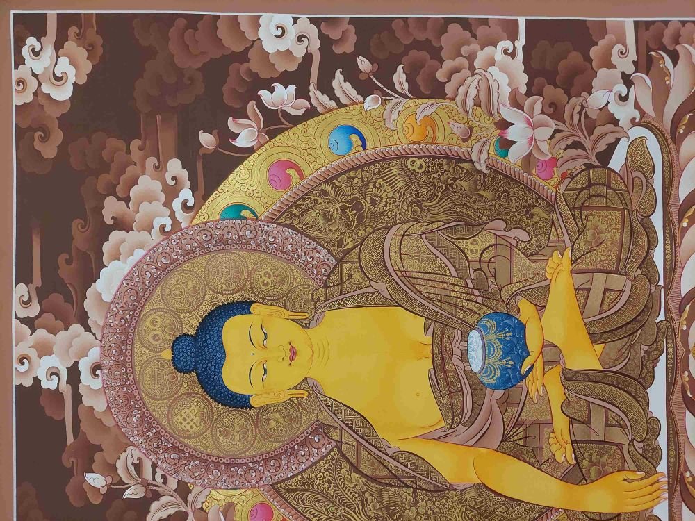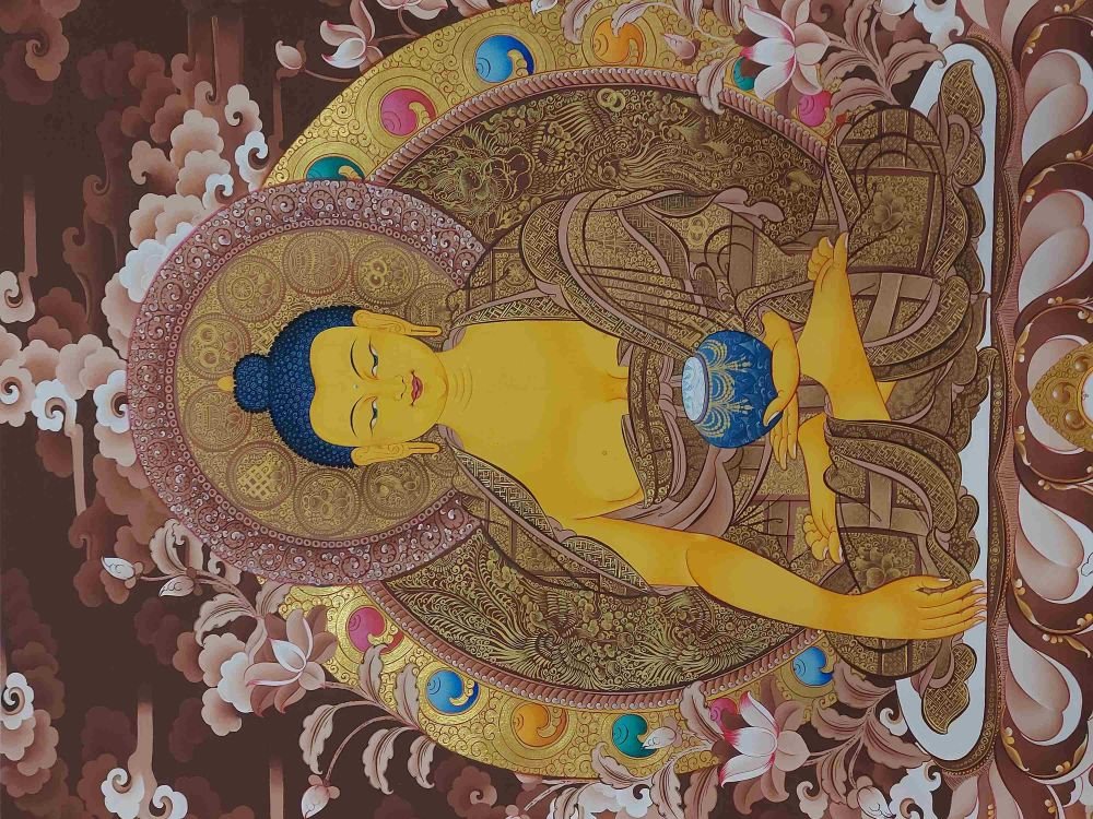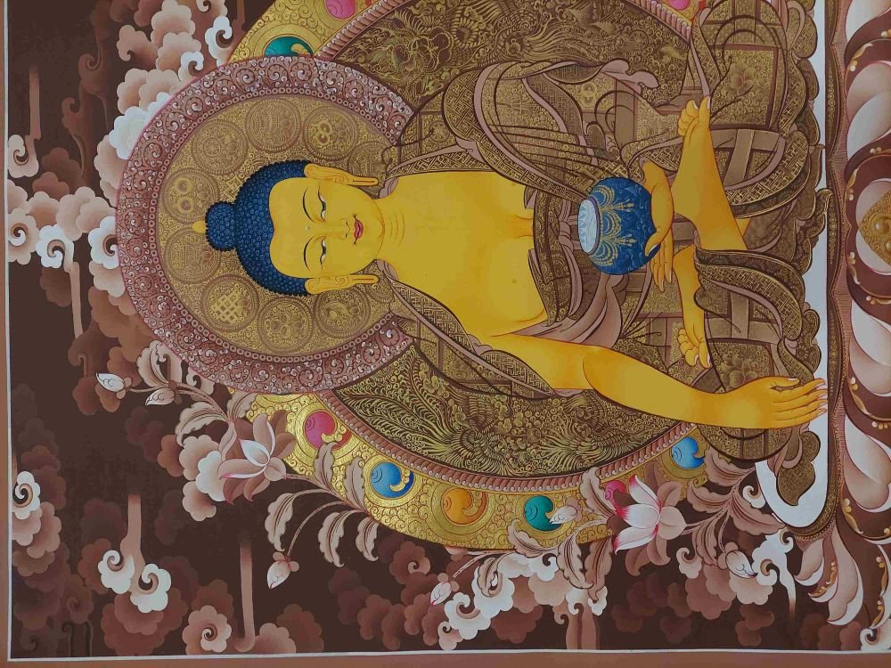 This thangka of Shakyamuni Buddha has real gold painted on its surface along with other paints. This is an ancient process of decorating the thangka in Tibetan Buddhism, Here gold is ground into gold dust, which is then mixed with other undisclosed material to make it paintable on the canvas. this mixture is then mixed with transparent glue and painted on the thangka. Read More