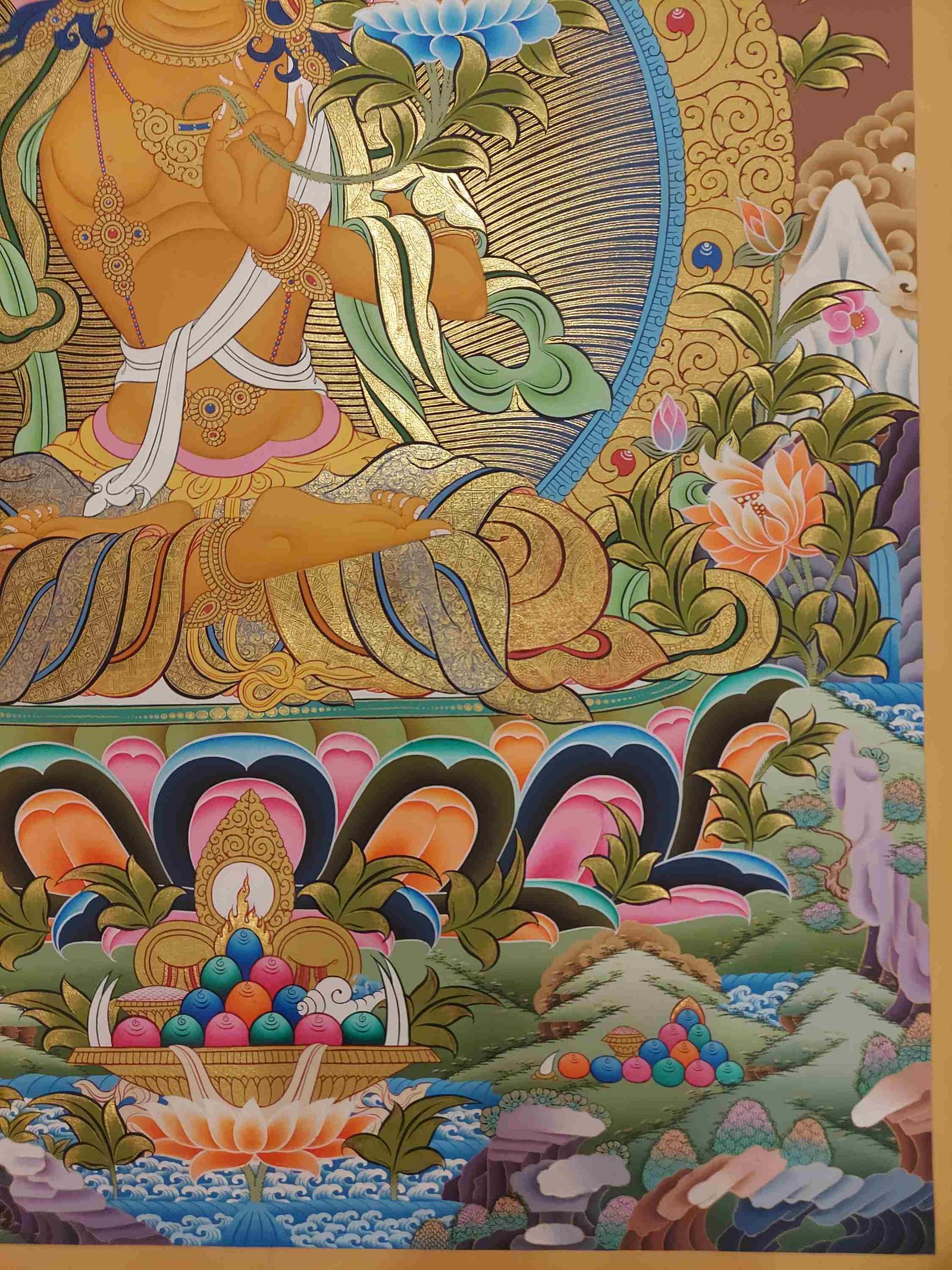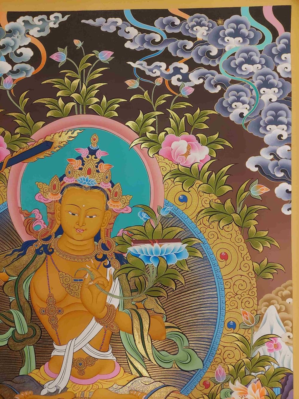 This thangka of Manjushri has real gold painted on its surface along with other paints. This is an ancient process of decorating the thangka in Tibetan Buddhism, Here gold is ground into gold dust, which is then mixed with other undisclosed material to make it paintable on the canvas. this mixture is then mixed with transparent glue and painted on the thangka. Read More