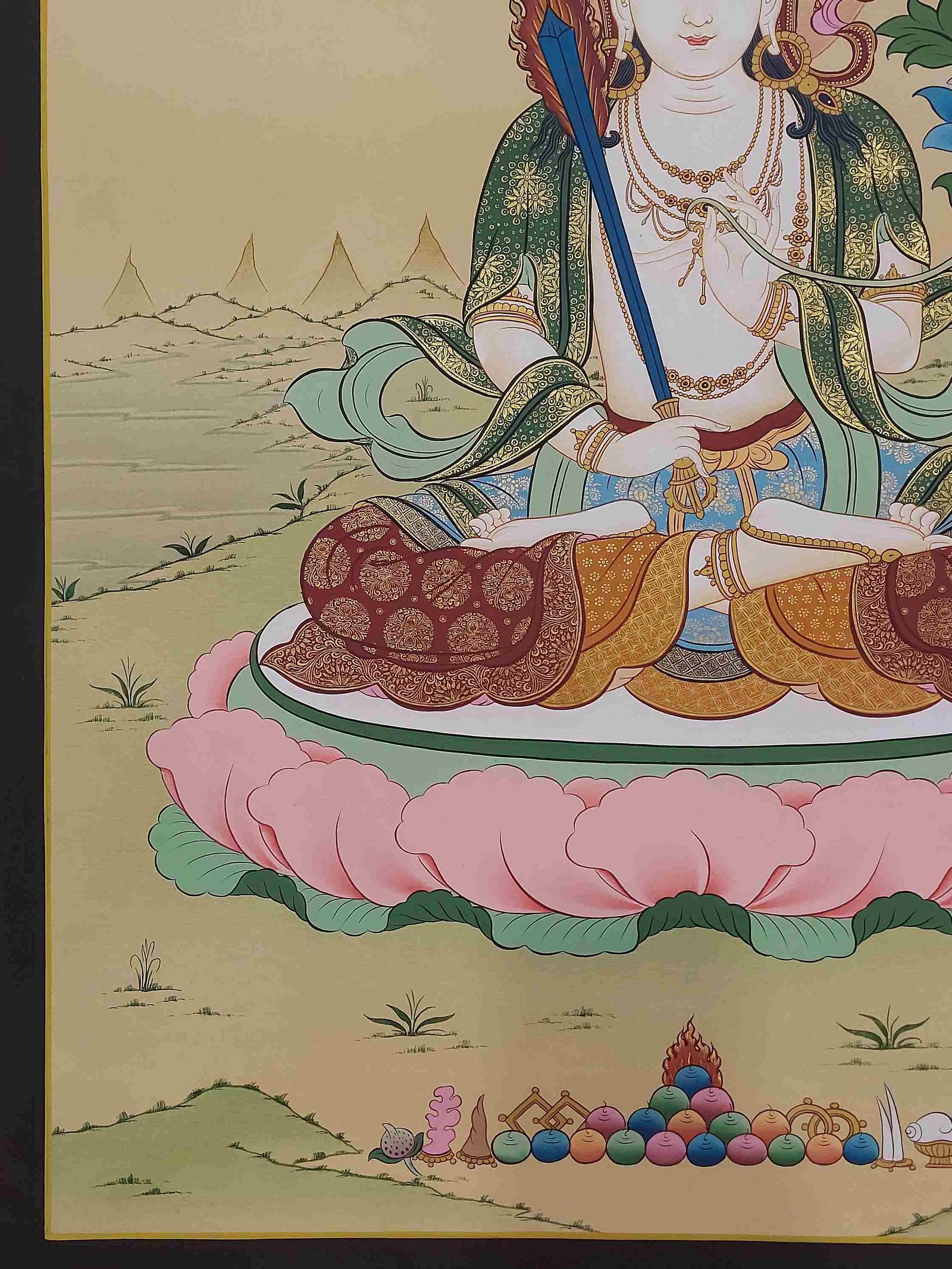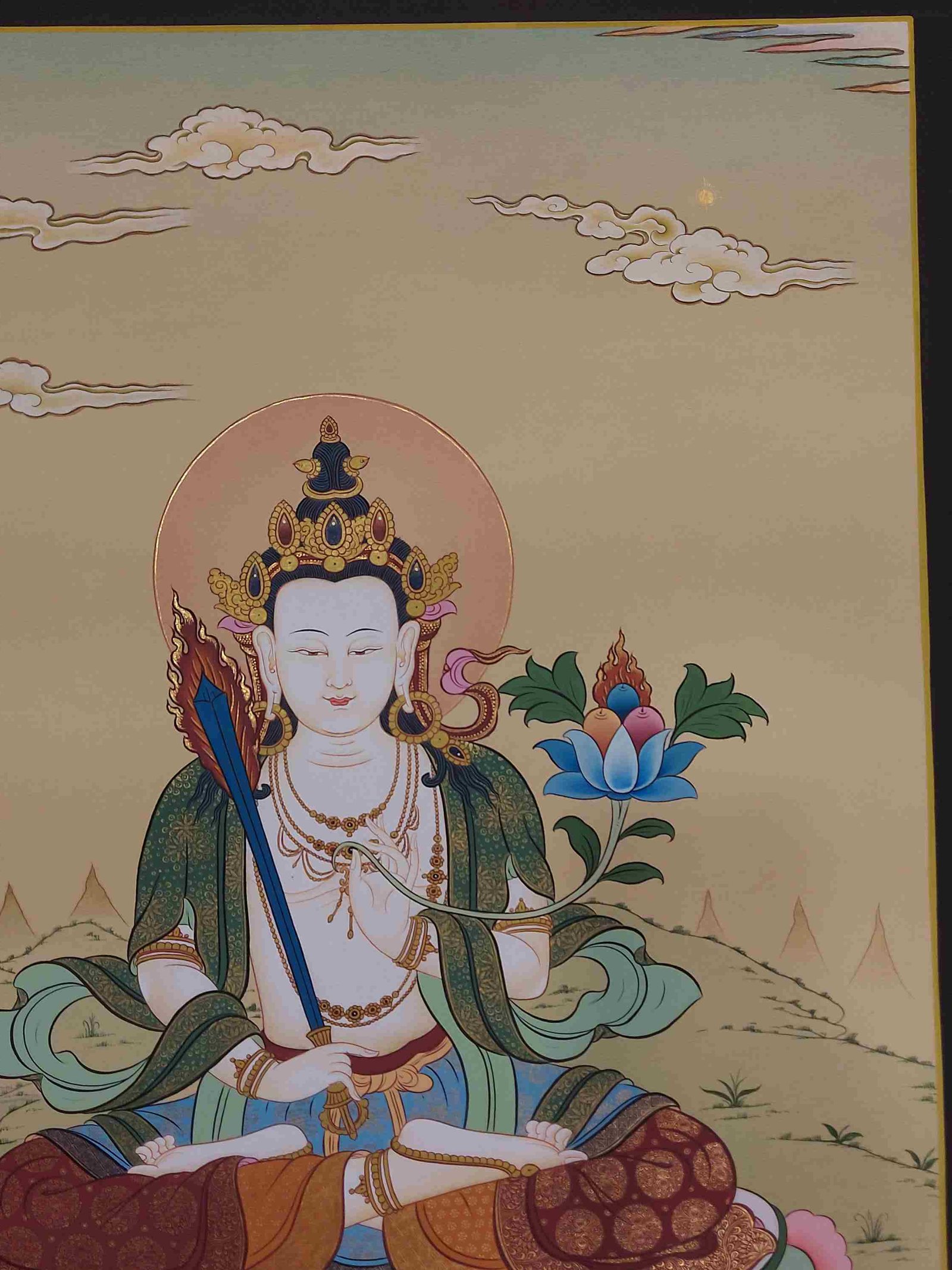 Manjushree is the Bodhisattva who holds the flaming sword [Skt. Khadga] of enlightenment, by his left hand in a warning( Tarjani) hand gesture ( Mudra) in his left hand representing his realization of wisdom to cut through ignorance & wrong view. His right hand depicted in teaching (Jnana Mudra) holds the stem of a Blue Lotus (Utpala) flower upon which rests the Book (Pustaka) of Perfection of Transcendental Wisdom. The blue lotus is a symbol of the victory of the spirit over the senses and signifies the wisdom of knowledge. This represents the lotus that he obtained from the middle of the lake in the Kathmandu Valley out of which grew a lotus bearing a Blue Flame which represents wisdom. Manjushree sits upon a moon disc upon a lotus with an elongated stem arising from a lake. He wears a gold diadem fitted with precious jewels. He wears a silk scarf fastened at the waist and over this, a softly glowing green scarf decorated with golden motifs. His head is silhouetted against a nimbus. The lotus he is sitting on has an elongated stem and arises from a lake representing his recovery of the blue flame of transcendent wisdom and the teaching he originated. The white sash is the attire of the Vajrayana school of Buddhism.