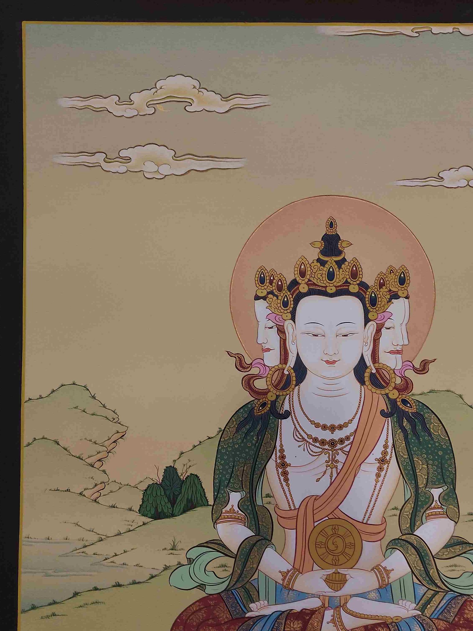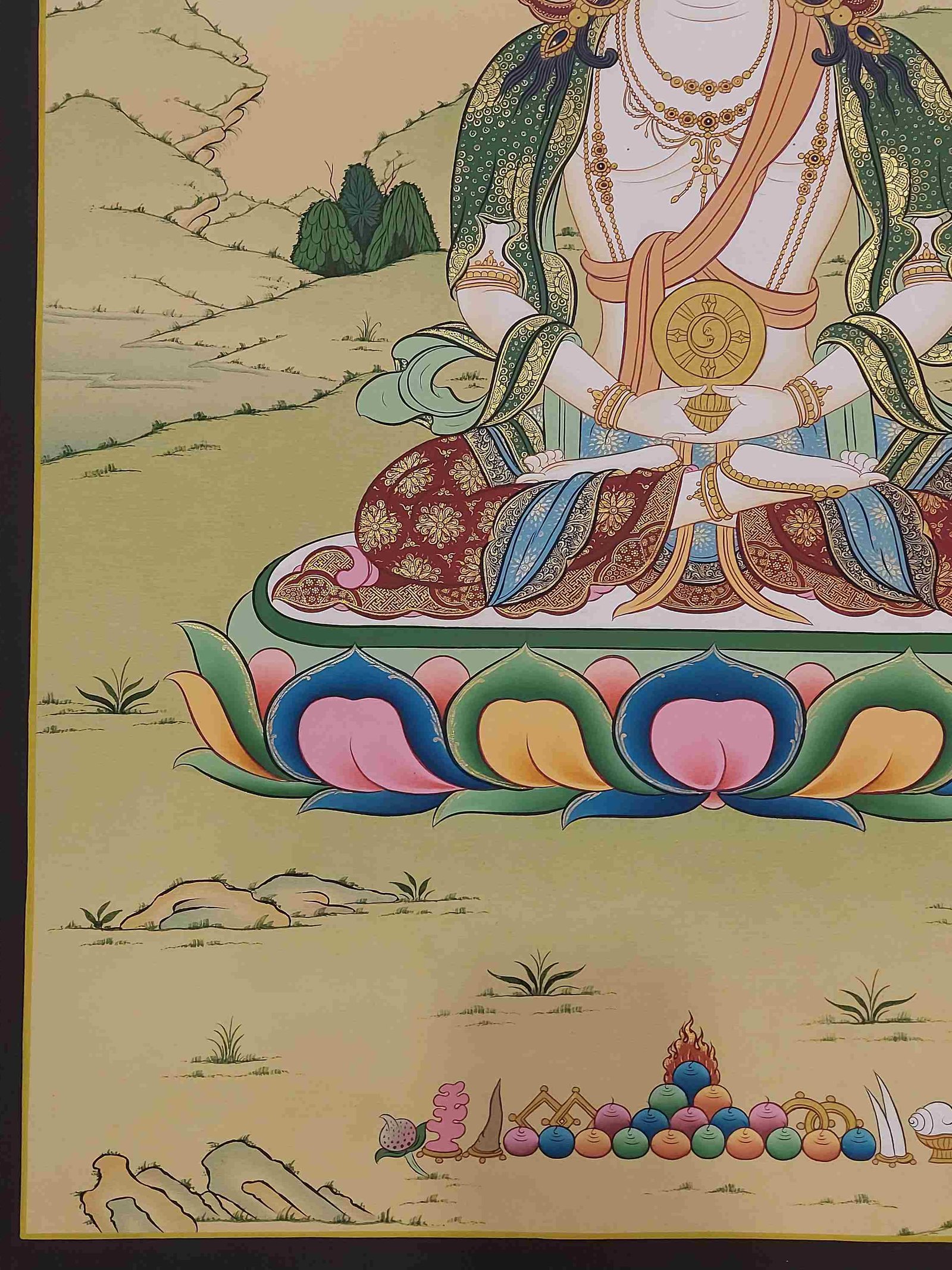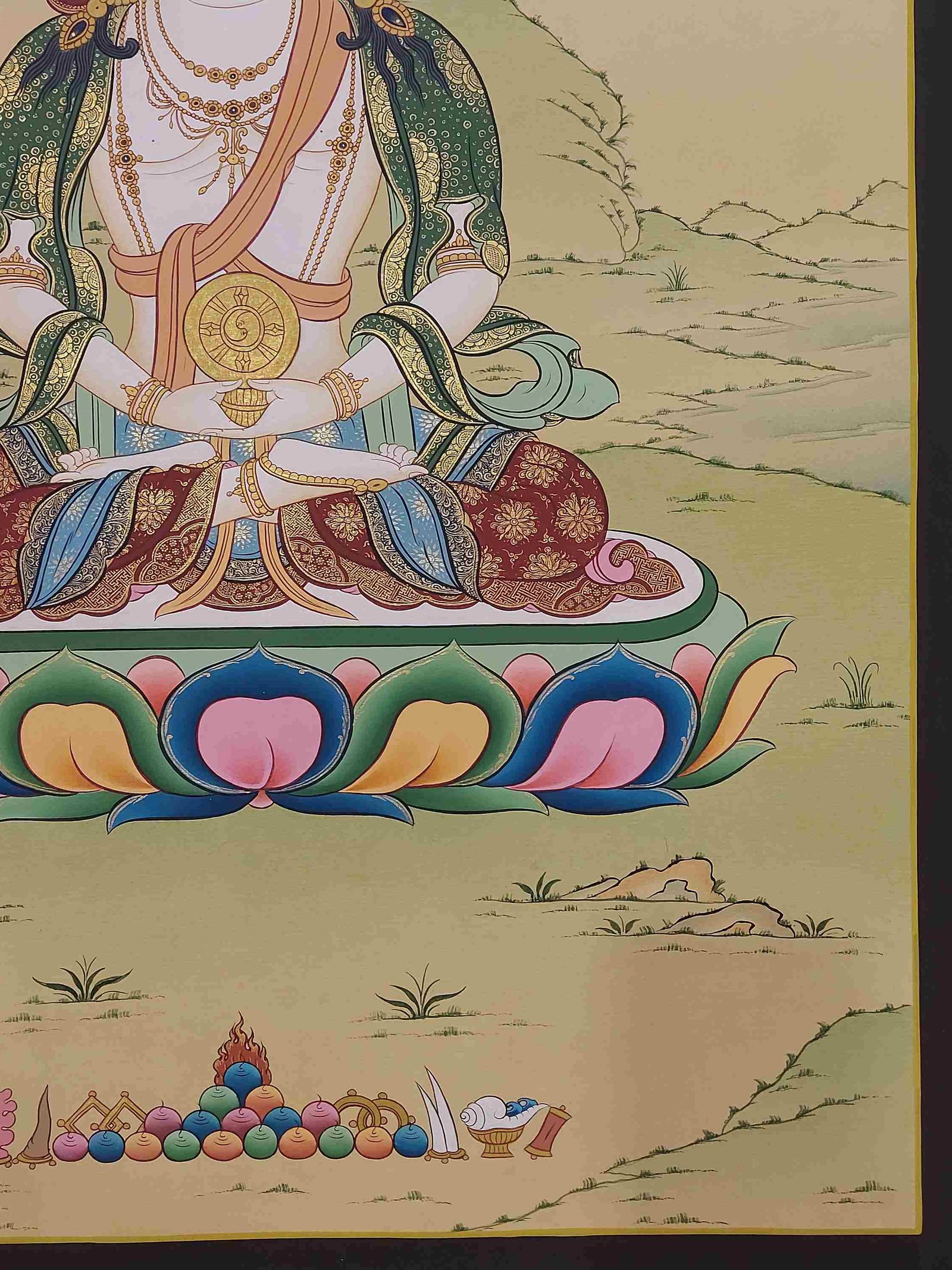 This thangka of Maha Vairochana has real gold painted on its surface along with other paints. This is an ancient process of decorating the thangka in Tibetan Buddhism, Here gold is ground into gold dust, which is then mixed with other undisclosed material to make it paintable on the canvas. this mixture is then mixed with transparent glue and painted on the thangka. Read More