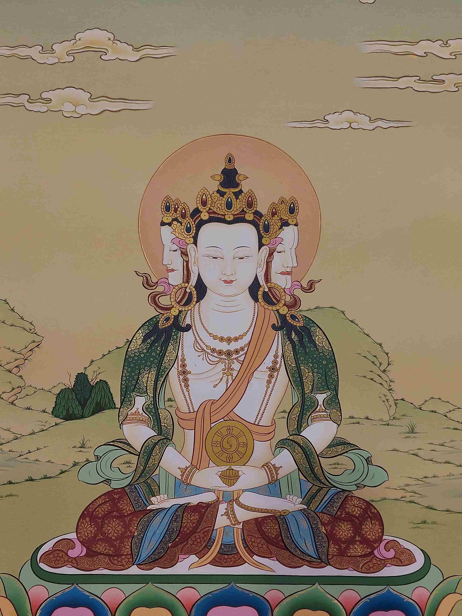In depictions of Maha Virochana Buddha, additional arms and hands often accompany the four heads. These hands hold various symbolic objects, such as a lotus flower symbolizing purity and spiritual realization, and a vajra symbolizing indestructible power and the union of compassion and wisdom. These symbolic objects represent the Buddha's qualities of compassion, wisdom, and enlightened activity, emphasizing his role as a guiding force in the spiritual journey of practitioners.