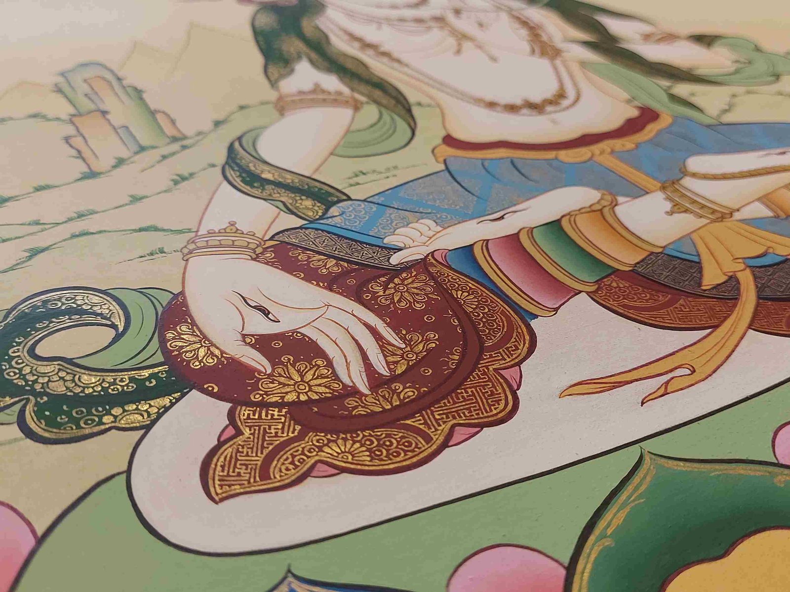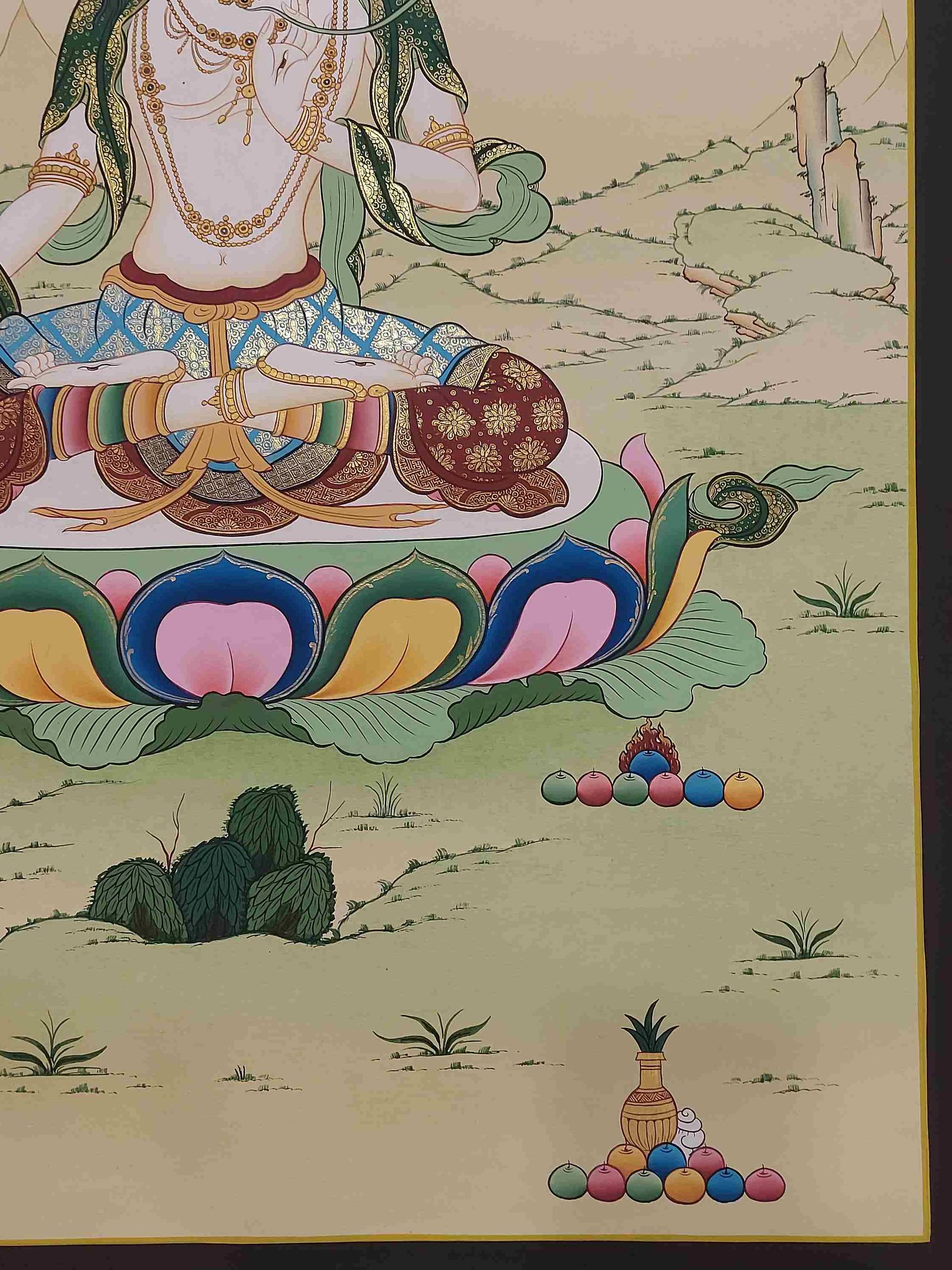 This thangka of White Tara has real gold painted on its surface along with other paints. This is an ancient process of decorating the thangka in Tibetan Buddhism, Here gold is ground into gold dust, which is then mixed with other undisclosed material to make it paintable on the canvas. this mixture is then mixed with transparent glue and painted on the thangka. Read More