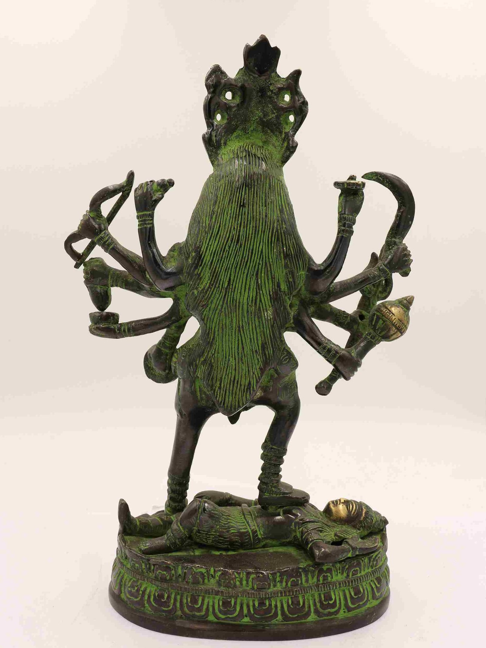 This is an antique patina-finished Kali. This is not an antique statue. It is just an antique patina finish. This Kali is a testament to the artisan's mastery of the art of aging. Its antique patina has been meticulously crafted to give the appearance of an aged statue, showcasing the artist's unique techniques and skills. Through undisclosed processes and careful aging treatments, the Kali undergoes a transformation that captures the essence of time and history. Read More