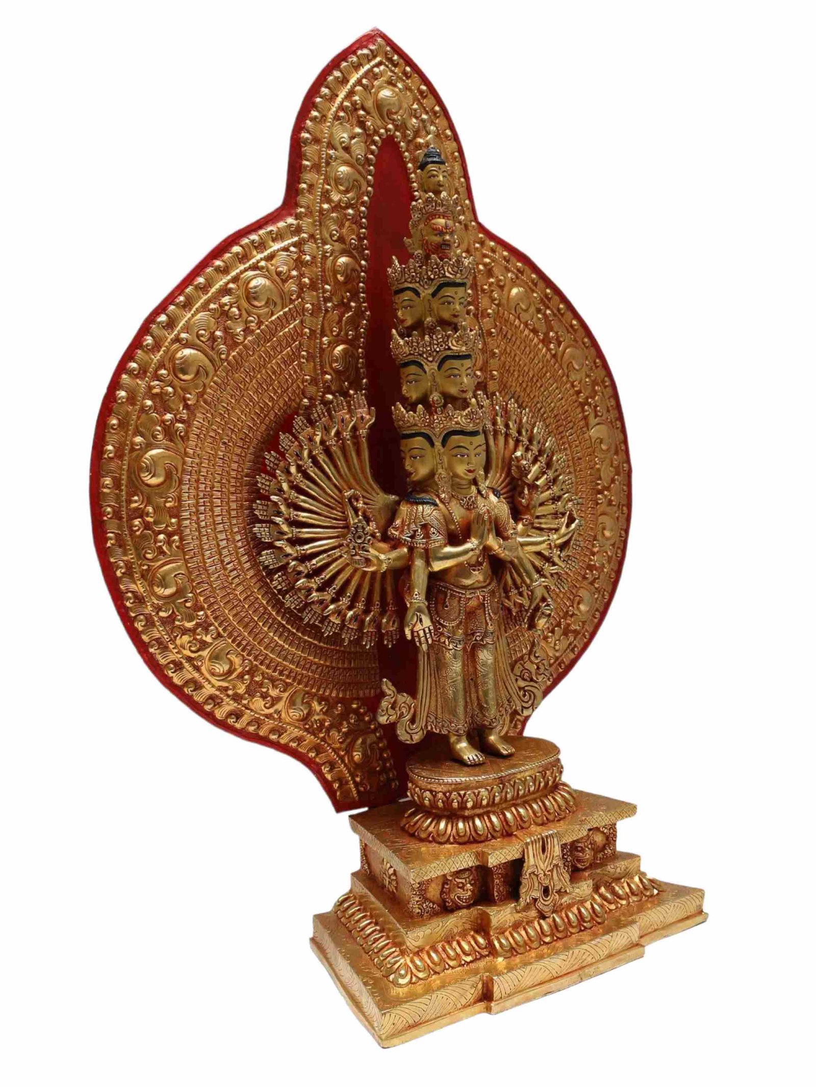 Buddhist Handmade Statue of Sahasrabhuja Avalokitesvara, Full Fire Gold Plated, with Painted Face |