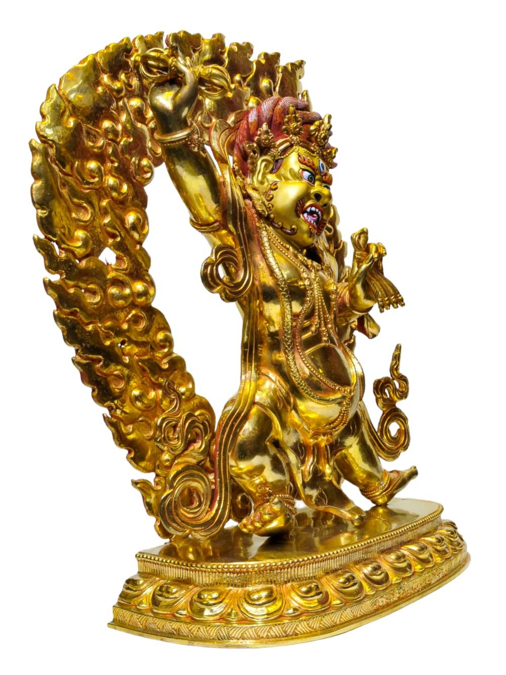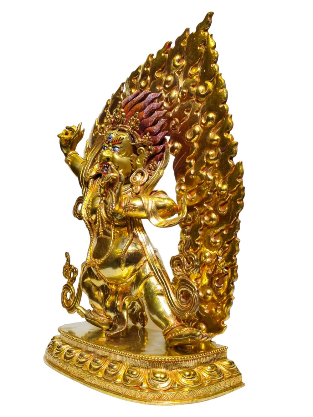 Buddhist Statue of Vajrapani Chana Dorje, Chana Dorje, Full Gold Plated, Antique Finishing with Painted Face , Protector of Buddha’s teachings, symbolizing power and fearlessness