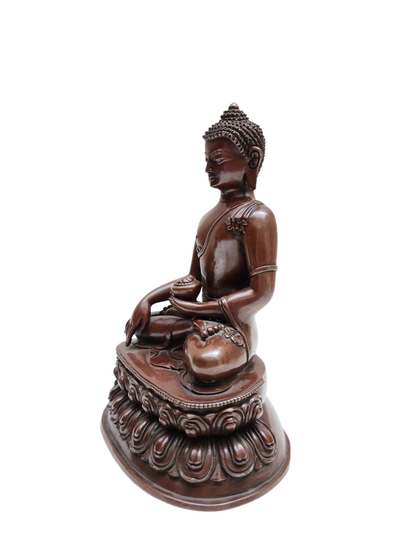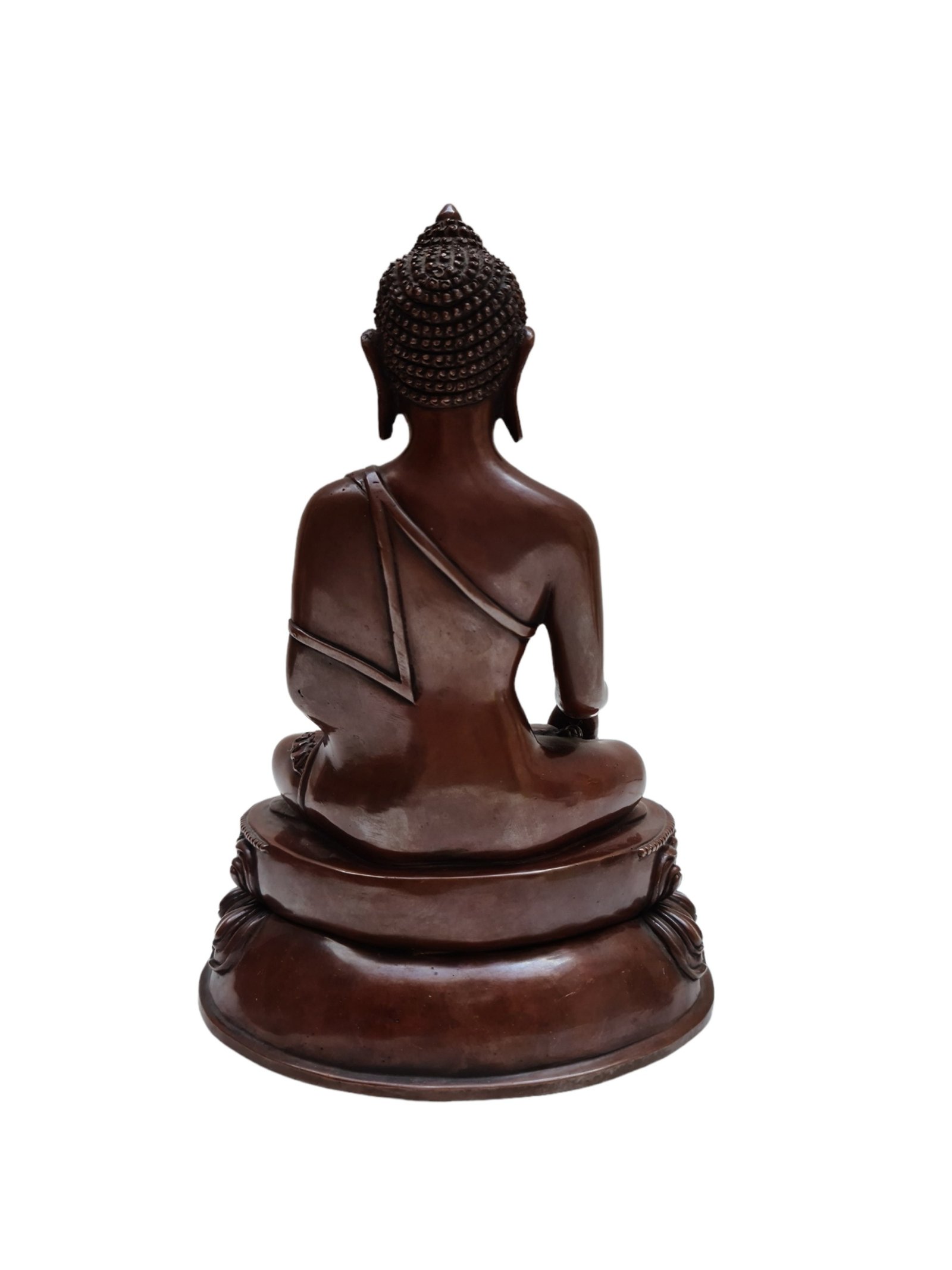 This Shakyamuni Buddha has been meticulously treated with a chocolate color antique patina. The intention behind this patina is to replicate the appearance of a copper statue that has gracefully aged over a century. Unlike a simple coat of paint, this patina is not applied superficially and is designed to endure. It undergoes an artificial oxidation process that adds depth and character, while also serving as a protective layer against natural oxidation.