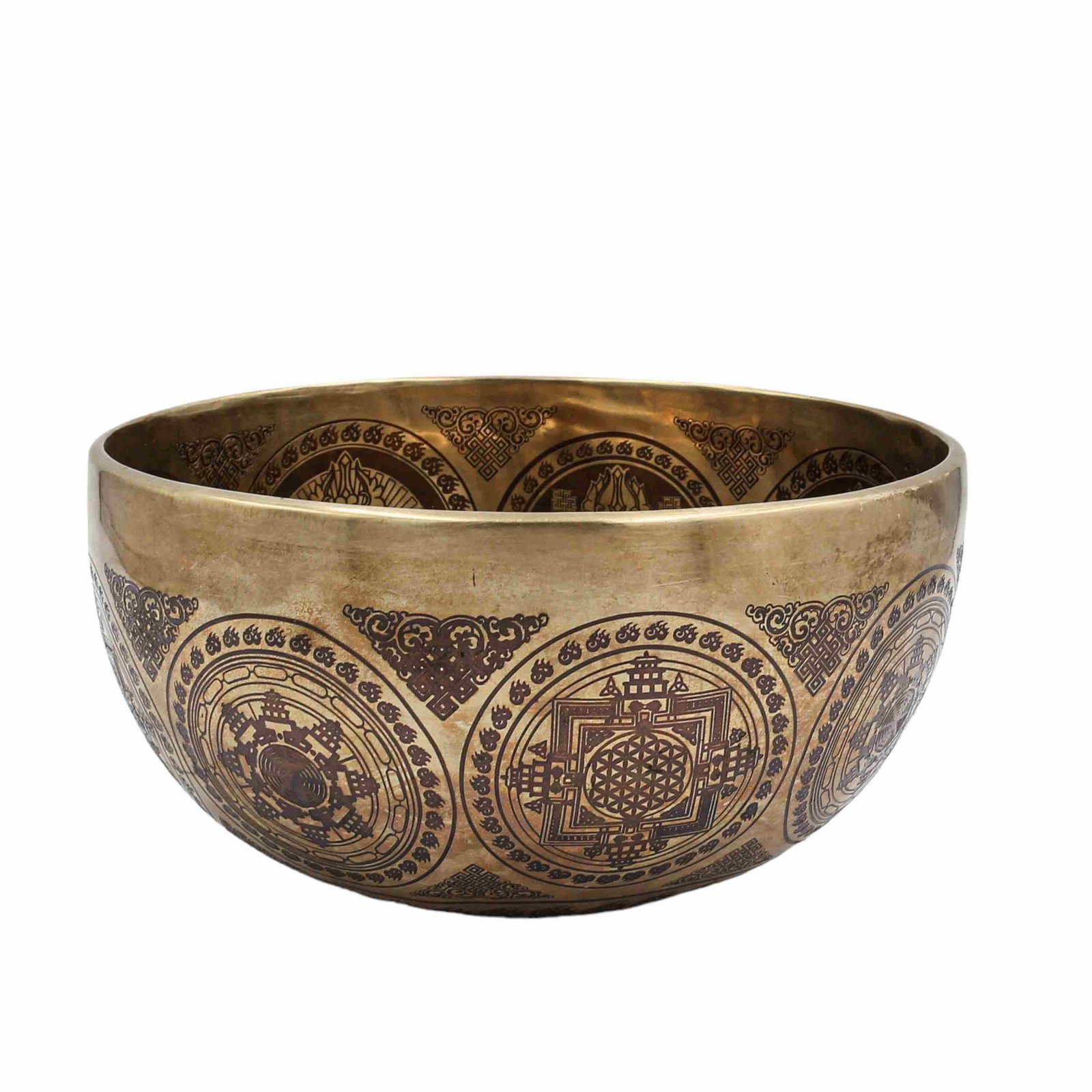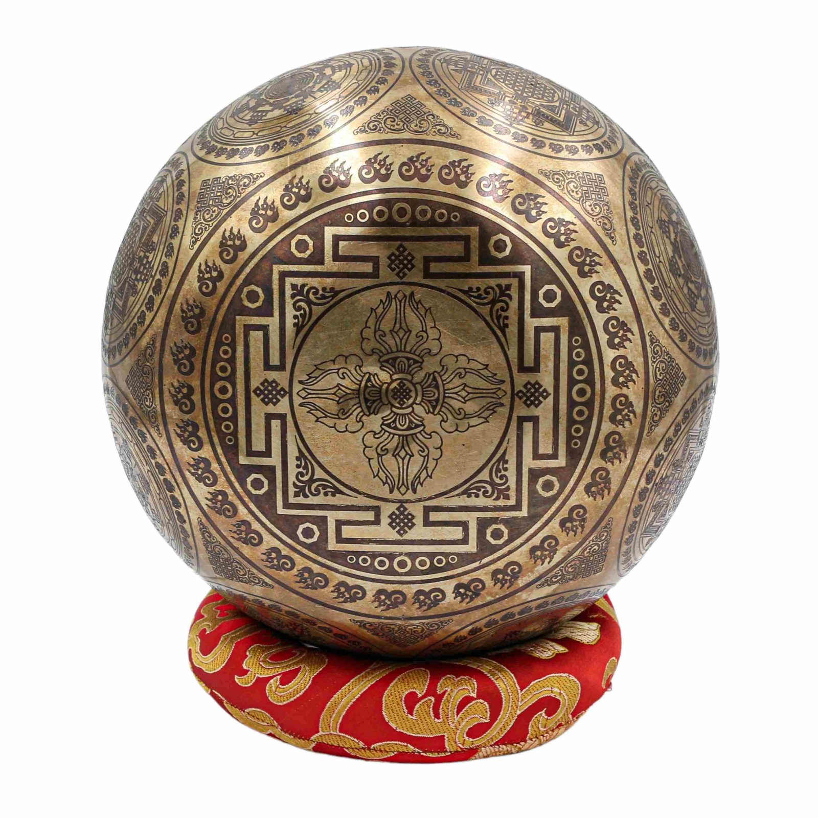 Buddhist Hand Beaten Jambati Singing Bowl, with Super Fine Etching Carving Antique, Select Accessories |