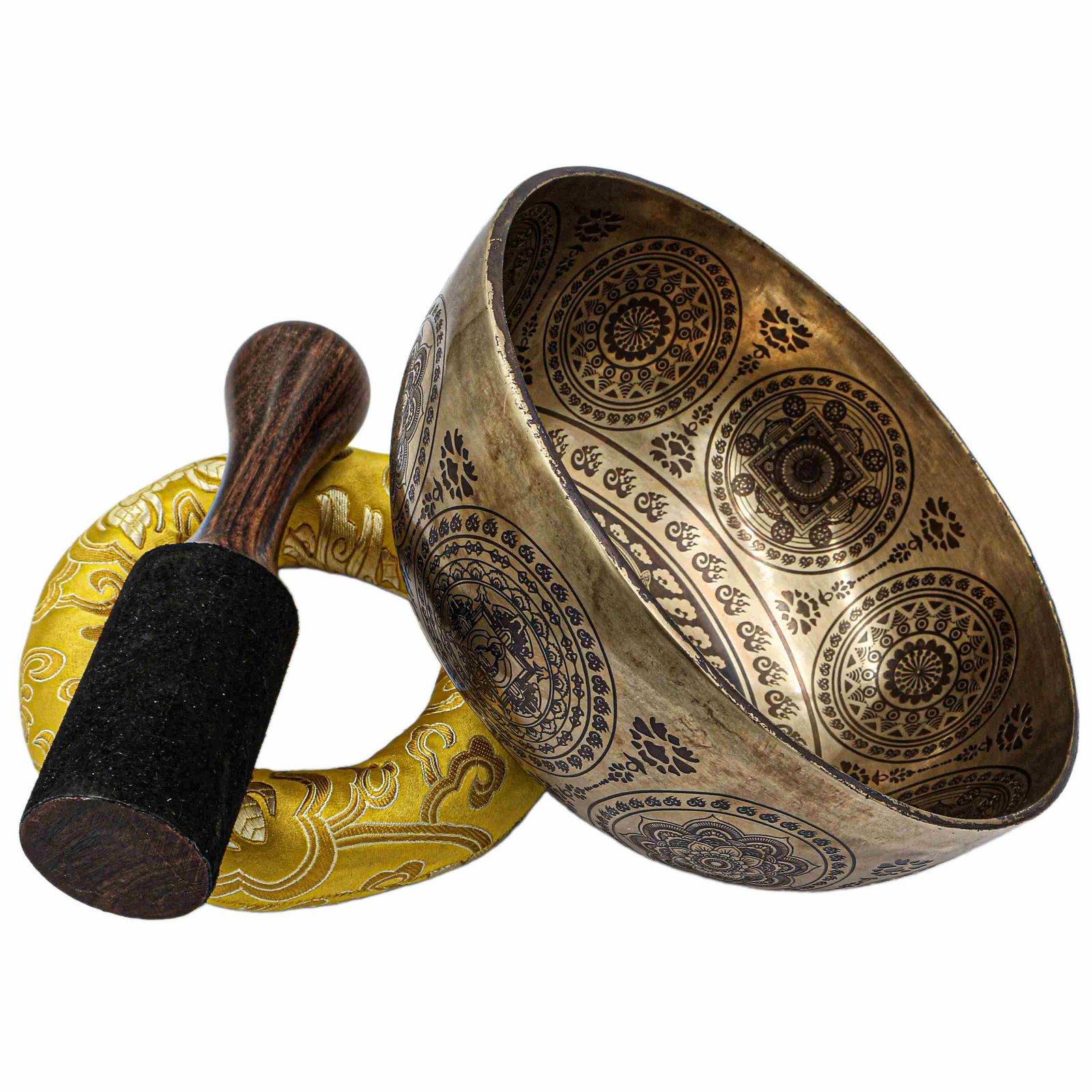 Buddhist Hand Beaten Jambati Singing Bowl, with Super Fine Etching Carving Antique, Select Accessories |