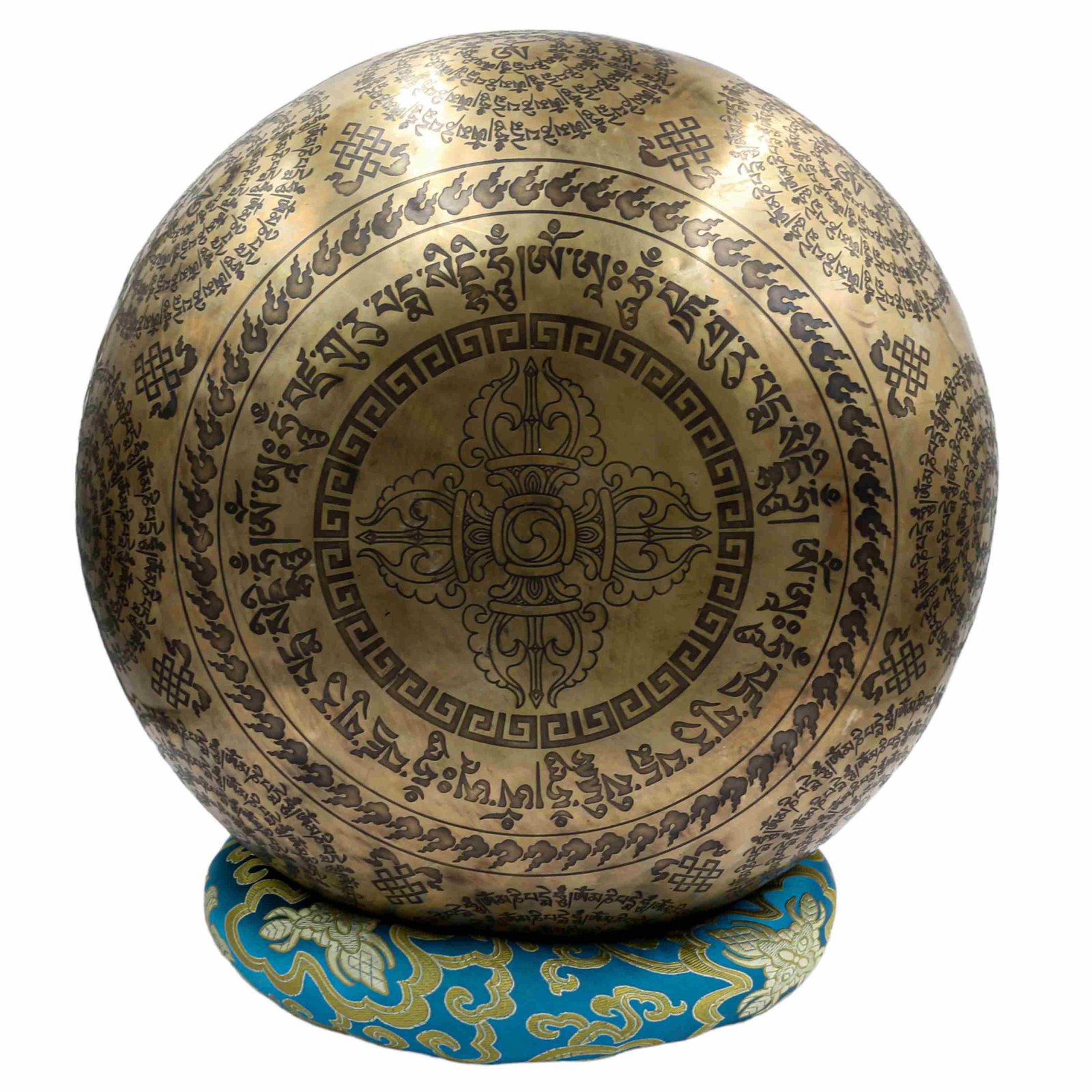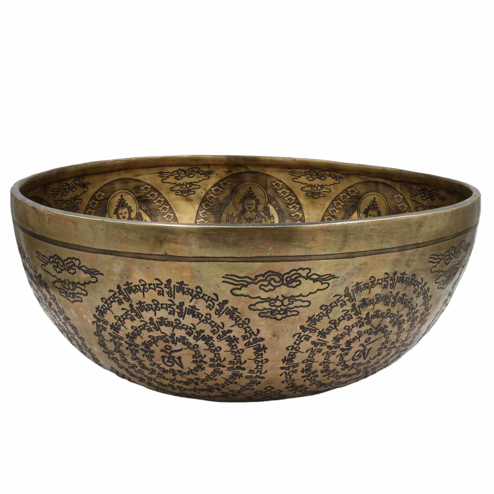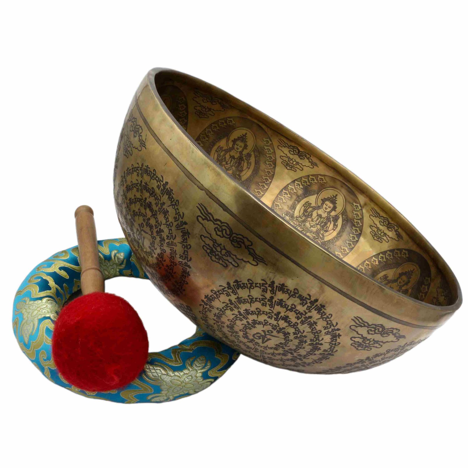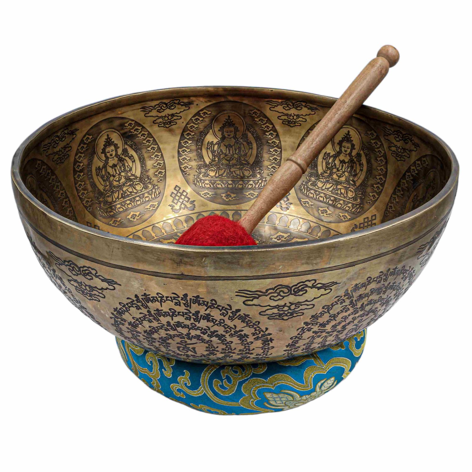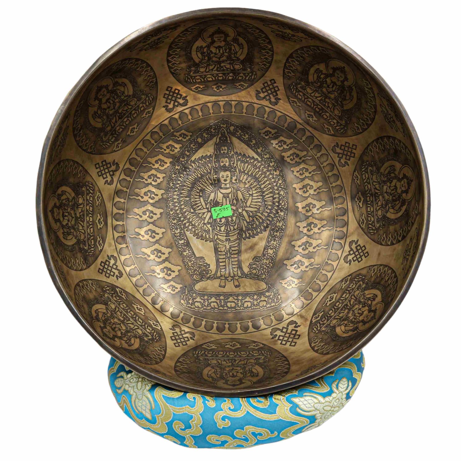 Buddhist Hand Beaten Jambati Singing Bowl, with Super Fine Etching Carving of 108 Hand Sahasrabhuja Avalokitesvara, Select Accessories |