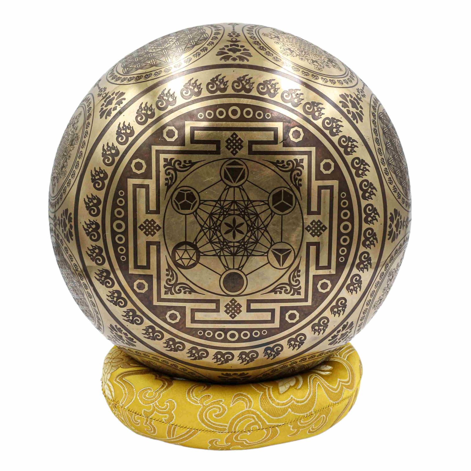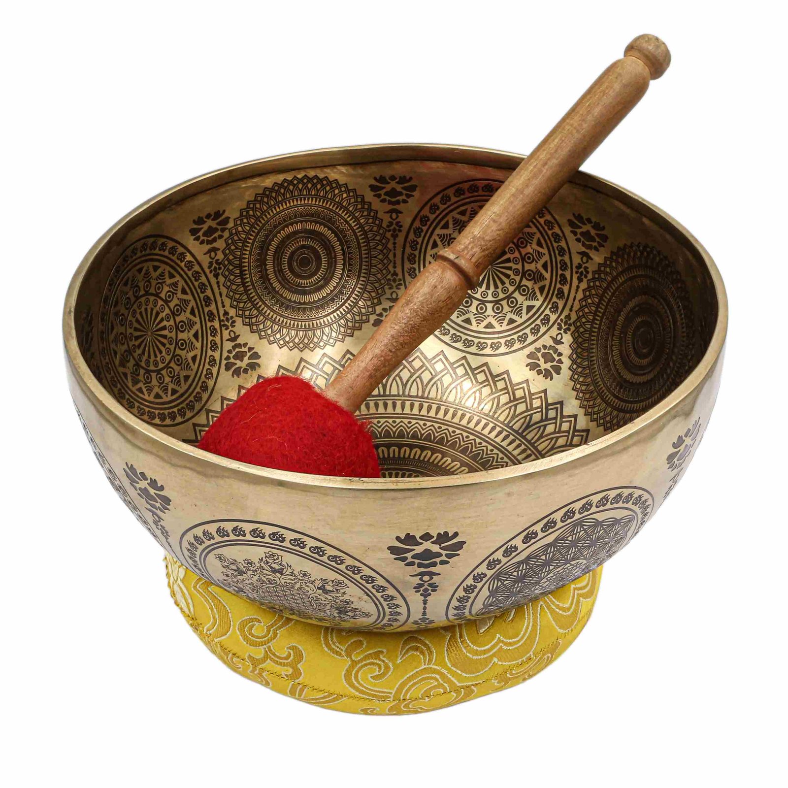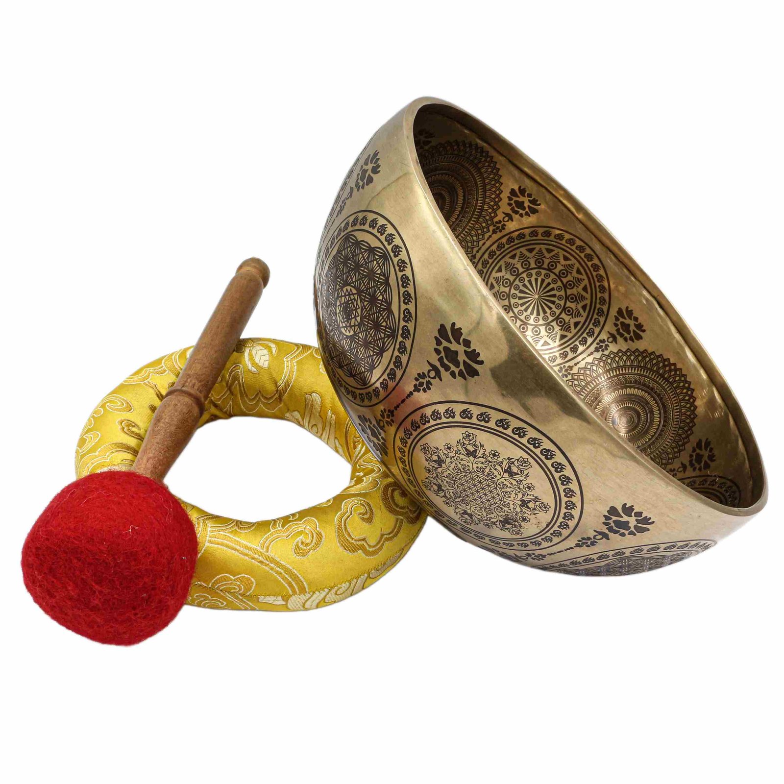 Buddhist Hand Beaten Jambati Singing Bowl, with Super Fine Etching Carving, Select Accessories |