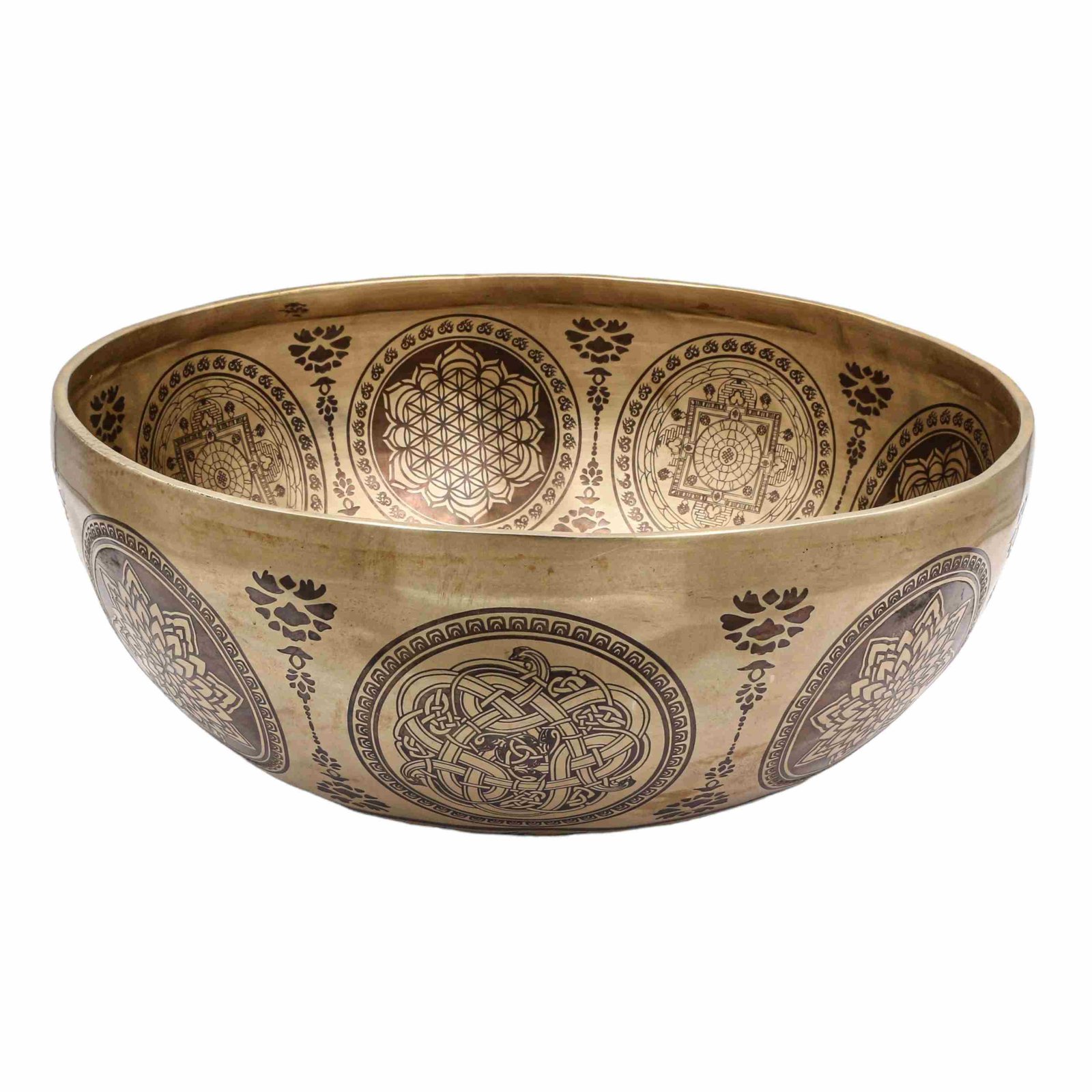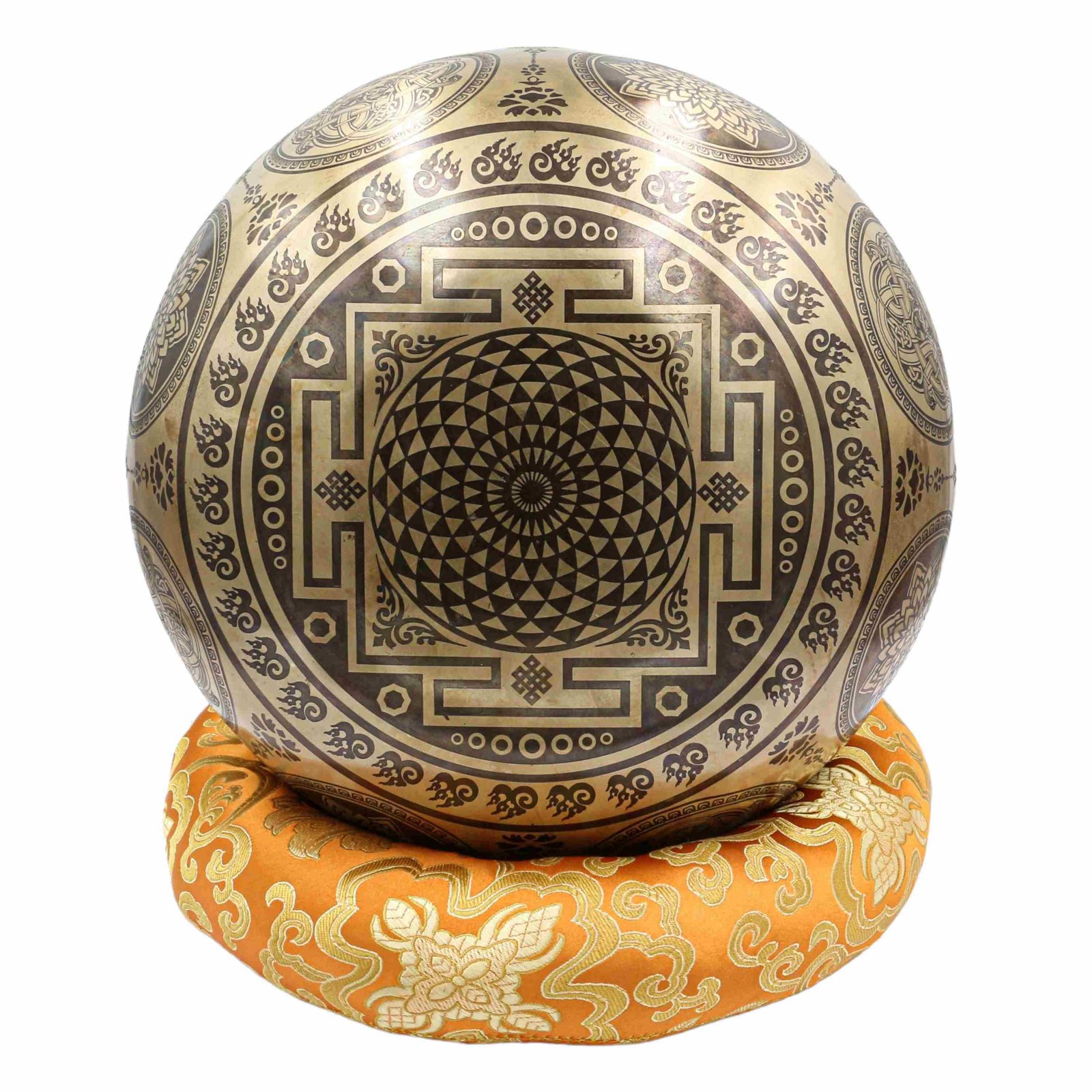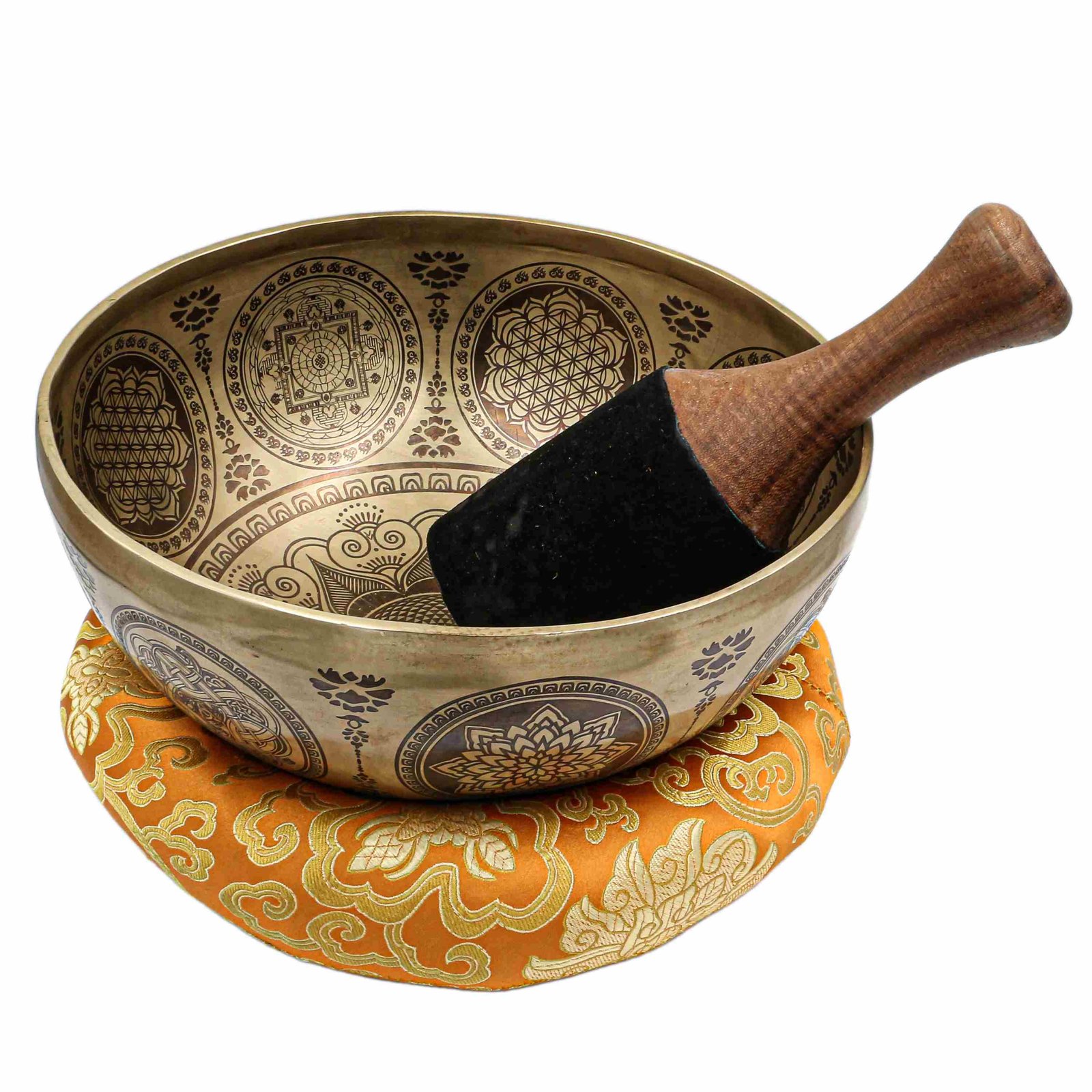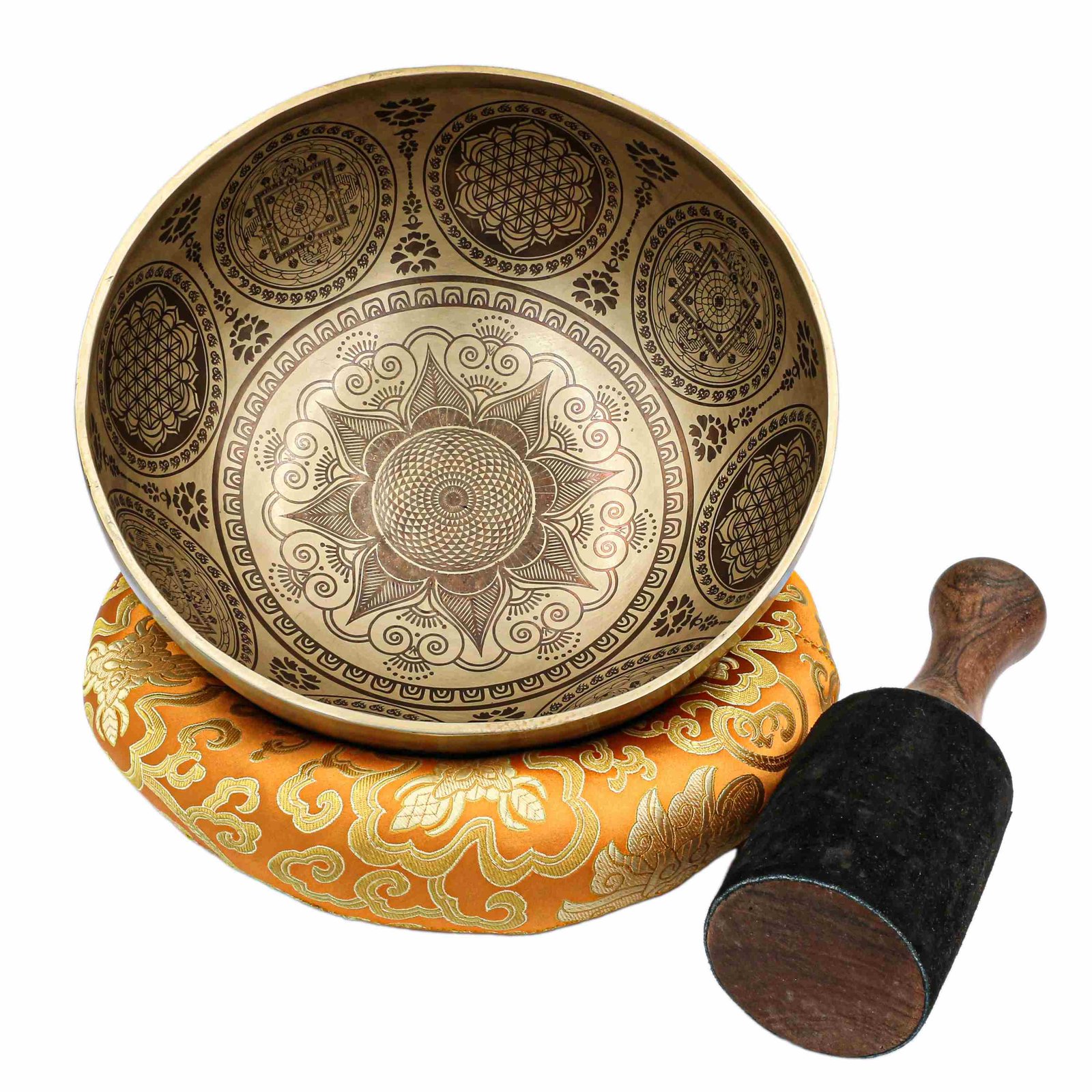 Buddhist Hand Beaten Jambati Singing Bowl, with Super Fine Etching Carving, Flower Design, Select Accessories |