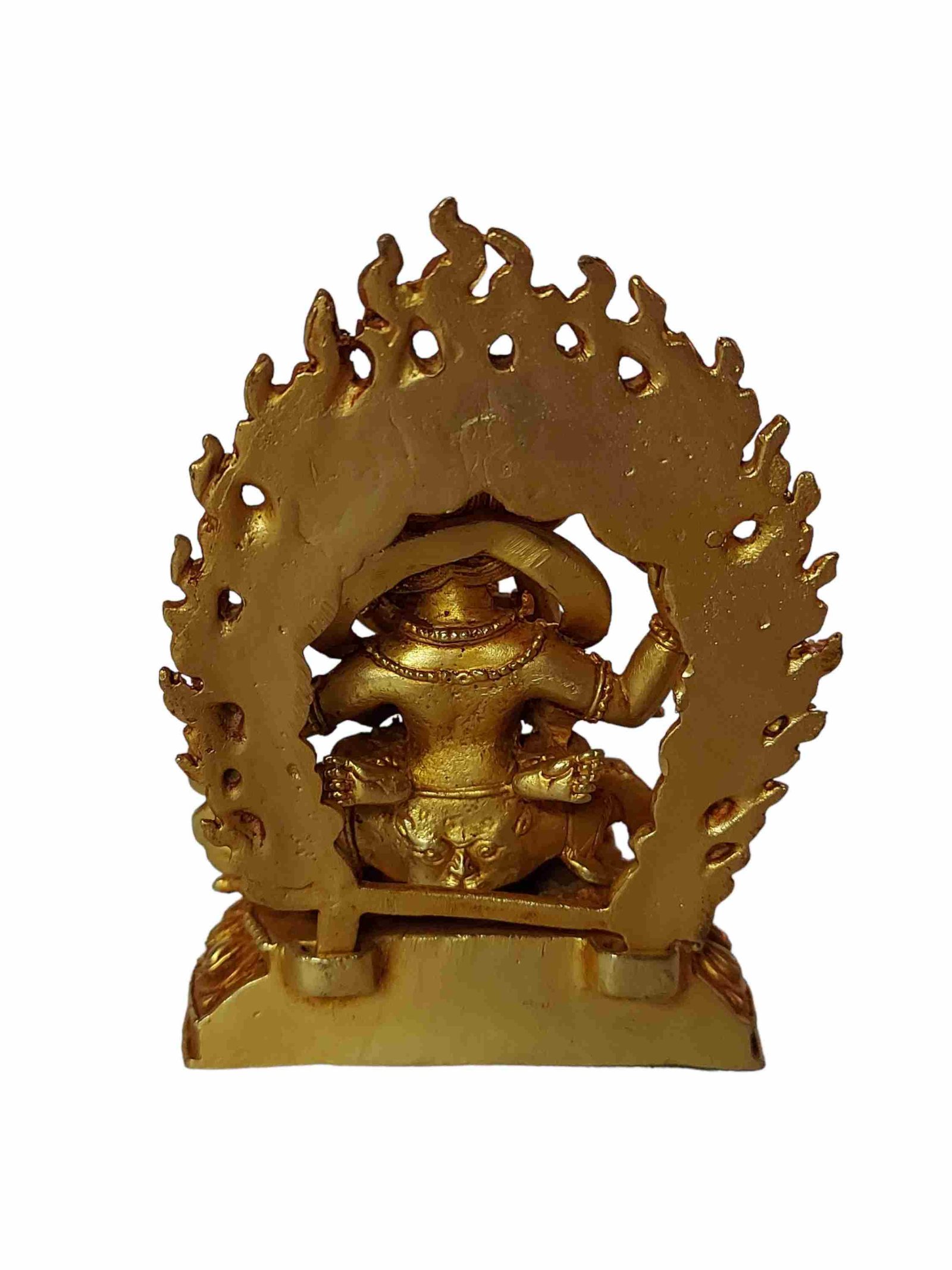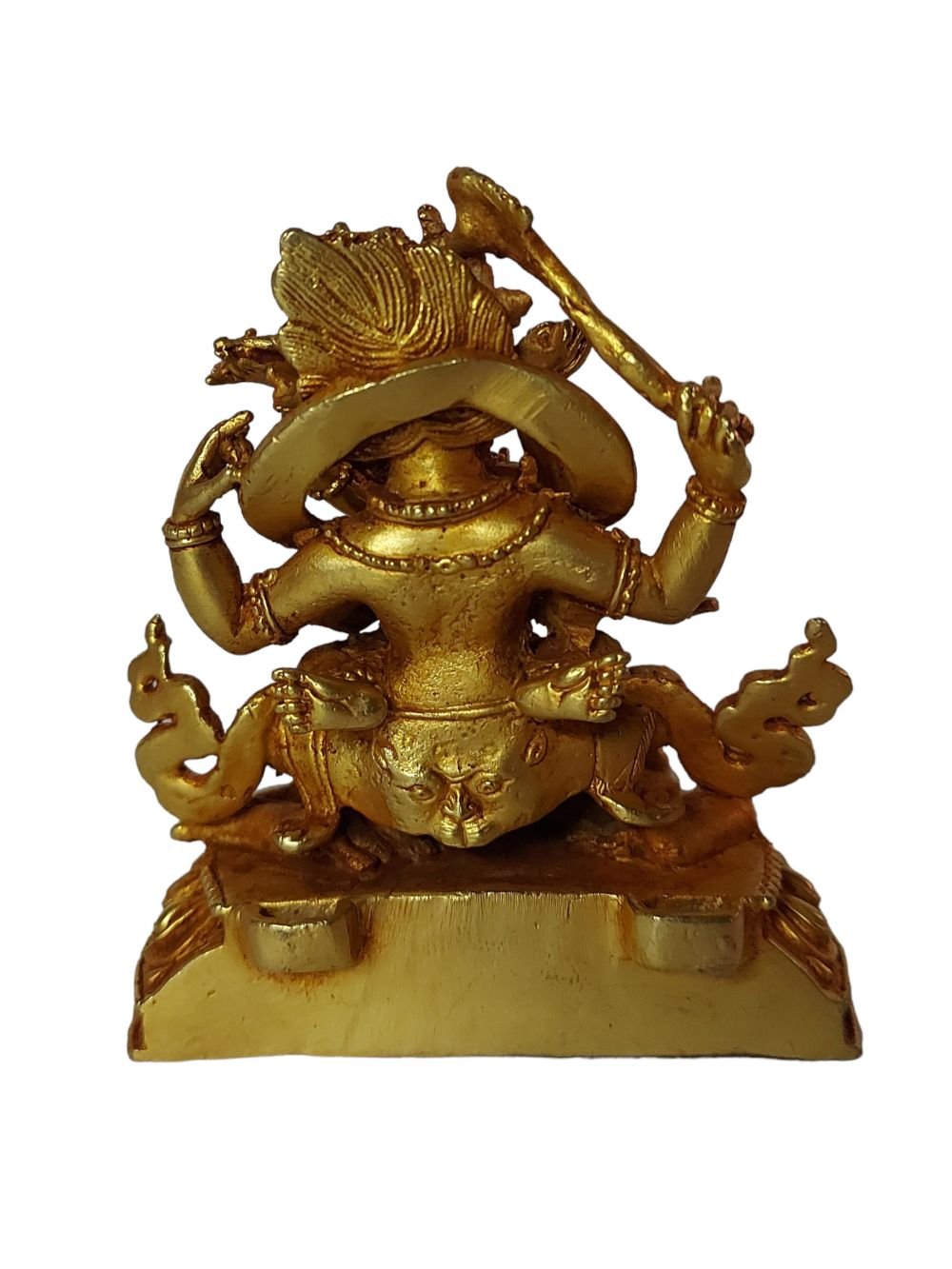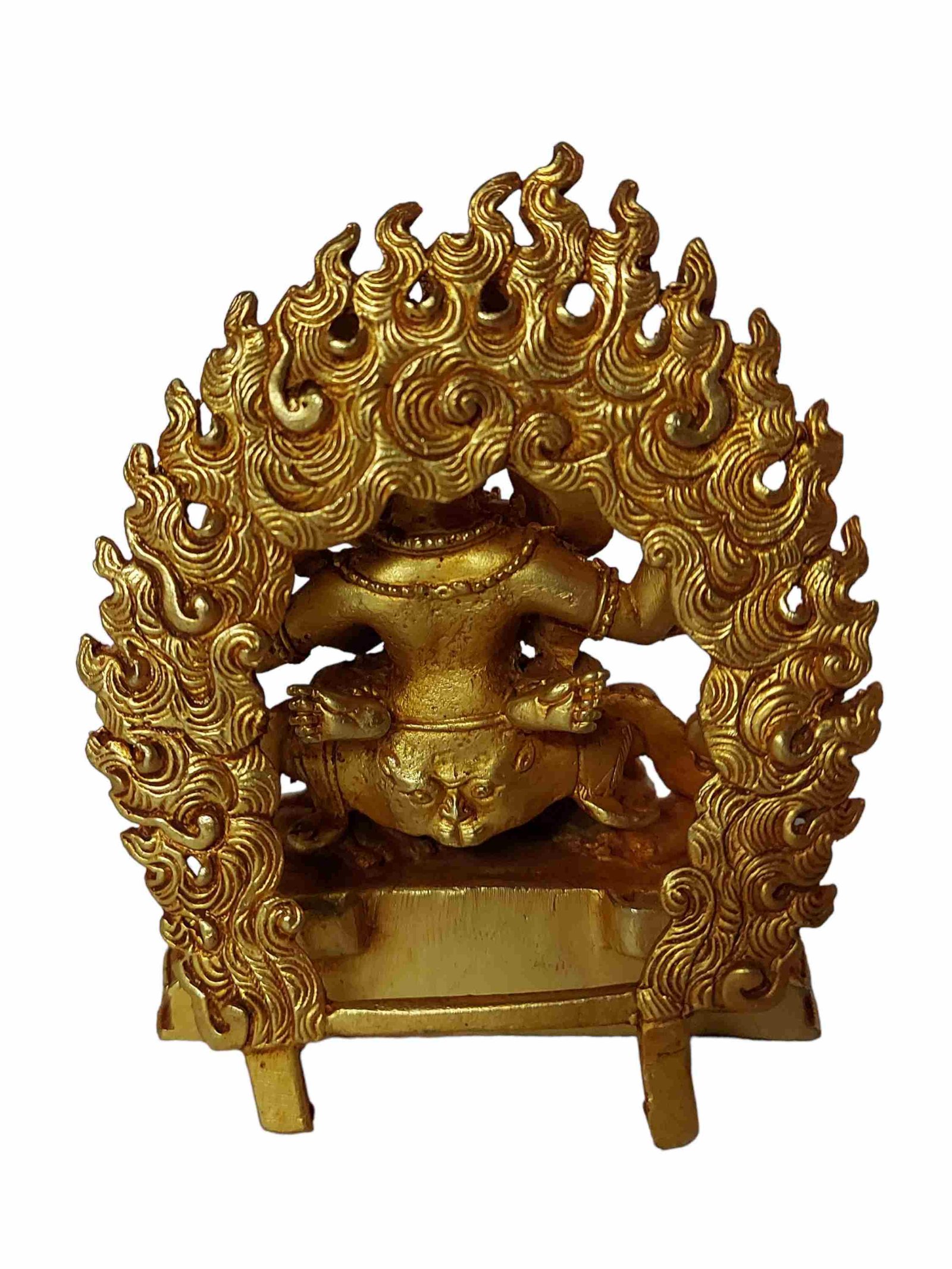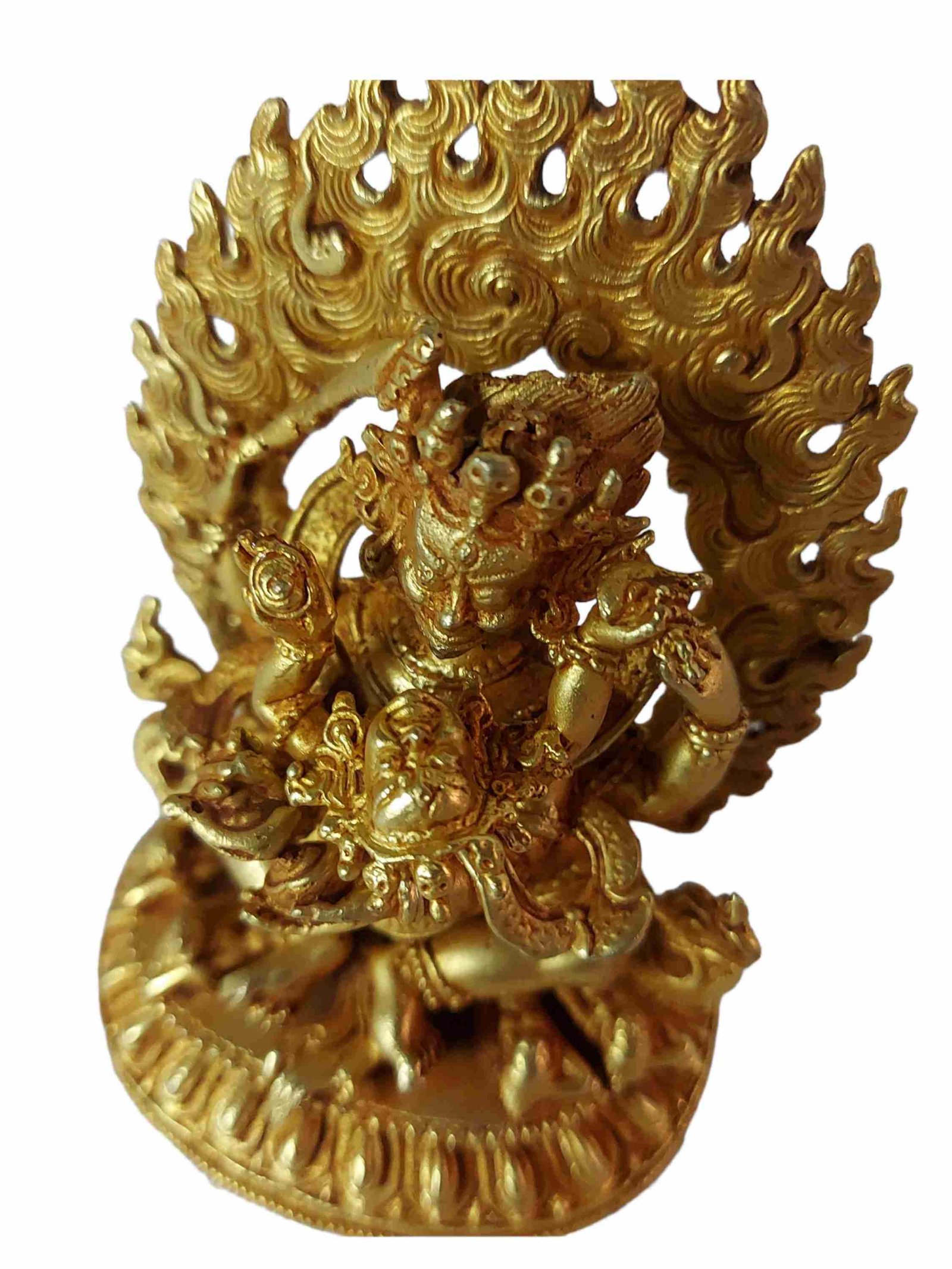 The Mahakala Four Arms has full gold plated antique finishing. This finishing is a combination of fire mercury gold plating and antique finishing. This traditional technique involves the application of a genuine layer of gold onto the Mahakala Four Arms using the time-honored process of mercury gold plating. Skilled artisans meticulously handle the amalgamation of gold with mercury, ensuring precise application and a truly authentic result. To enhance its charm further, the Mahakala Four Arms undergoes an antique finishing process. This meticulous treatment adds a touch of age and character to the gold plating, creating a sense of antiquity. Through careful craftsmanship and the application of specialized techniques, the Mahakala Four Arms acquires a beautifully aged appearance that adds depth and uniqueness to its overall aesthetic. Read More