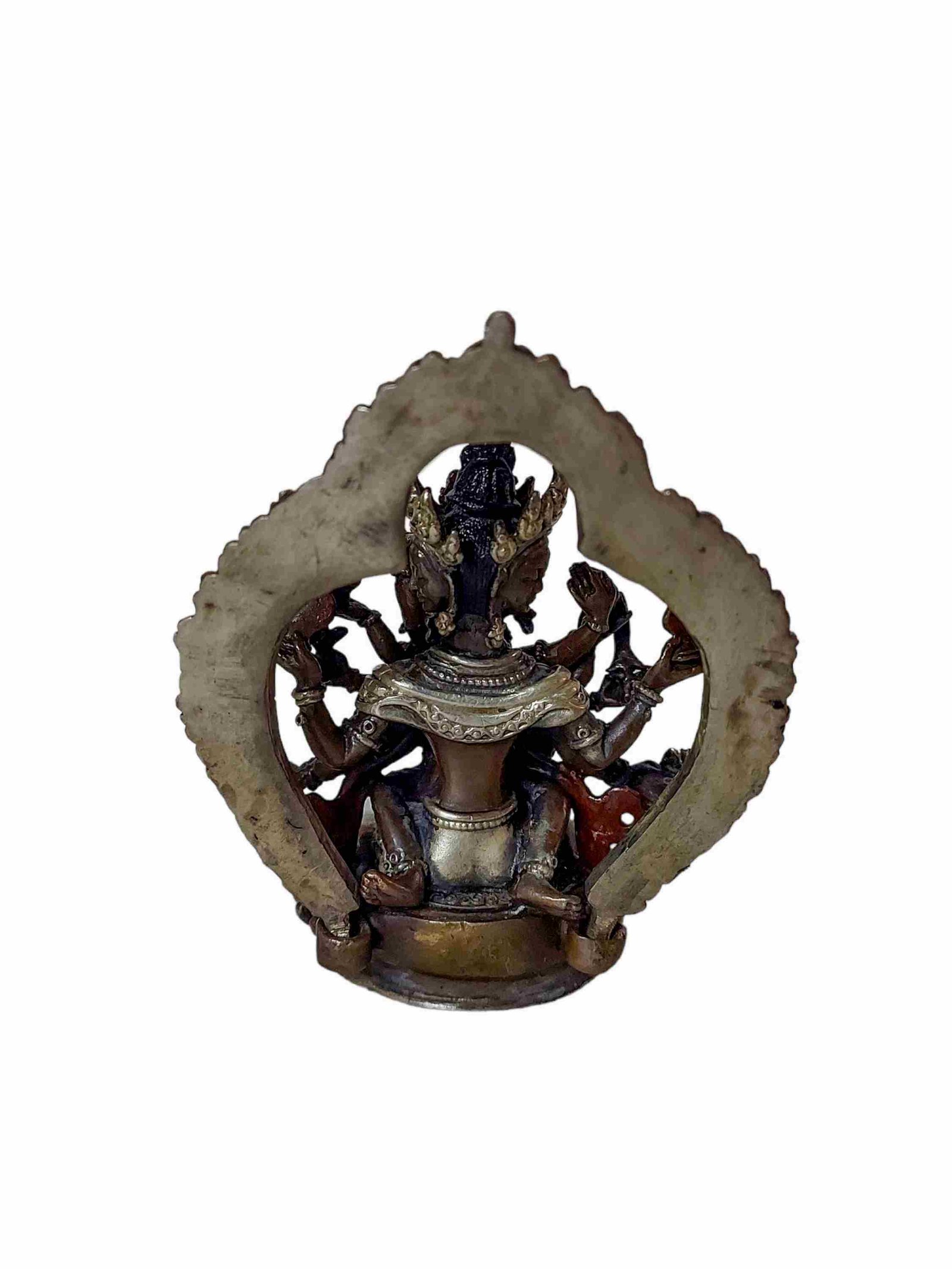 The Guhyasamaja features a captivating combination of partly silver plating and dark oxidation. This unique finishing technique combines the lustrous shine of silver with the rich, deep tones achieved through oxidation. In the process of creating this finish, selected areas of the Guhyasamaja are expertly silver-plated, creating a radiant and reflective surface that catches the light. The remaining areas are intentionally oxidized, resulting in a darkened patina that adds depth and character to the piece. Read More