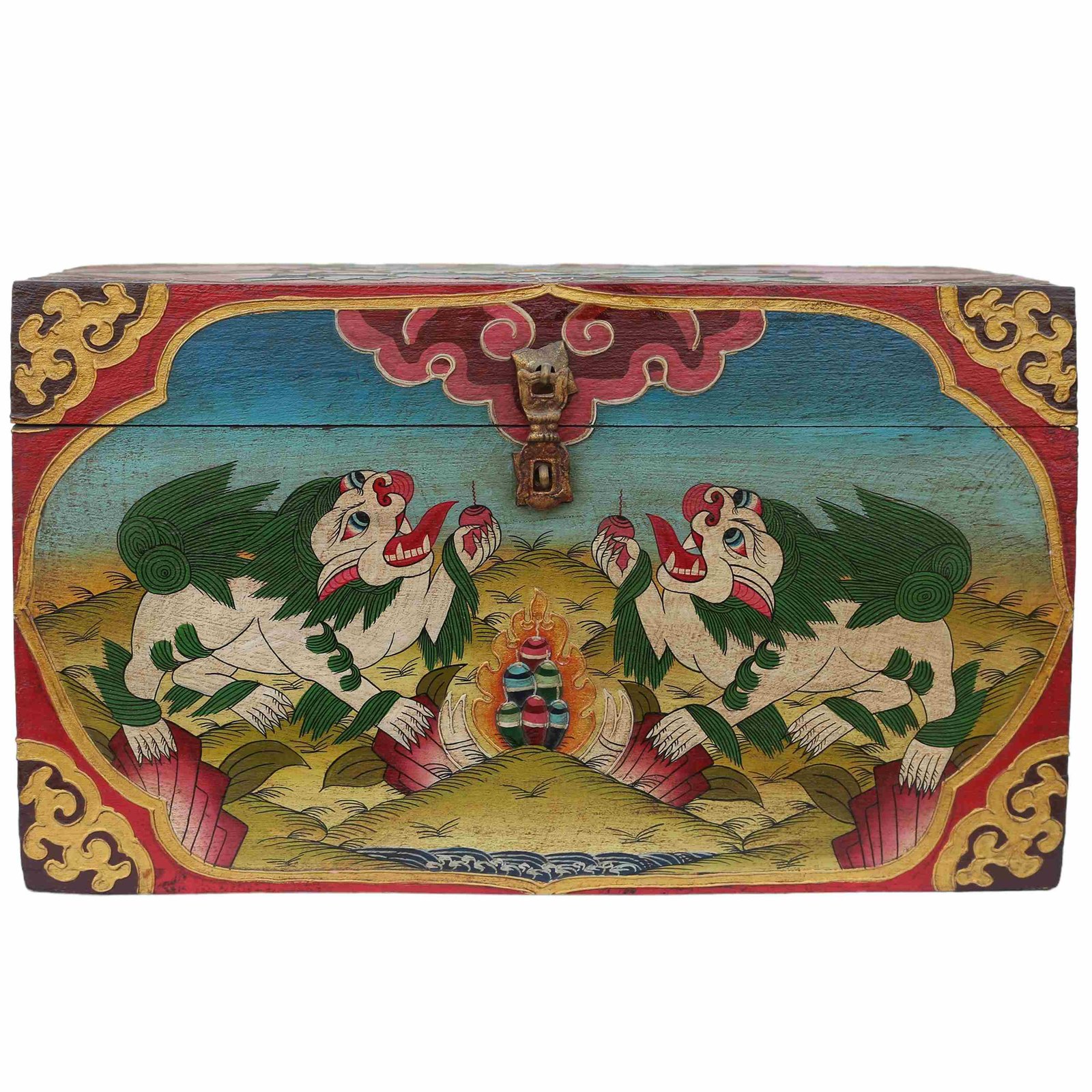 Traditional Tibetan, Ritual Jeweler and Ritual Item Box, Painted with Snow Lion Design |