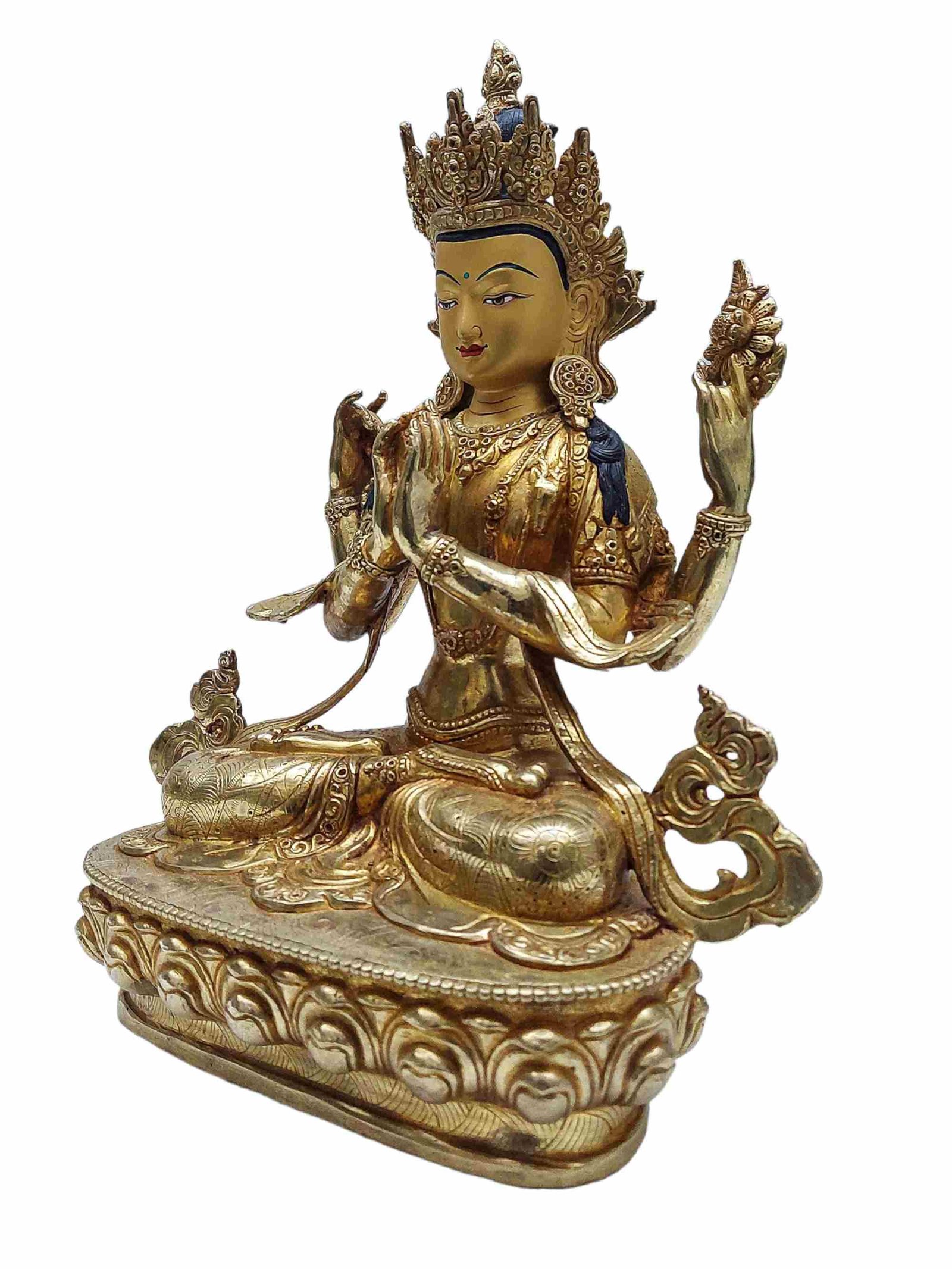 This Chenrezig is finished with full gold plating. also known as mercury gold plating or fire gold plating. This traditional technique involves the application of a genuine layer of gold onto the Chenrezig. Referred to as mercury gold plating, it is considered the correct and authentic form of gold plating in Nepal. Despite being more expensive than electroplating, this traditional mercury gold plating is gaining popularity again in Nepal. People are drawn to its authenticity, longevity, and the unmatched beauty it brings to the Chenrezig. The resurgence of interest in this traditional form of gold plating reflects a growing appreciation for the craftsmanship and cultural heritage of Nepal Read More