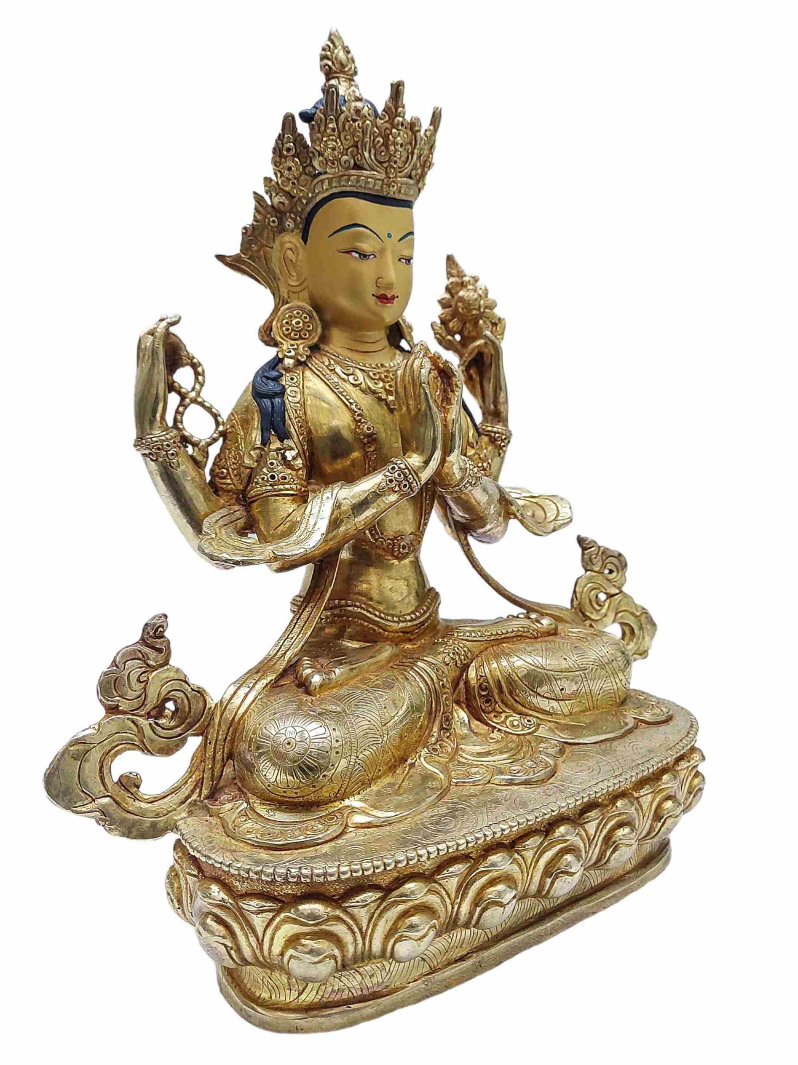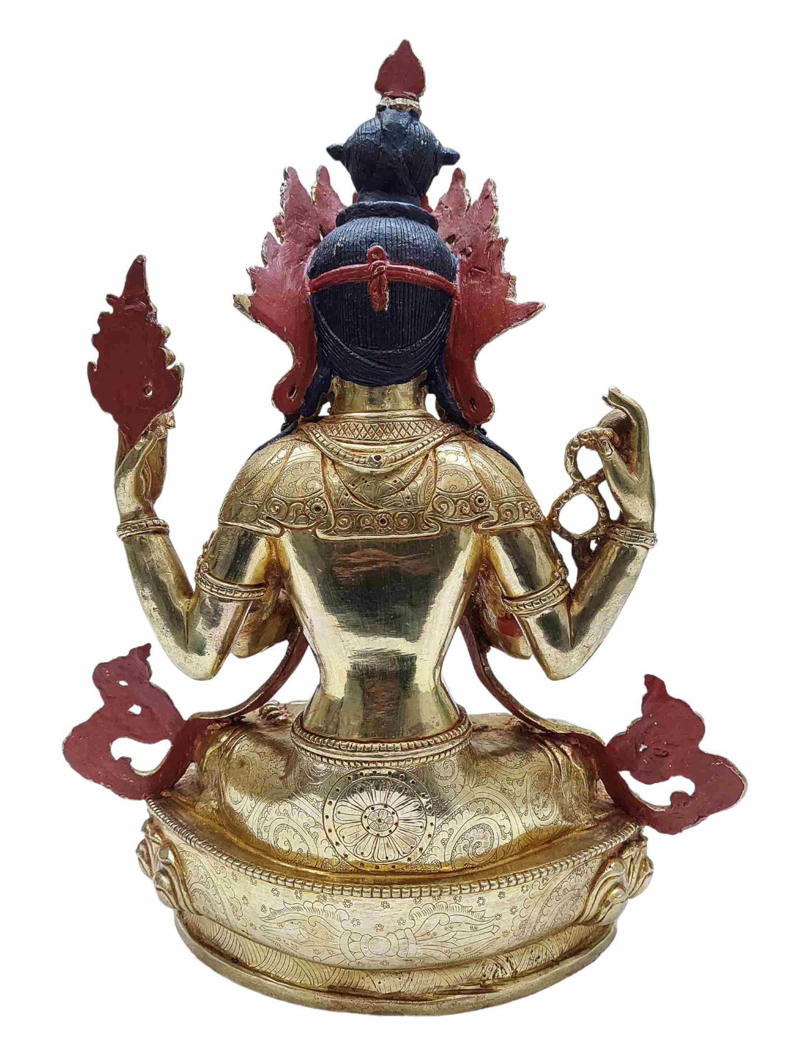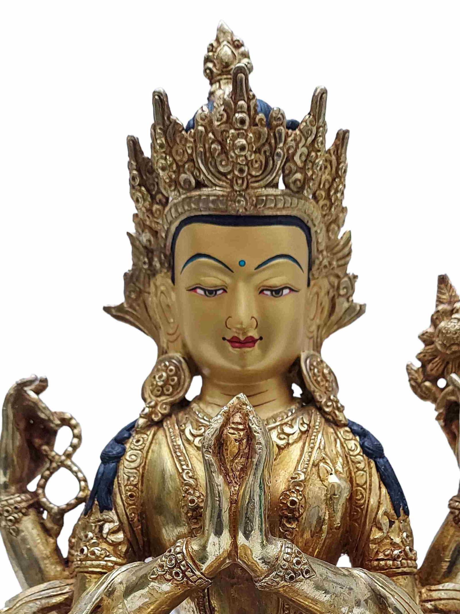 Buddhist Handmade Statue of Chenrezig, Full Fire Gold Plated with Painted Face , Bodhisattva of Compassion, Protector of All Beings