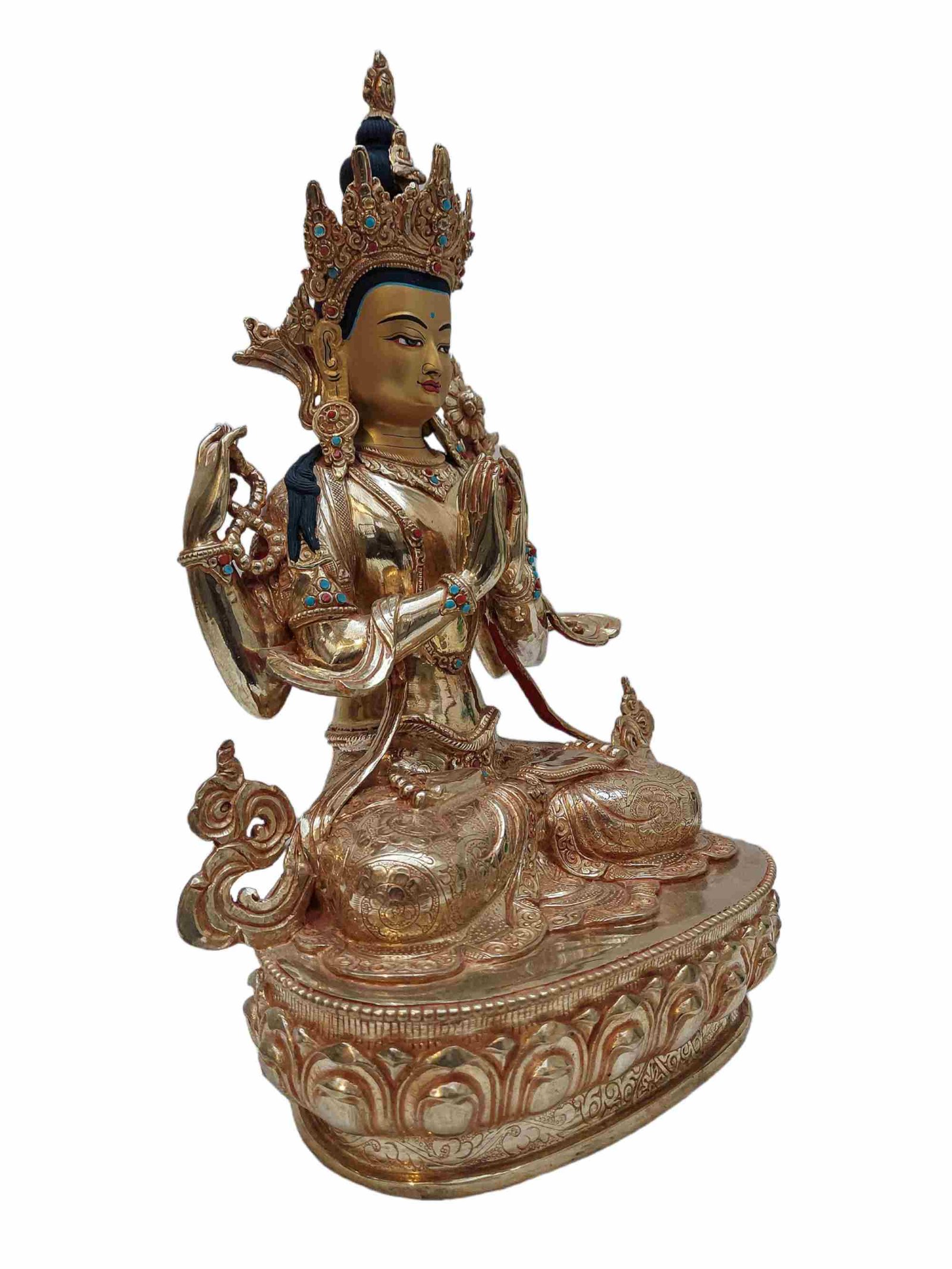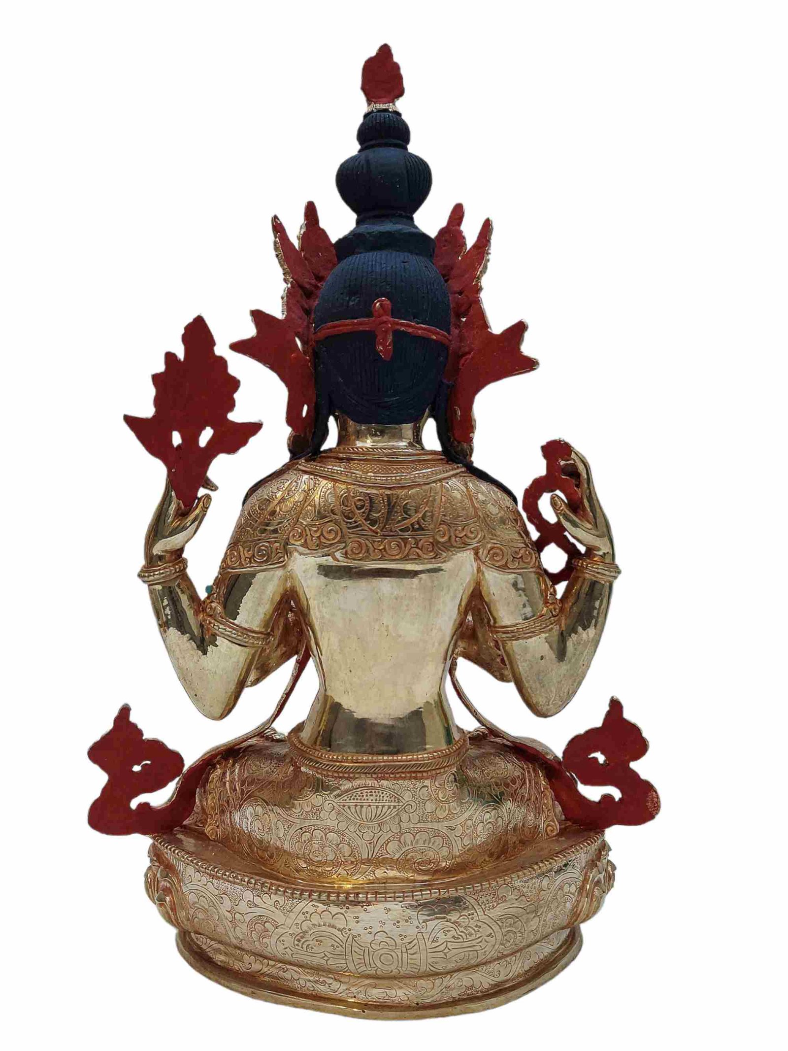 This Chenrezig is finished with full gold plating. also known as mercury gold plating or fire gold plating. This traditional technique involves the application of a genuine layer of gold onto the Chenrezig. Referred to as mercury gold plating, it is considered the correct and authentic form of gold plating in Nepal. Despite being more expensive than electroplating, this traditional mercury gold plating is gaining popularity again in Nepal. People are drawn to its authenticity, longevity, and the unmatched beauty it brings to the Chenrezig. The resurgence of interest in this traditional form of gold plating reflects a growing appreciation for the craftsmanship and cultural heritage of Nepal Read More