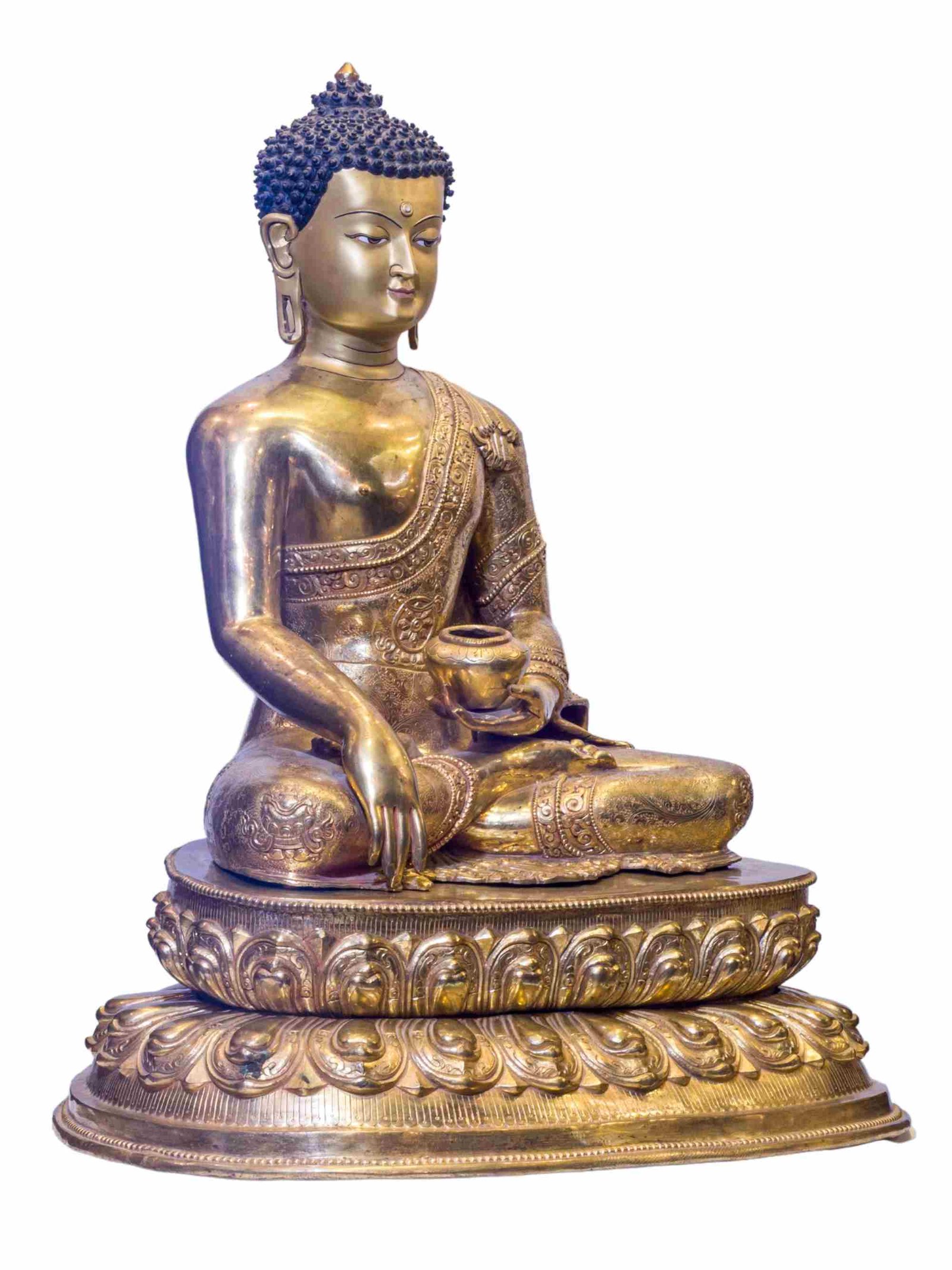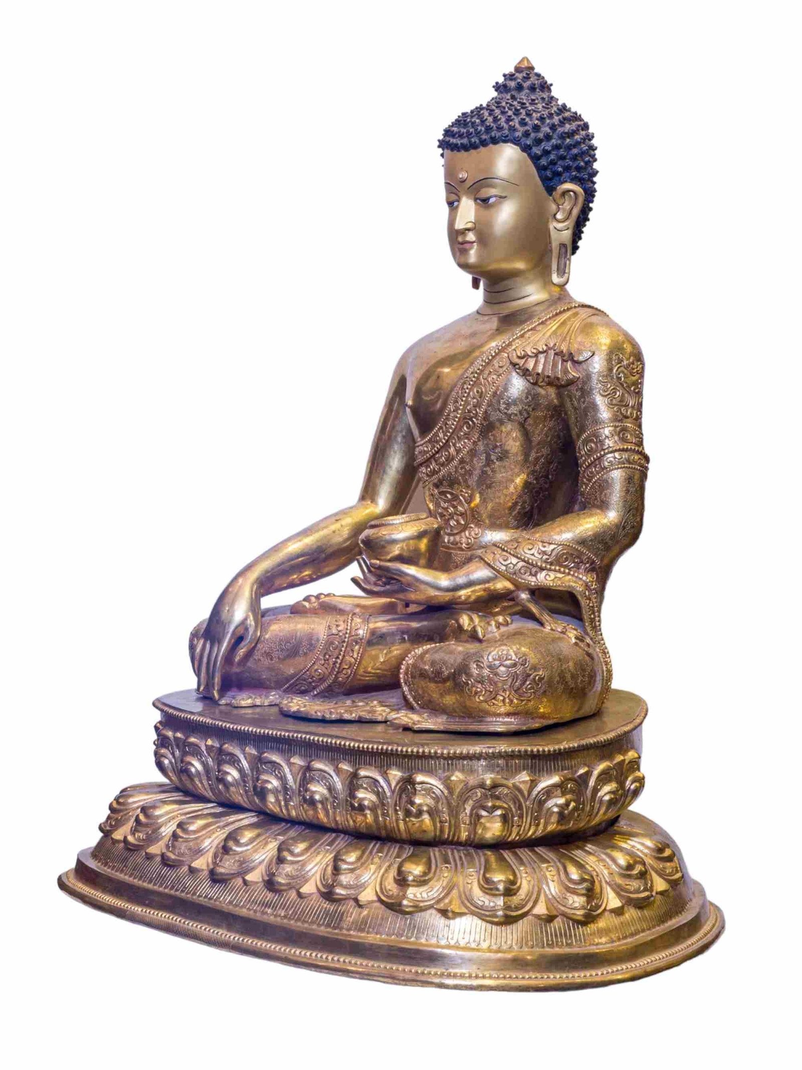 The Shakyamuni Buddha has full gold plated antique finishing. This finishing is a combination of fire mercury gold plating and antique finishing. This traditional technique involves the application of a genuine layer of gold onto the Shakyamuni Buddha using the time-honored process of mercury gold plating. Skilled artisans meticulously handle the amalgamation of gold with mercury, ensuring precise application and a truly authentic result. To enhance its charm further, the Shakyamuni Buddha undergoes an antique finishing process. This meticulous treatment adds a touch of age and character to the gold plating, creating a sense of antiquity. Through careful craftsmanship and the application of specialized techniques, the Shakyamuni Buddha acquires a beautifully aged appearance that adds depth and uniqueness to its overall aesthetic. Read More