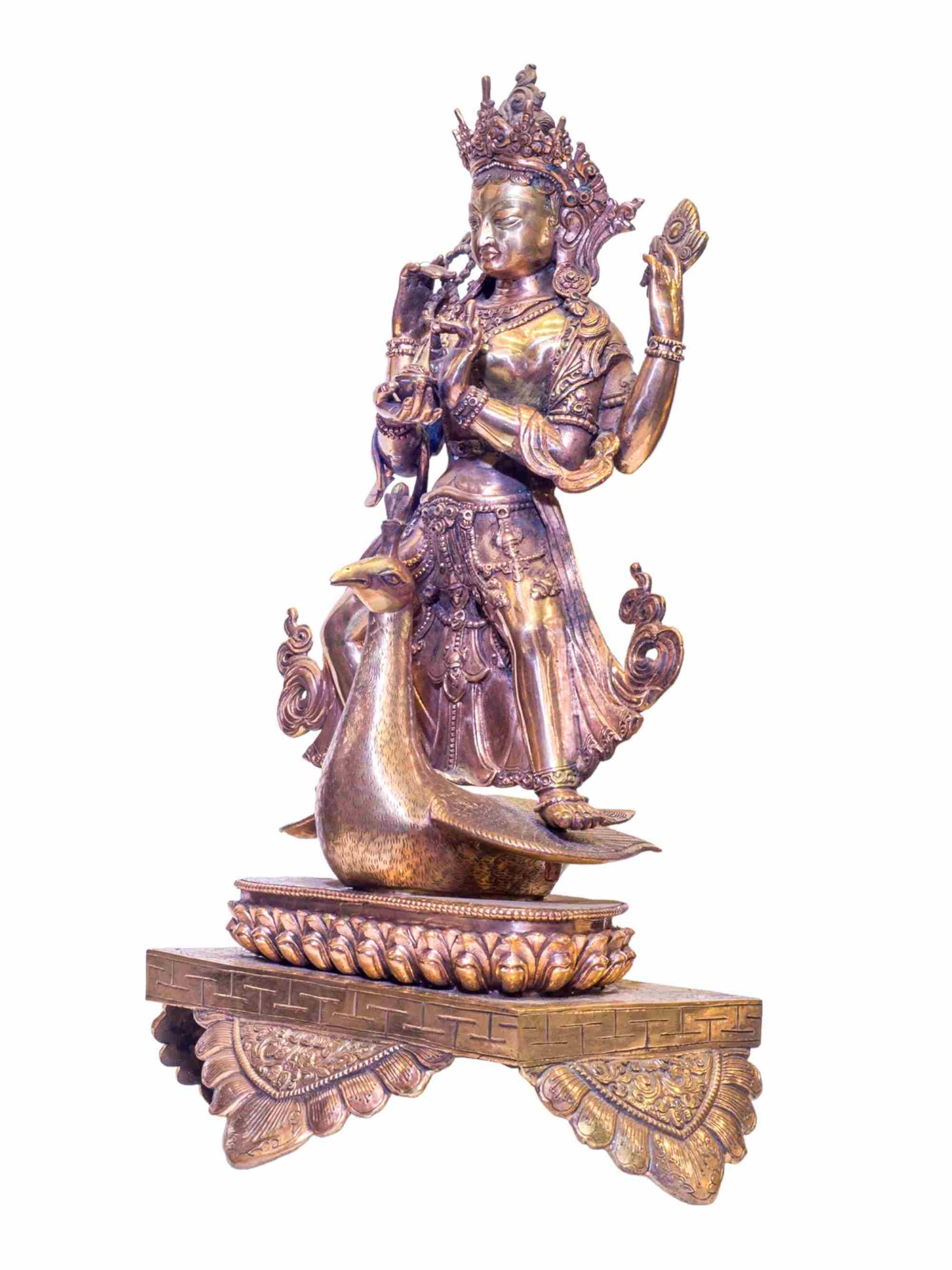 The Bal Kumari has full gold plated antique finishing. This finishing is a combination of fire mercury gold plating and antique finishing. This traditional technique involves the application of a genuine layer of gold onto the Bal Kumari using the time-honored process of mercury gold plating. Skilled artisans meticulously handle the amalgamation of gold with mercury, ensuring precise application and a truly authentic result. To enhance its charm further, the Bal Kumari undergoes an antique finishing process. This meticulous treatment adds a touch of age and character to the gold plating, creating a sense of antiquity. Through careful craftsmanship and the application of specialized techniques, the Bal Kumari acquires a beautifully aged appearance that adds depth and uniqueness to its overall aesthetic. Read More
