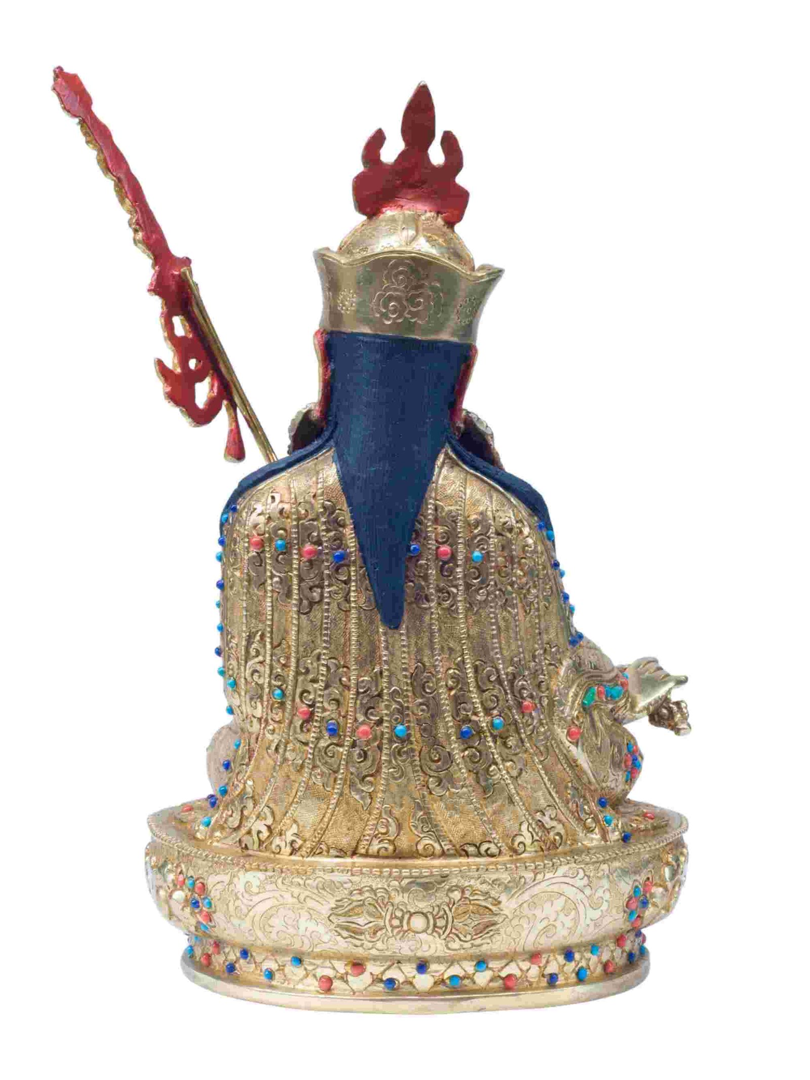 Buddhist Handmade Statue of Padmasambhava Guru Rinpoche, Full Fire Gold Plated, Stone Setting with Painted Face , The lotus-born master, wisdom beyond time