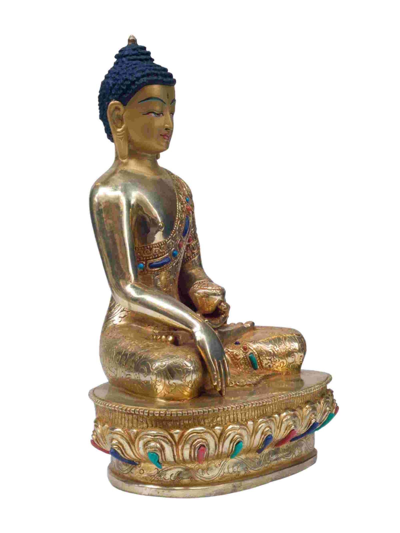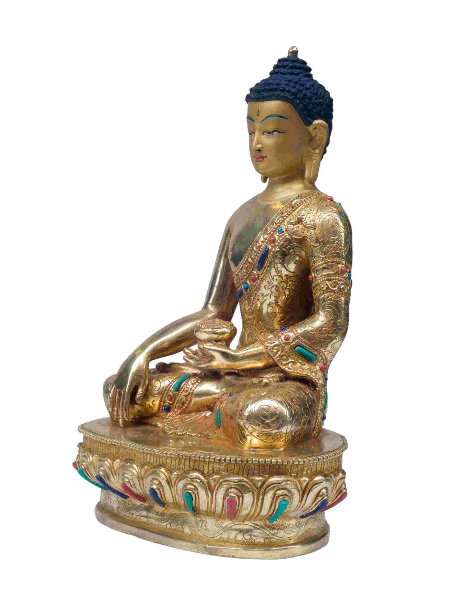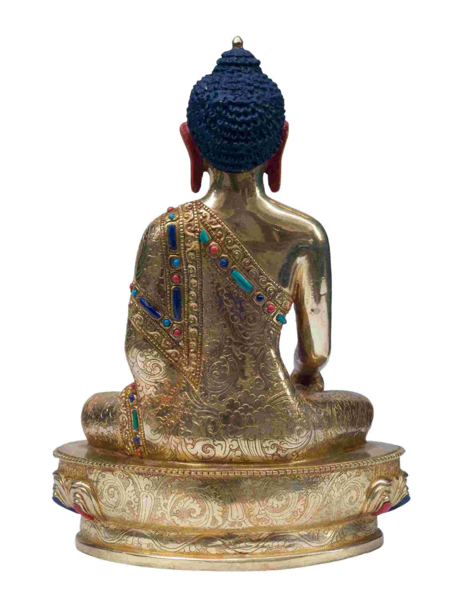 Buddhist Handmade Statue of Shakyamuni Buddha, Full Fire Gold Plated, Stone Setting with Painted Face , The Enlightened One and Teacher of Humanity