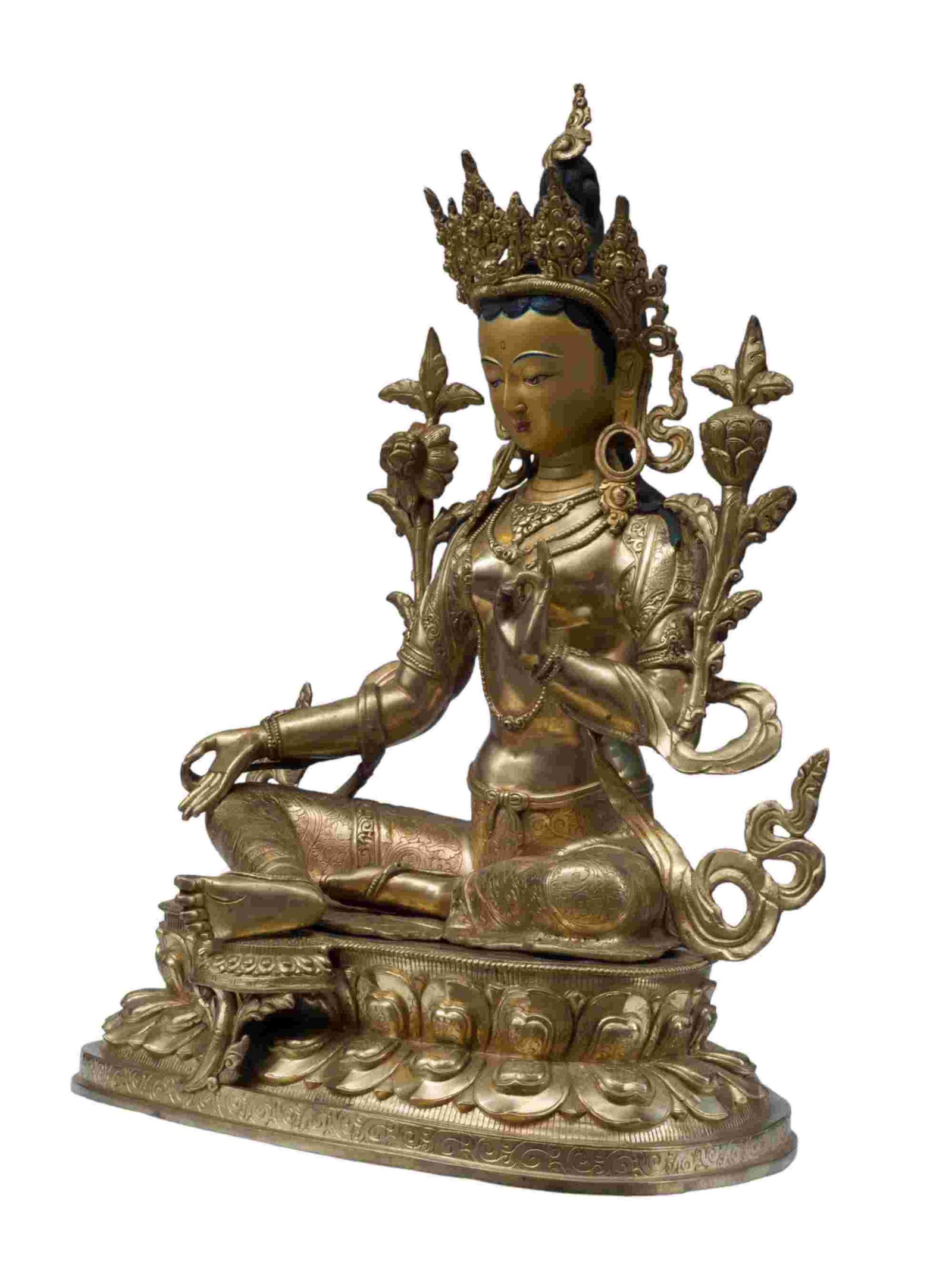 This Green Tara is finished with full gold plating. also known as mercury gold plating or fire gold plating. This traditional technique involves the application of a genuine layer of gold onto the Green Tara. Referred to as mercury gold plating, it is considered the correct and authentic form of gold plating in Nepal. Despite being more expensive than electroplating, this traditional mercury gold plating is gaining popularity again in Nepal. People are drawn to its authenticity, longevity, and the unmatched beauty it brings to the Green Tara. The resurgence of interest in this traditional form of gold plating reflects a growing appreciation for the craftsmanship and cultural heritage of Nepal Read More